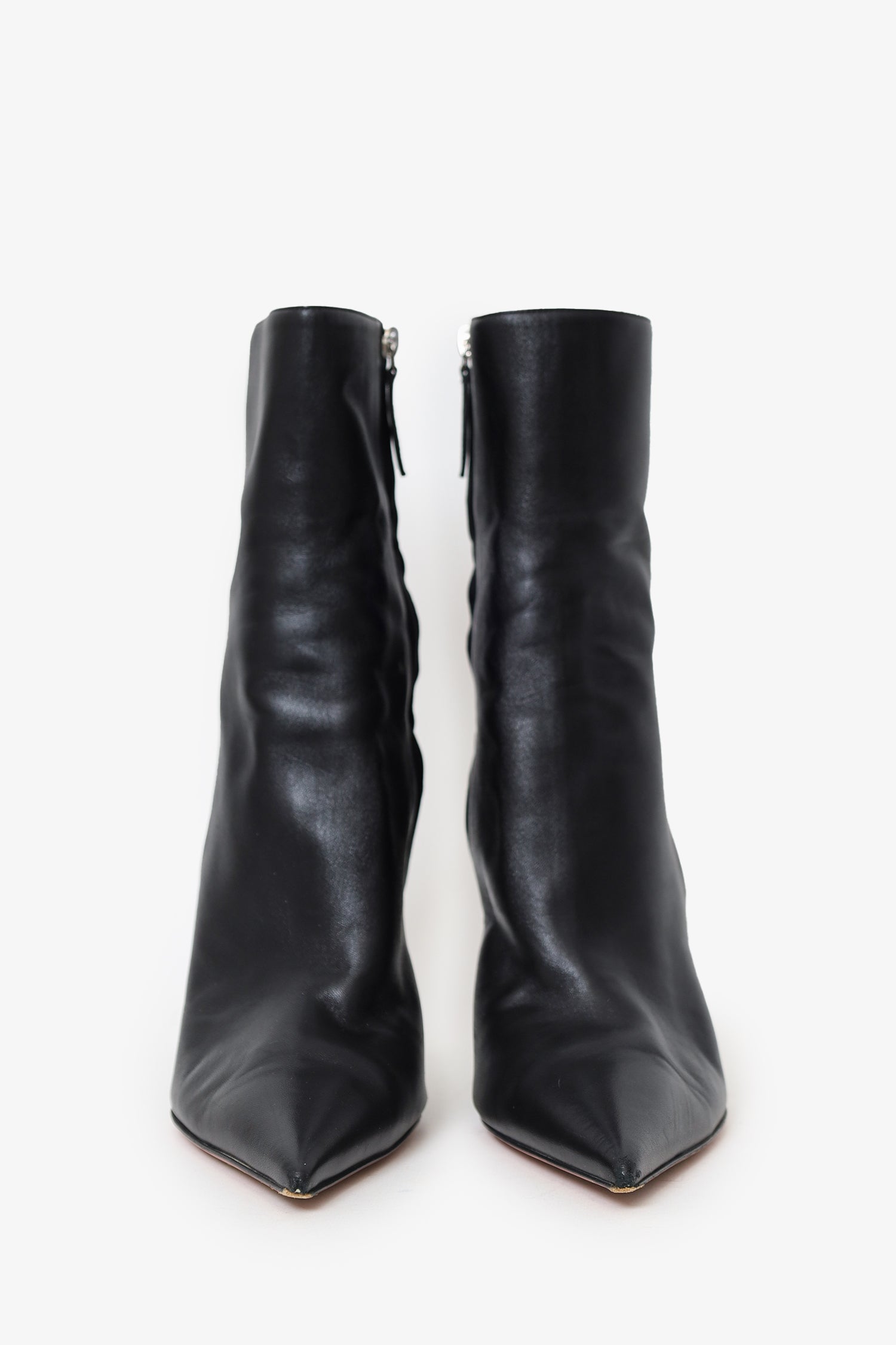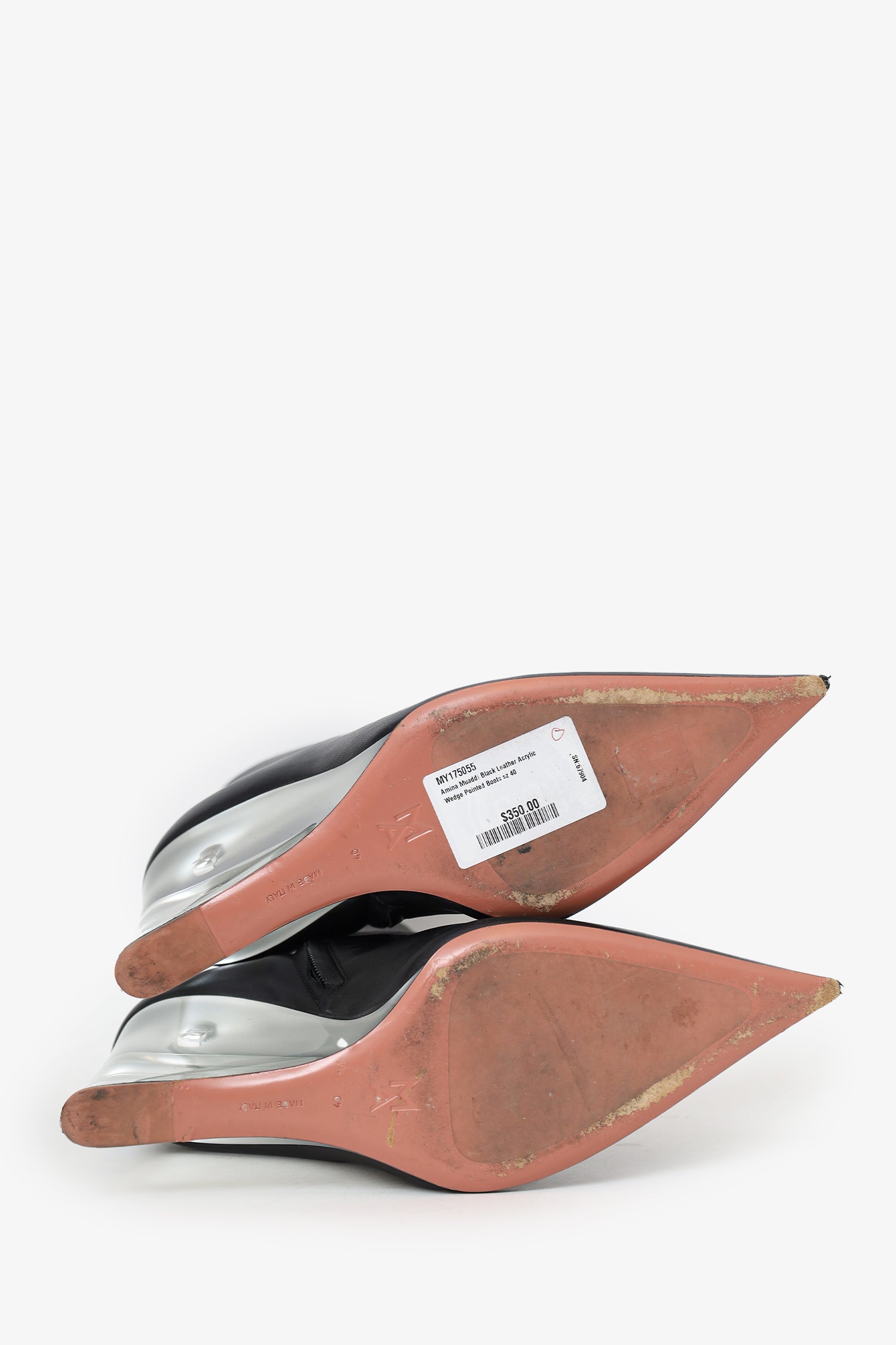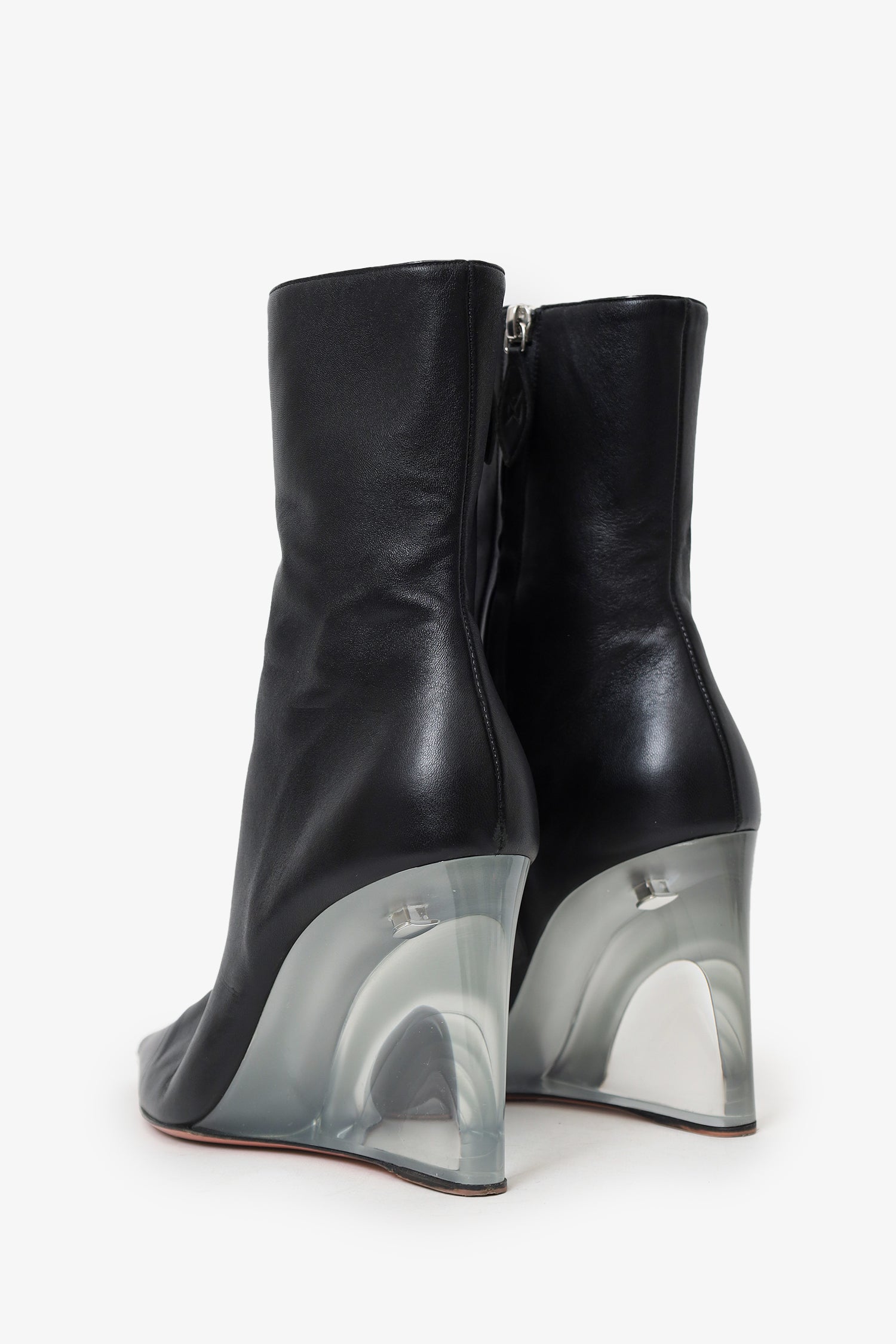 Refresh availabilityAmina Muaddi Black Leather Acrylic Wedge Pointed Boots. Pull-on. Pointed-toe. Side zip closure. Silver-tone hardware. Tonal stitching.