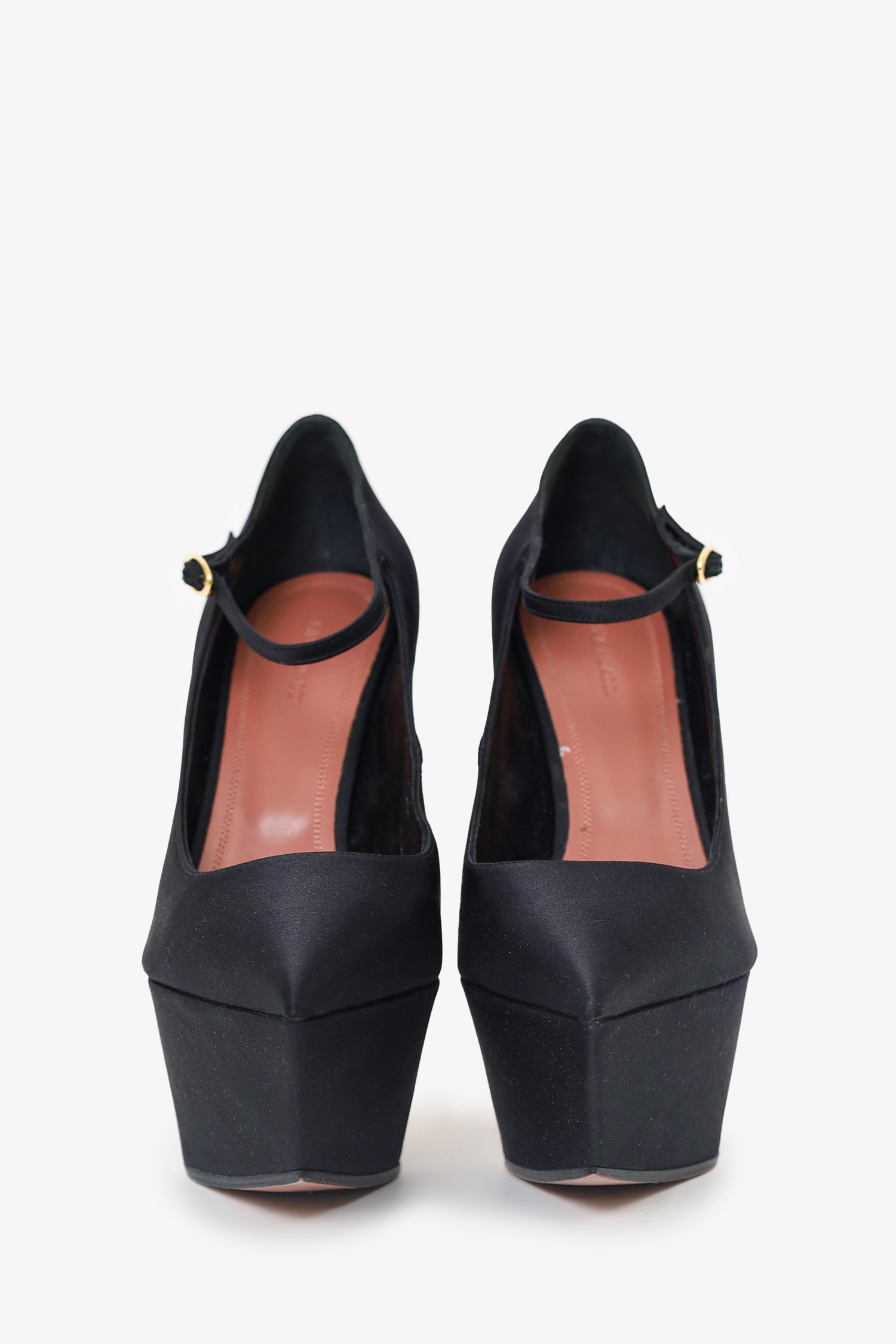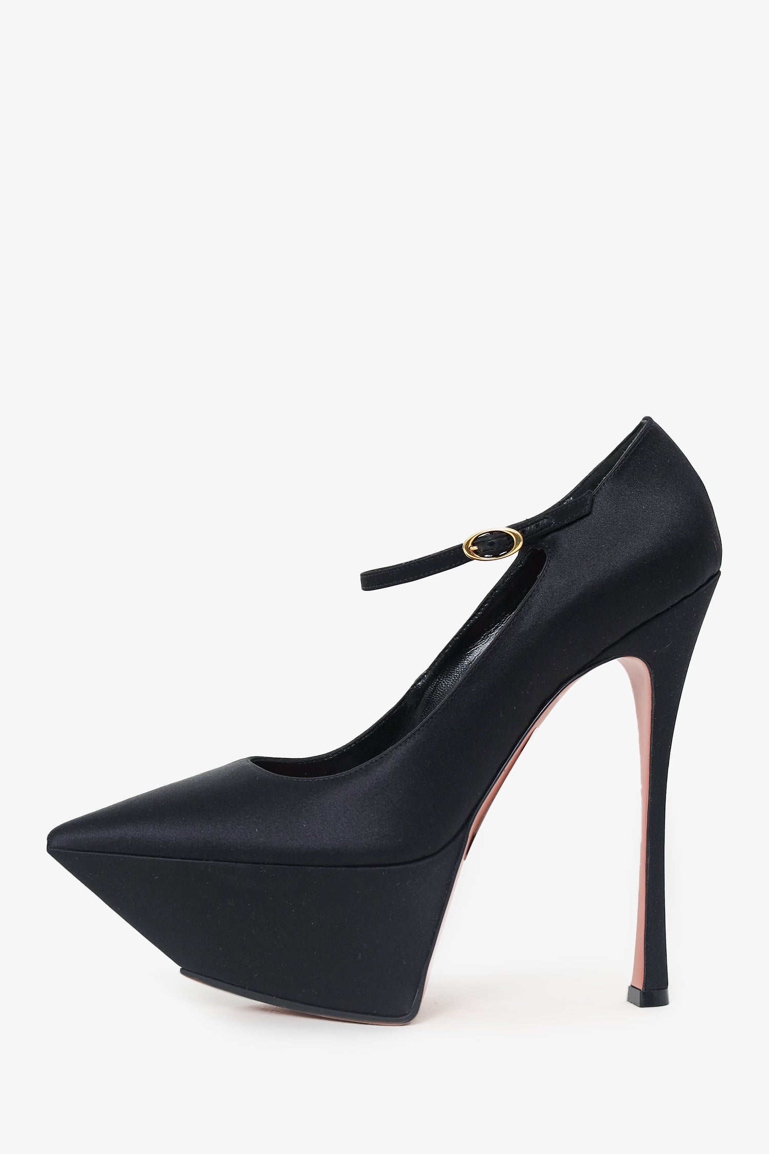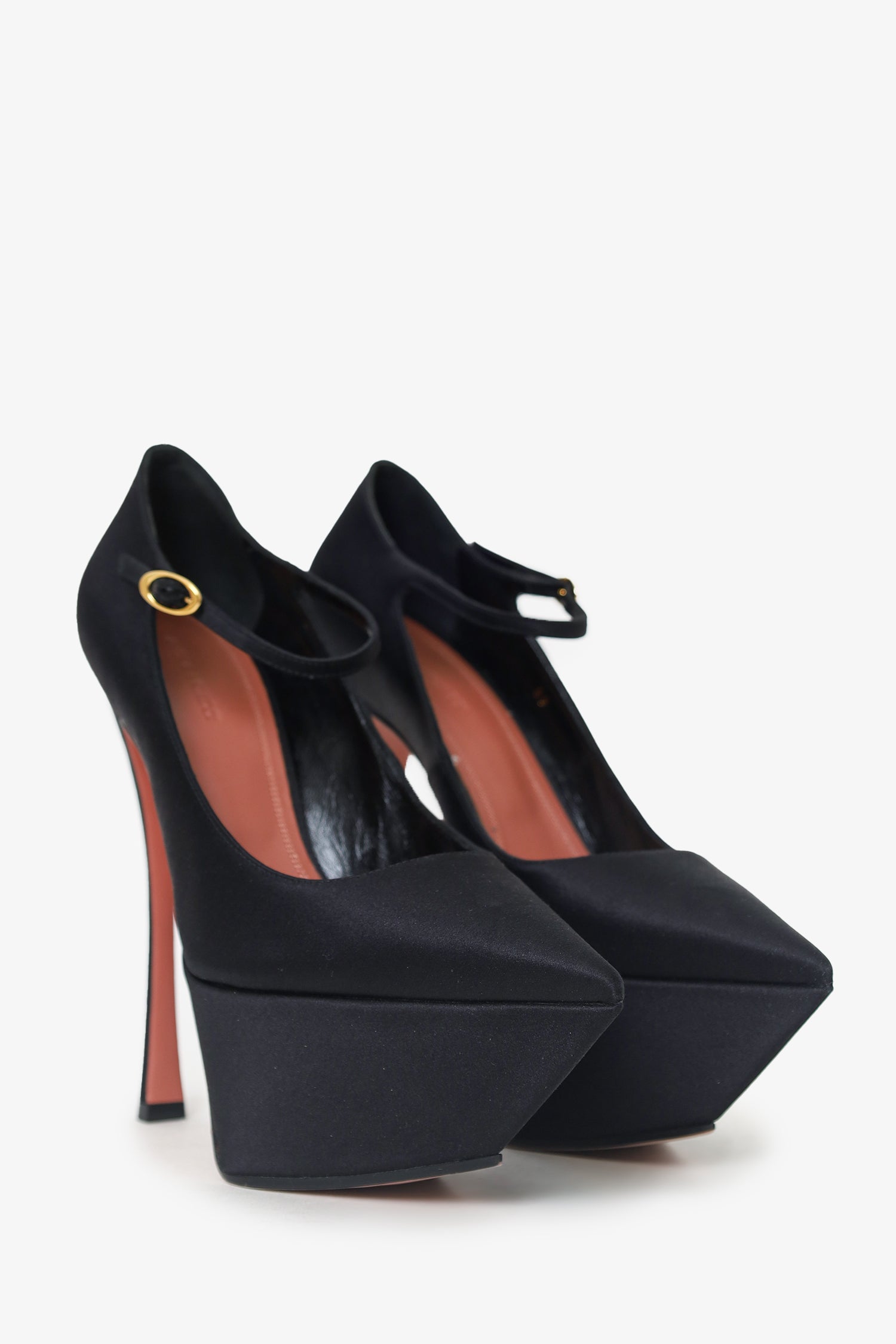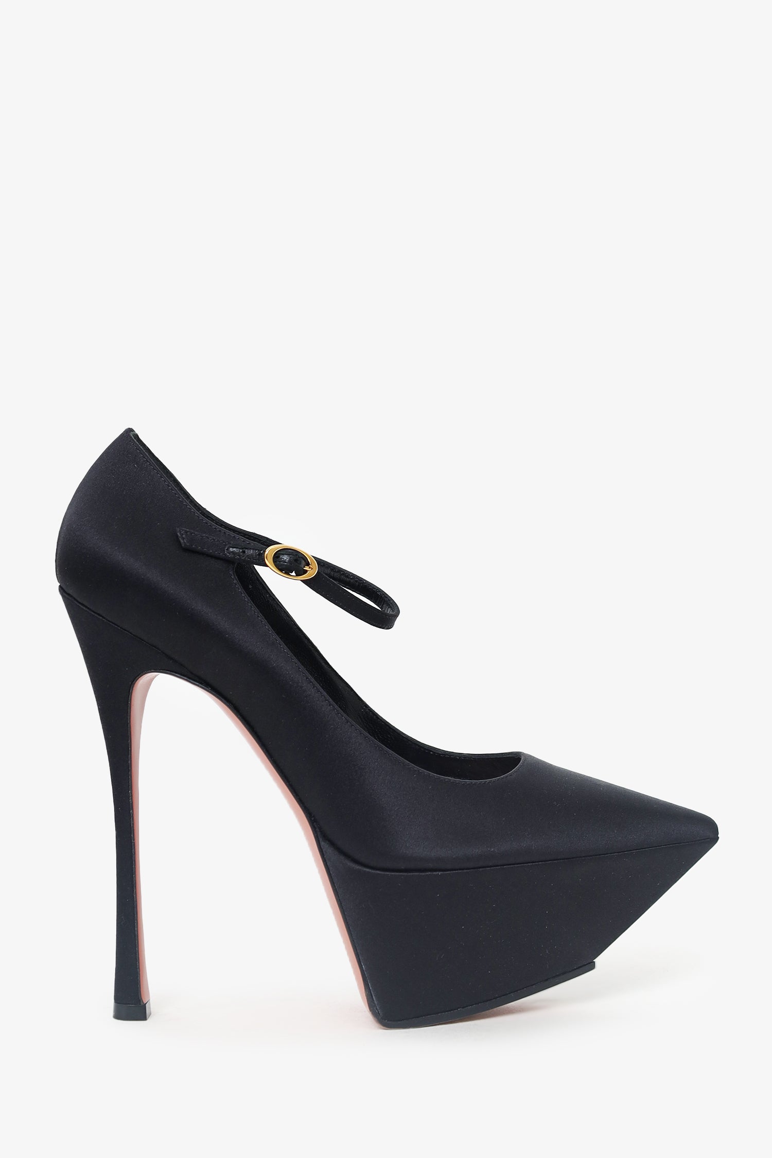 Refresh availabilityAmina Muaddi Black Satin Yigit 150mm Platform Pumps. Slip-on. Pointed toe. Ankle strap with adjustable buckle closure. Gold-tone hardware. Tonal stitching.