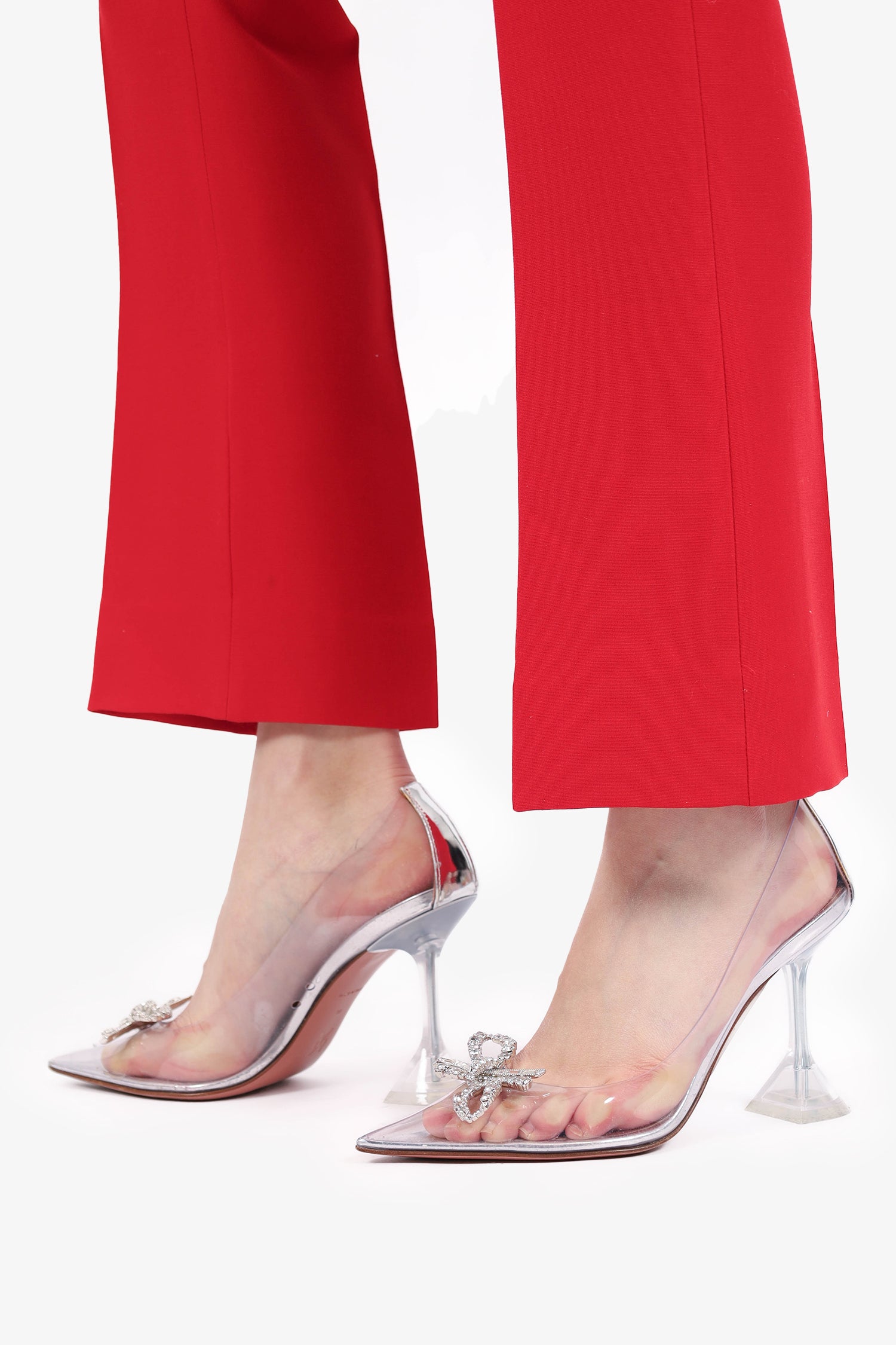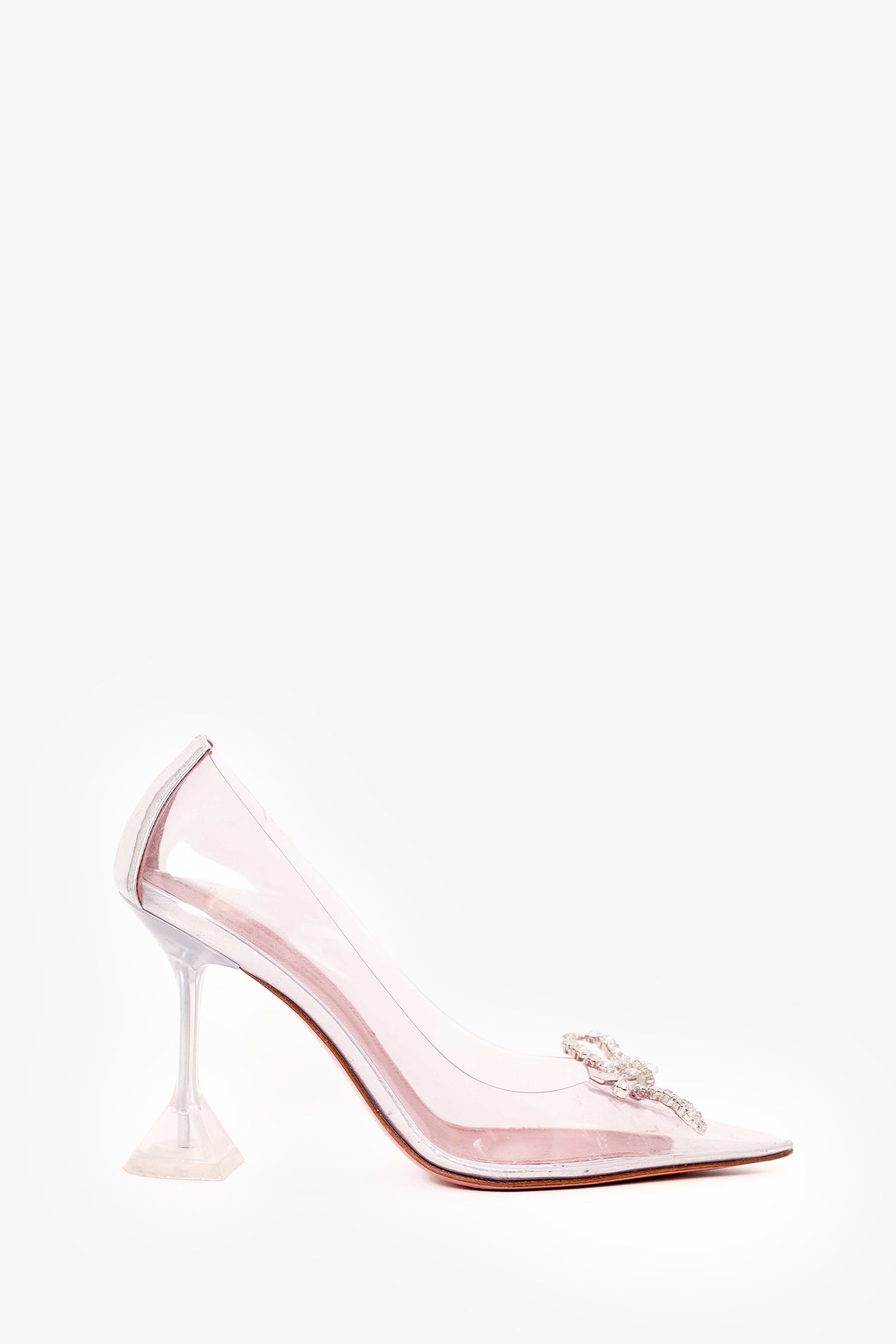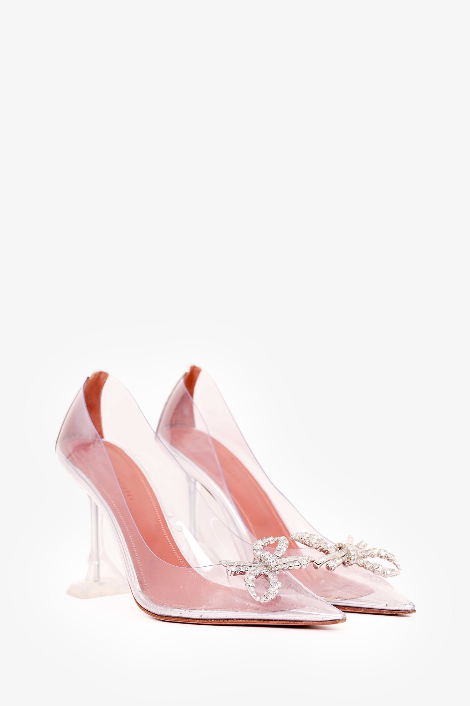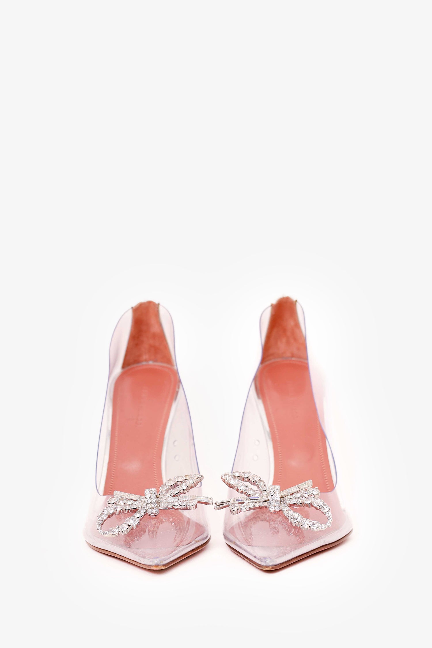 Refresh availabilityAmina Muaddi Silver/PVC Bow Crystal Heels. Slip on. Pointed toe. Silver-tone hardware. Tonal stitching.