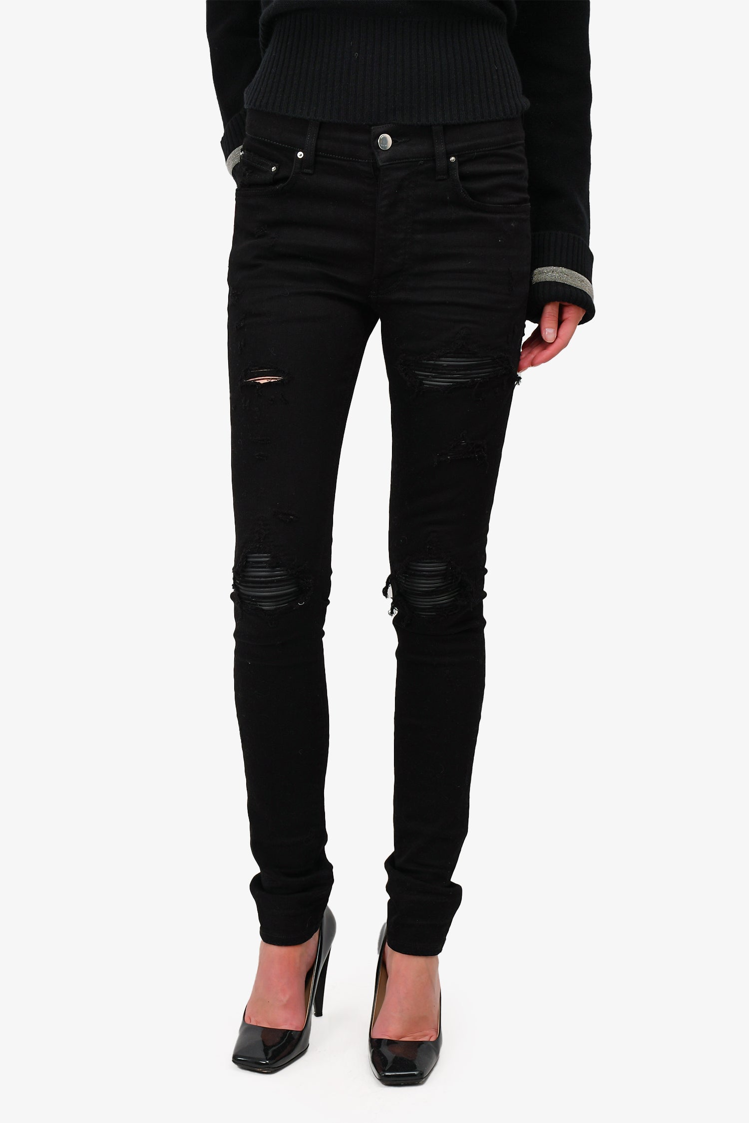 Refresh availabilityAmiri Black Denim Distressed Leather Patch Skinny Jeans. Distressed throughout. Five-pocket design. Silver-tone hardware. Tonal stitching.