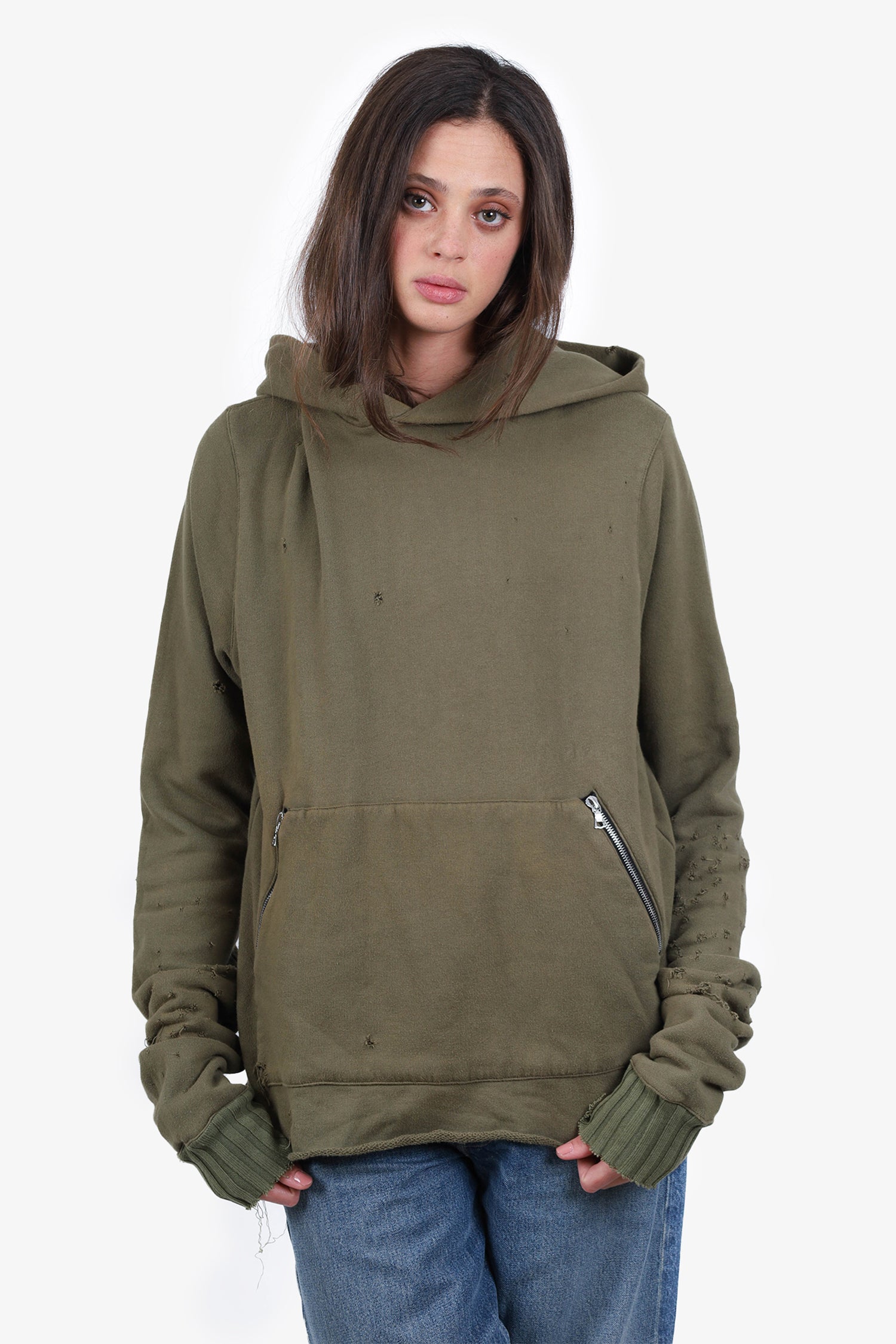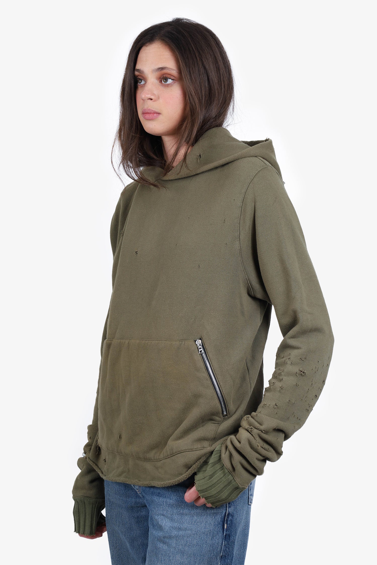 Refresh availabilityAmiri Green Shotgun Distressed Hoodie. Hooded neckline. Front pocket with zip closure. Ribbed cuffs. Tonal stitching. Intentional distressing.