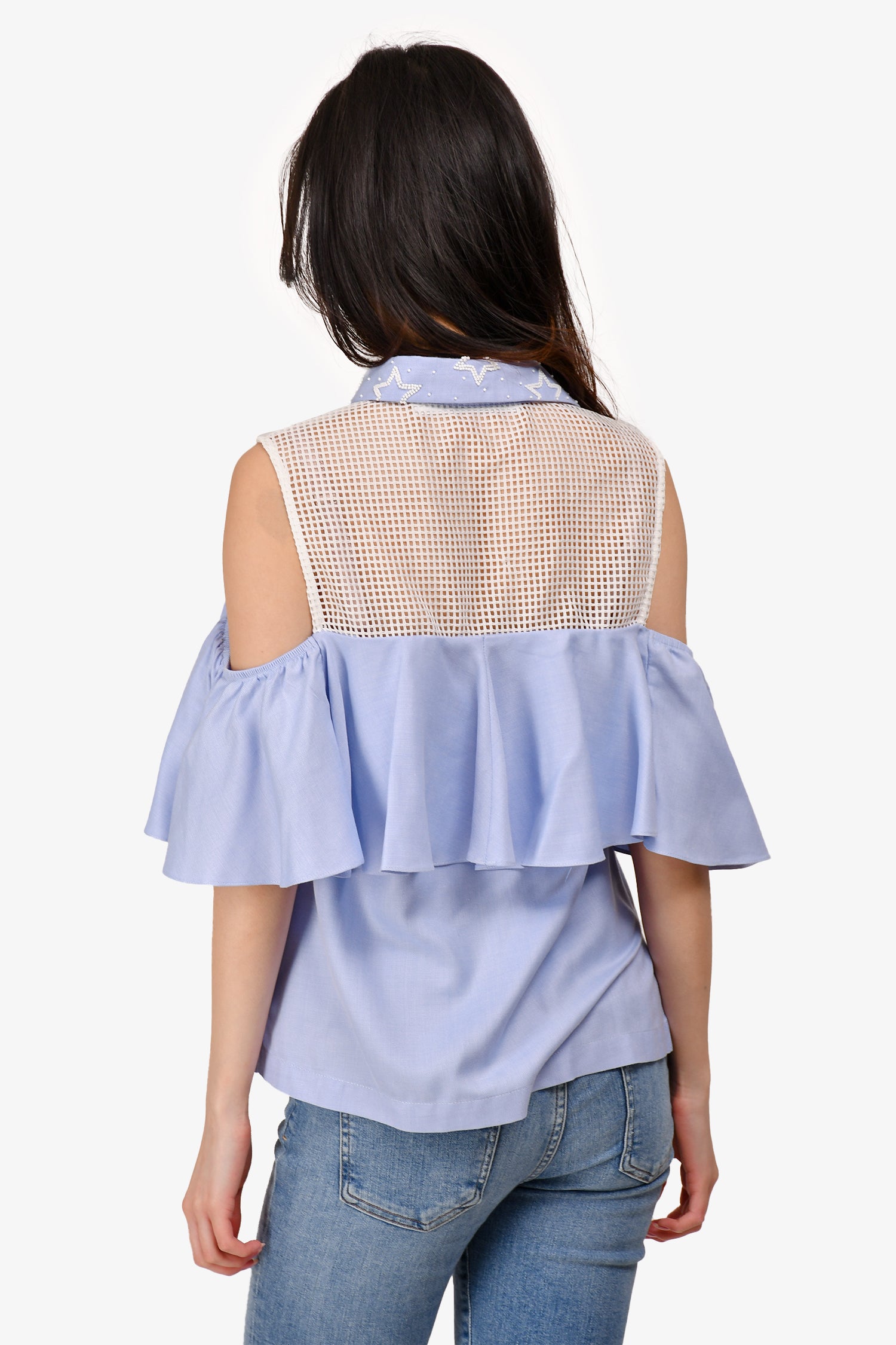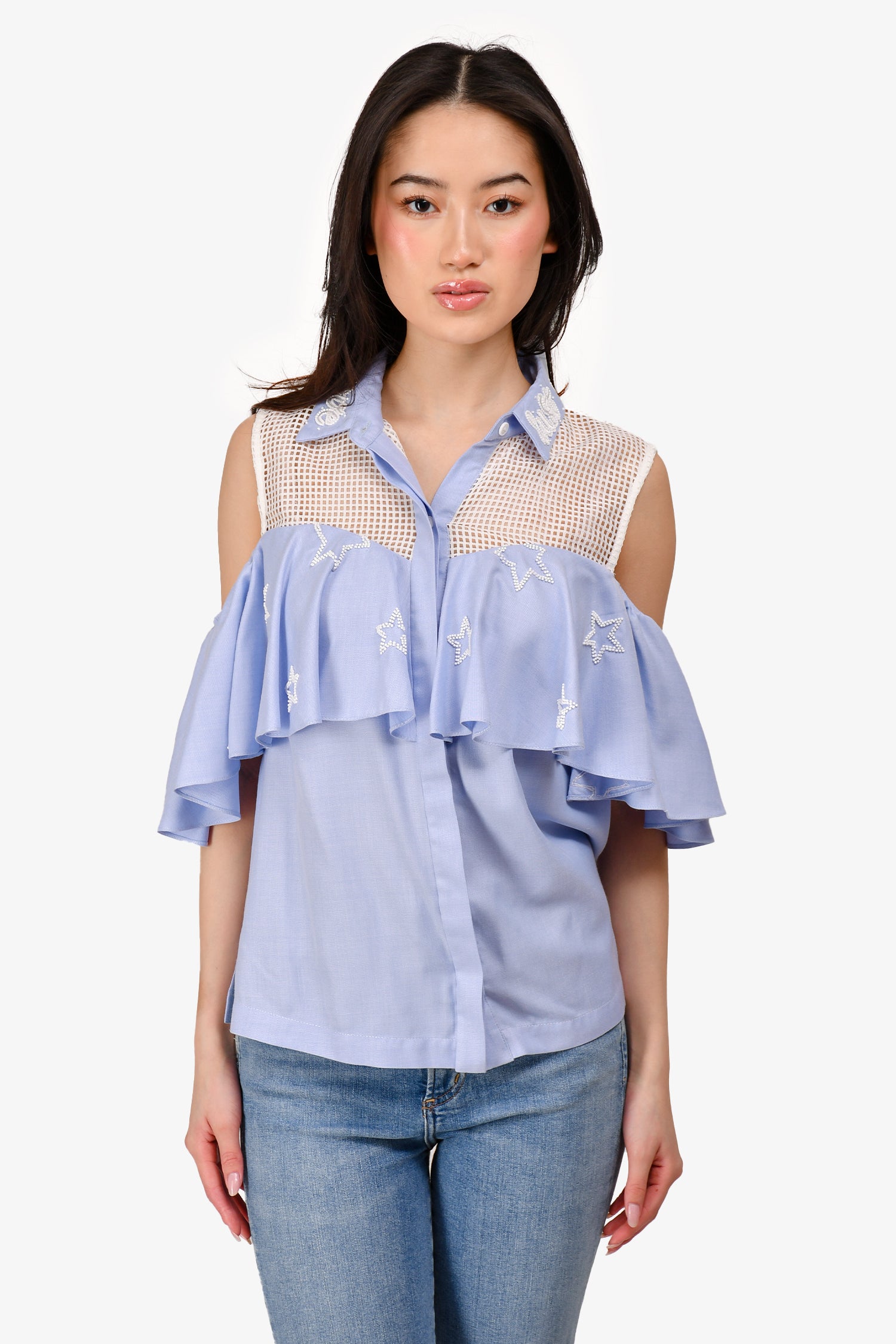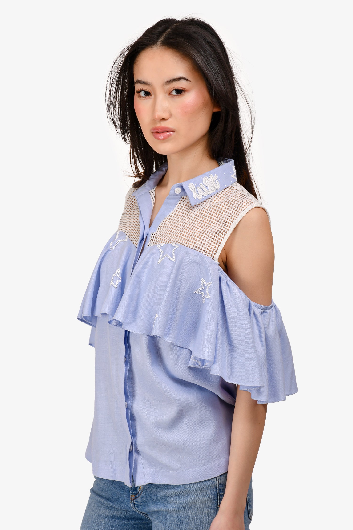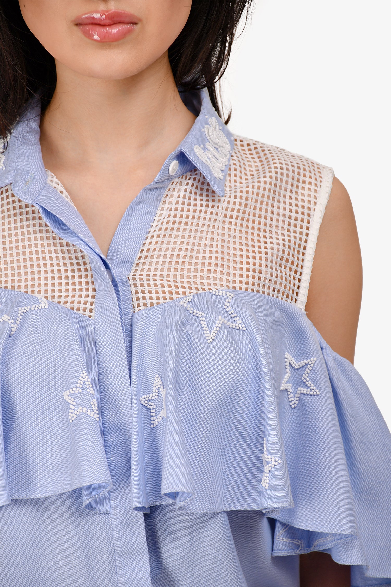 Refresh availabilityAnhha Sleeveless Blue/White Perforated Sleeveless Star Cold Shoulder Top. Eyelet upper detail. 'Love' and 'lust' embroidery on the collar. Concealed front button placket. Tonal stitching.