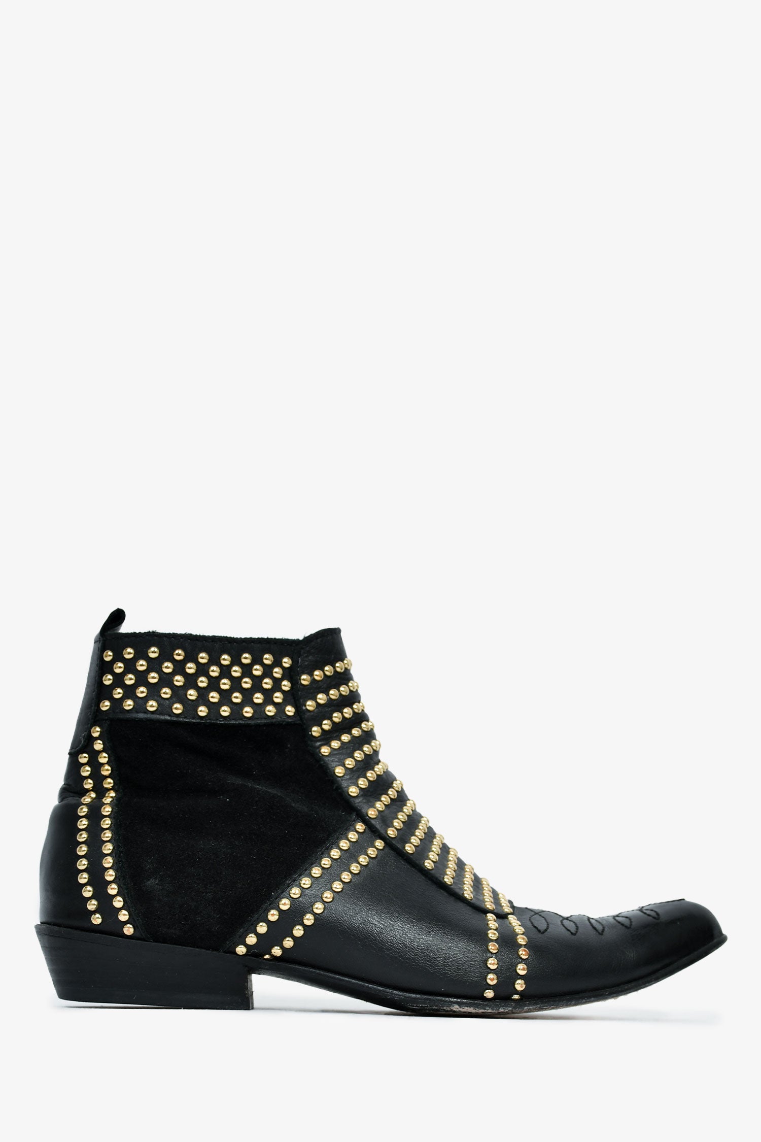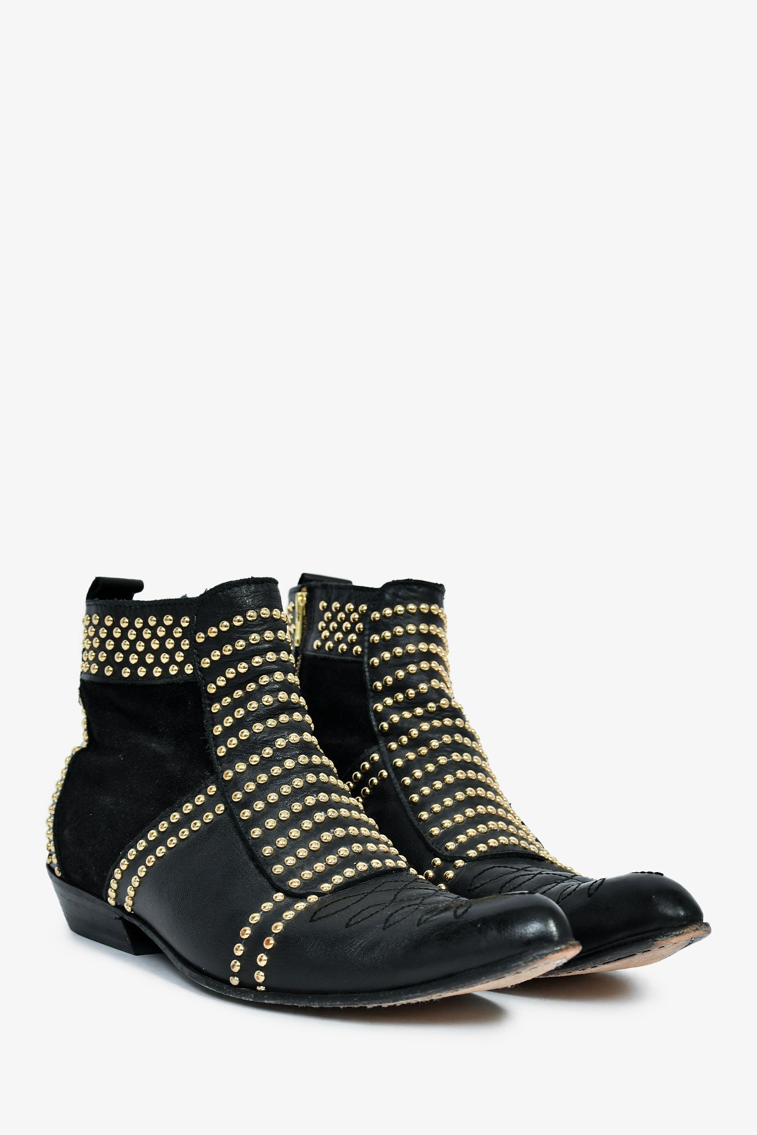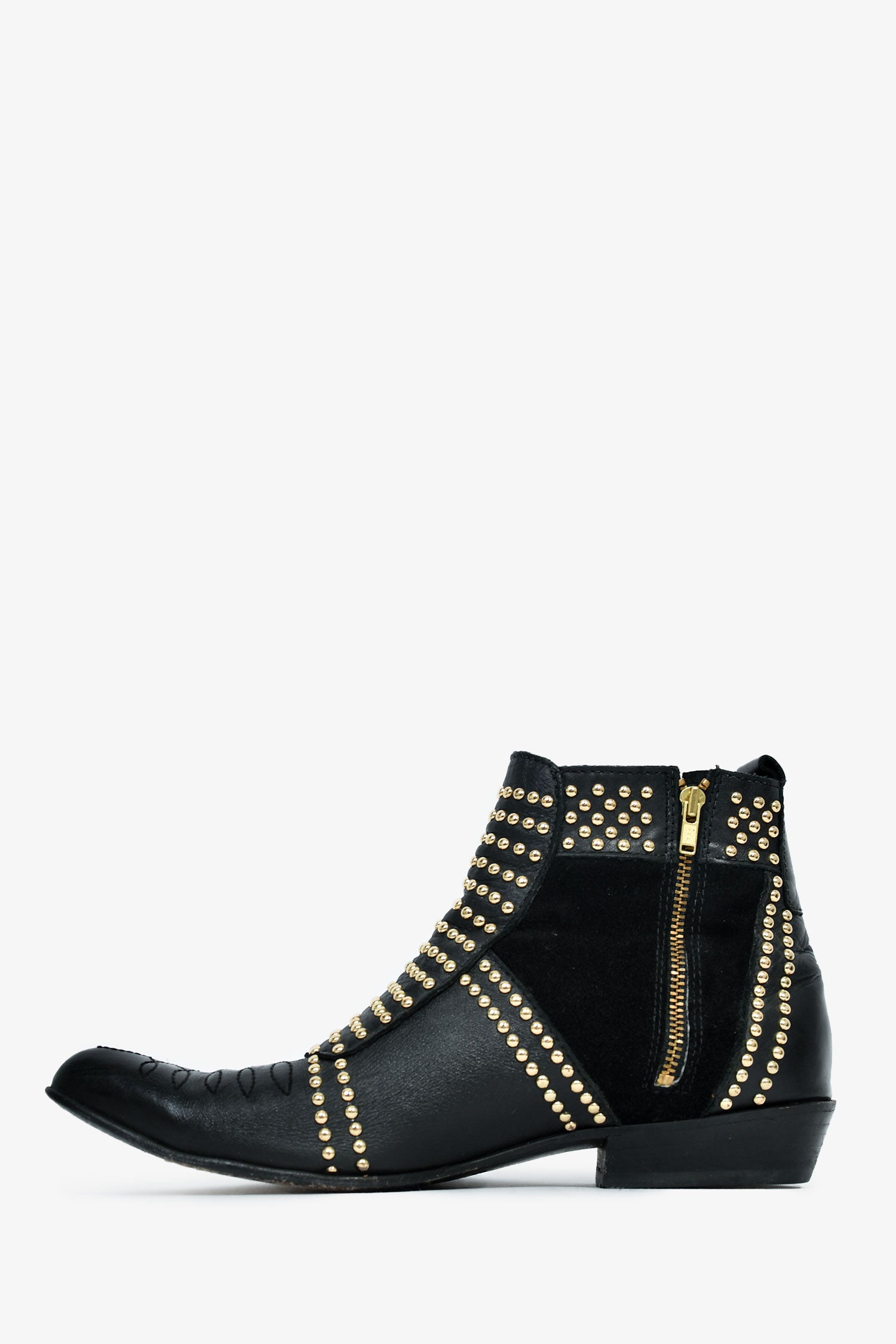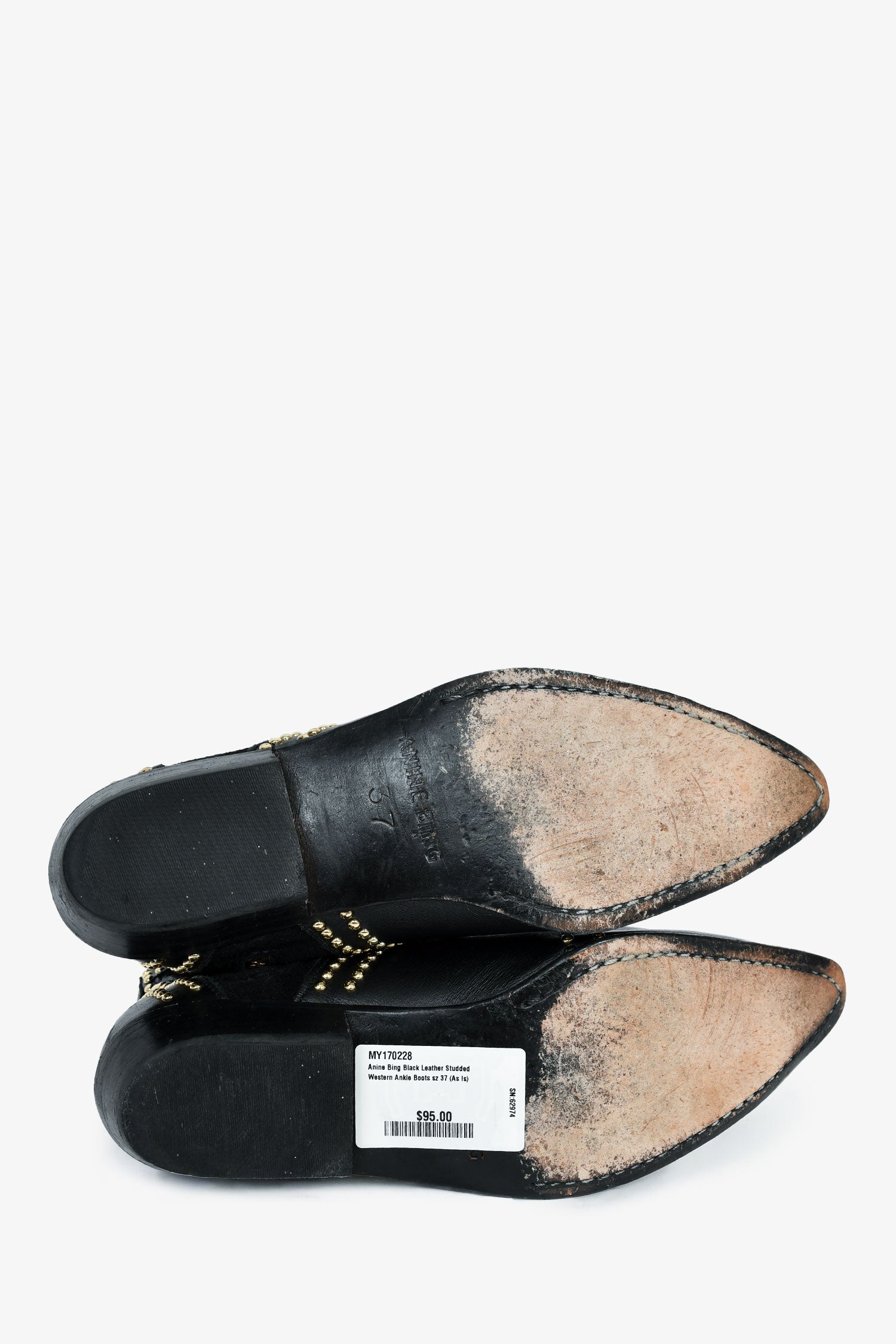 Refresh availabilityAnine Bing Black Leather Studded Western Ankle Boots. Pull-on. Side zip closure. Pointed toe.