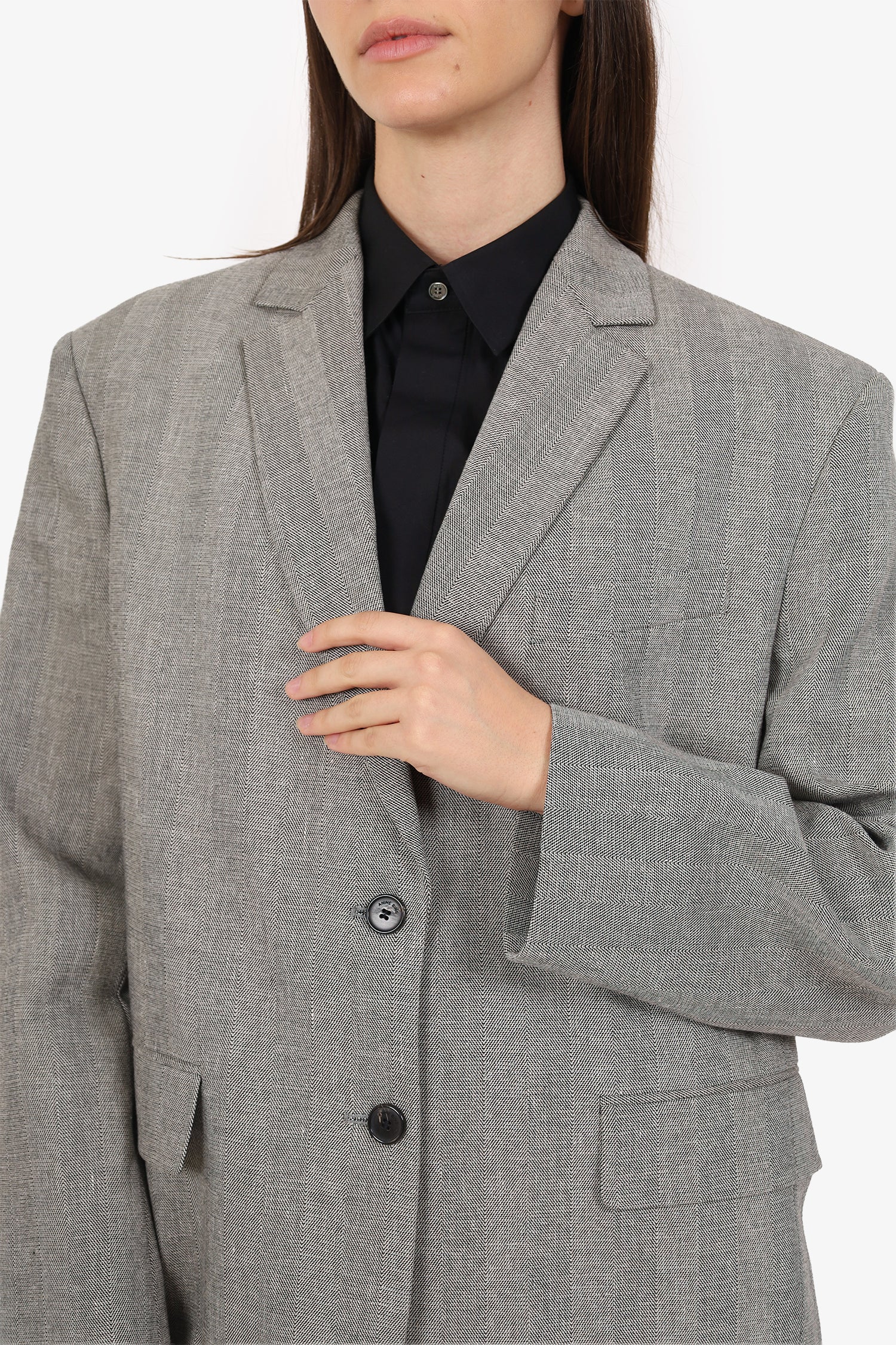 Refresh availabilityAnine Bing Black/White Herringbone Blazer. Pull-on. Notch lapel. Front button-up closure. Padding to shoulders. 3 exterior pockets; 1 chest slip, and 2 front-fold-over-flap pockets. Lined interior with single slip pocket. Tonal stitching.