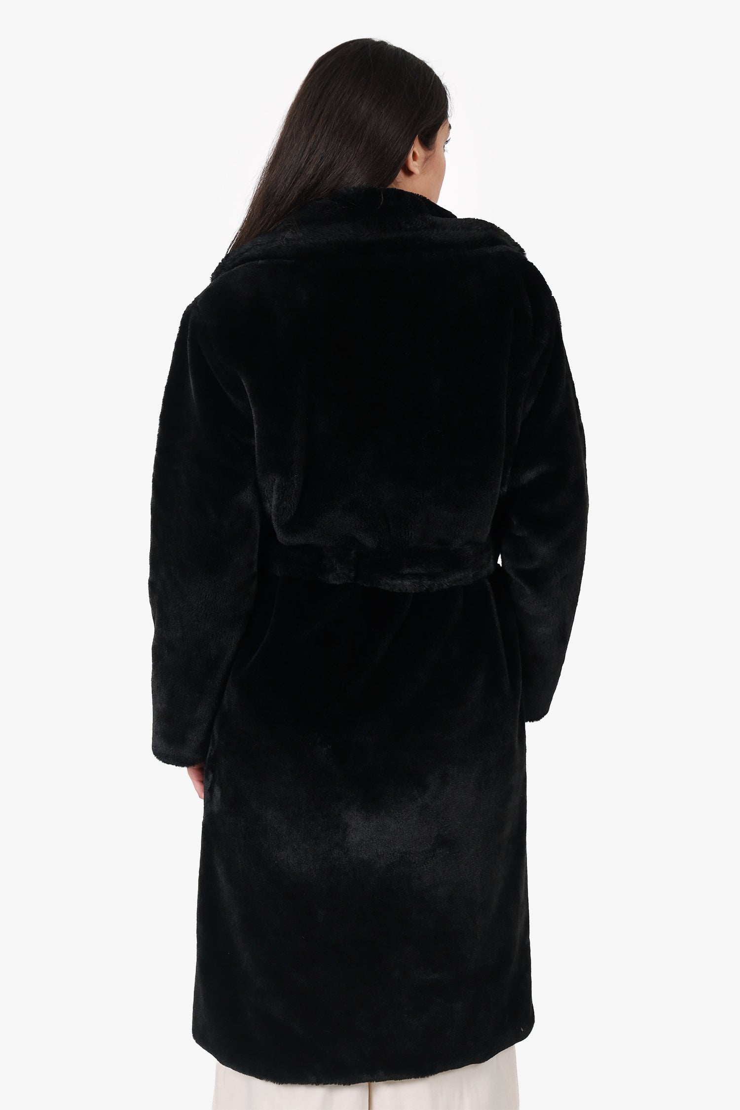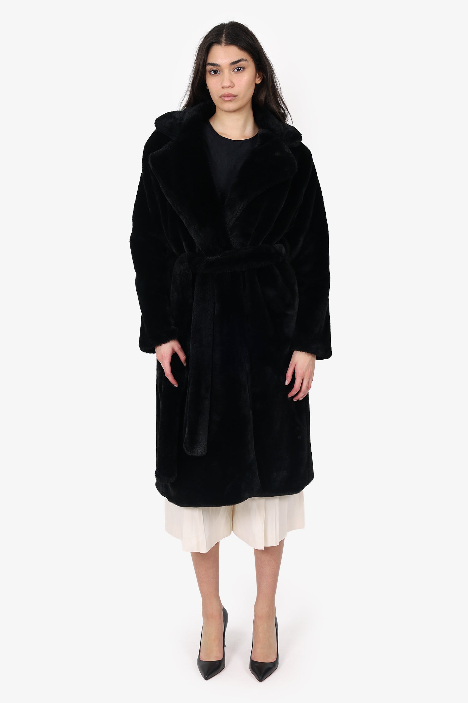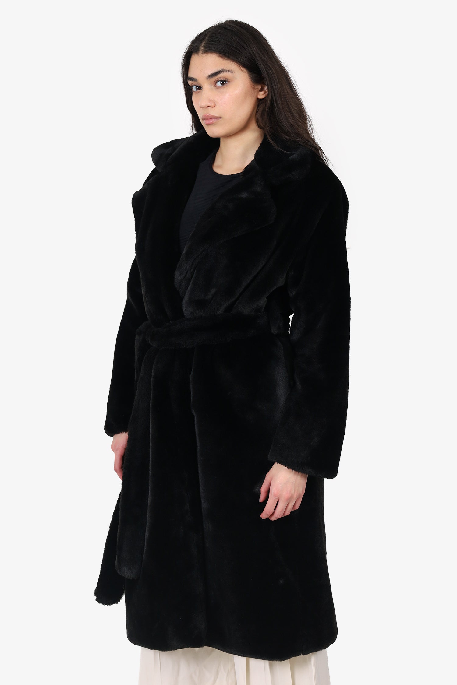 Refresh availabilityApparis Black Faux Fur Coat. Slip-on. Collared neckline. Waistline tie closure. Lined interior. Tonal stitching.