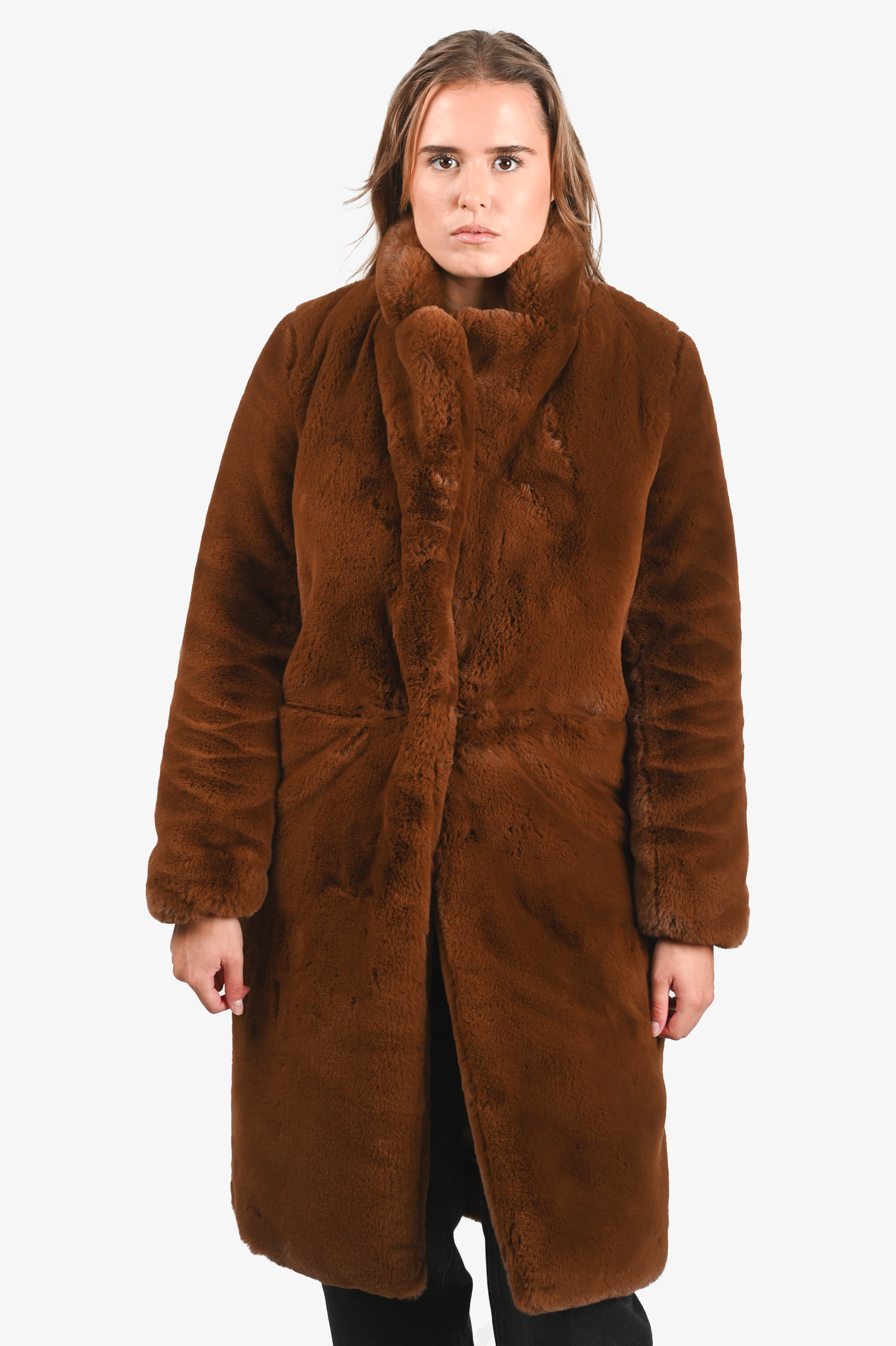 Refresh availabilityApparis Brown Faux Fur Coat. Front hook-up closure. Lined. Tonal stitching. Front pockets.