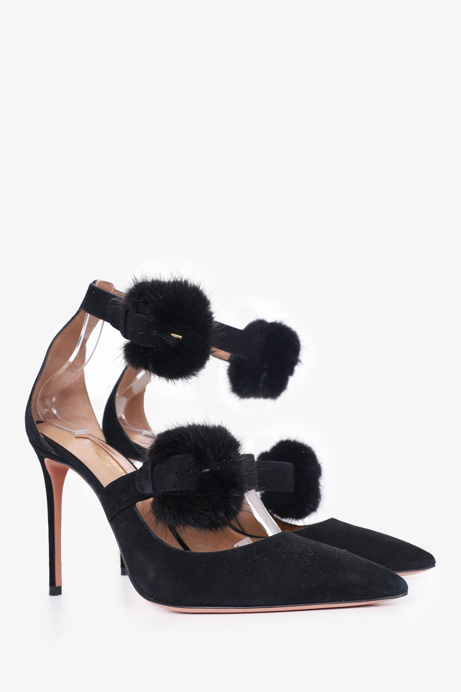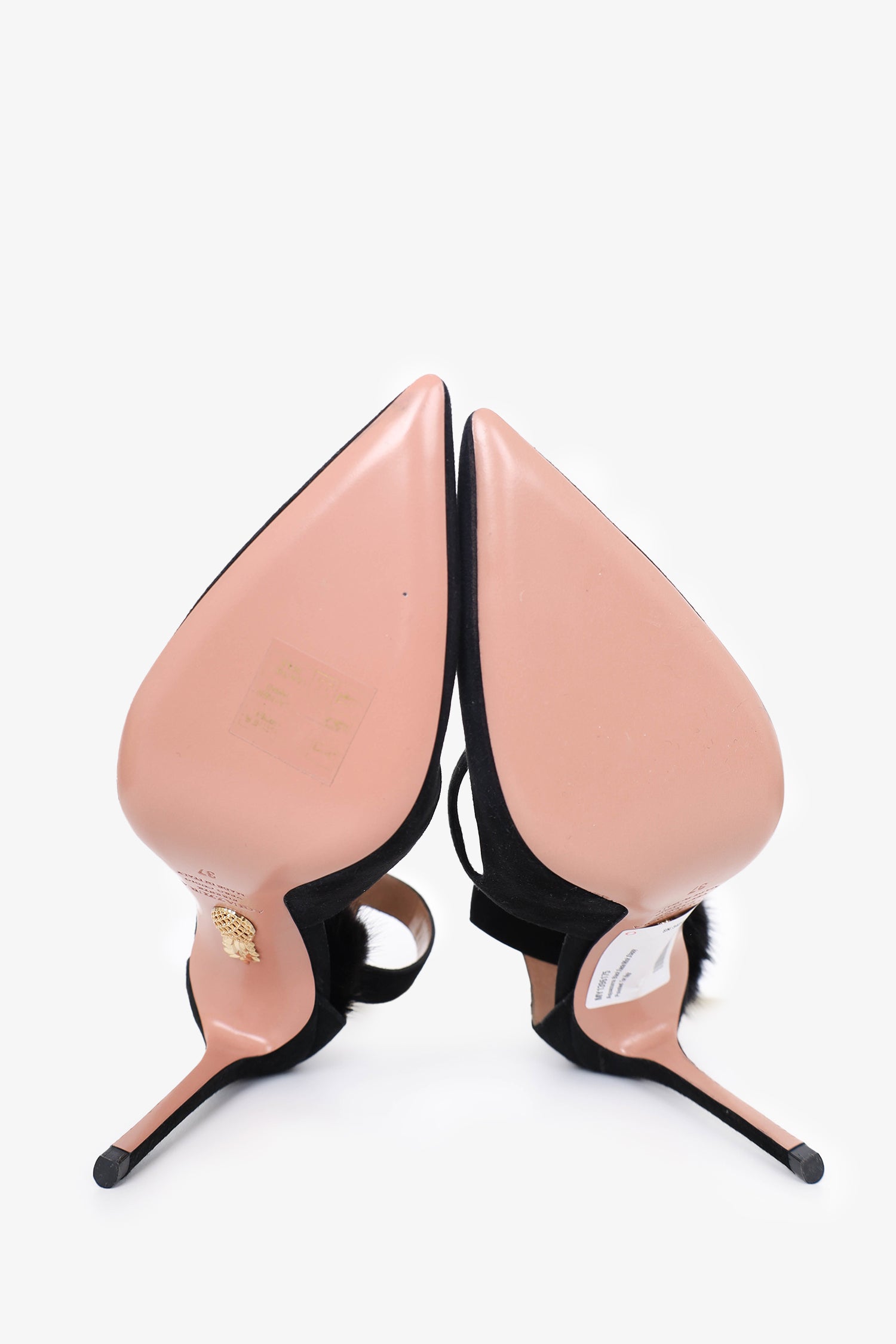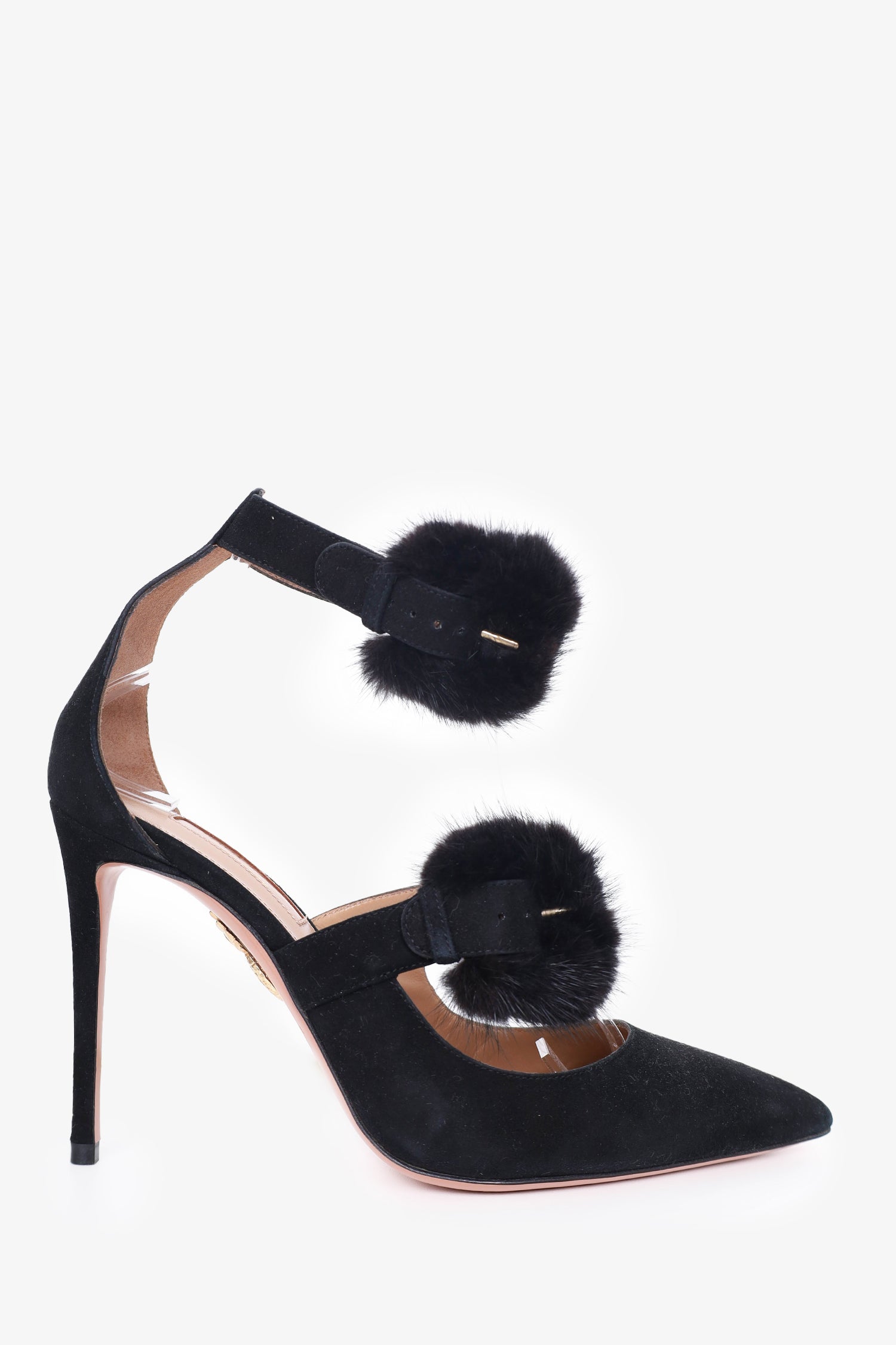 Refresh availabilityAquazurra Black Suede/Mink Srappy Pointed Toe Heels. Adjustable pull-through ankle strap. Tonal stitching.