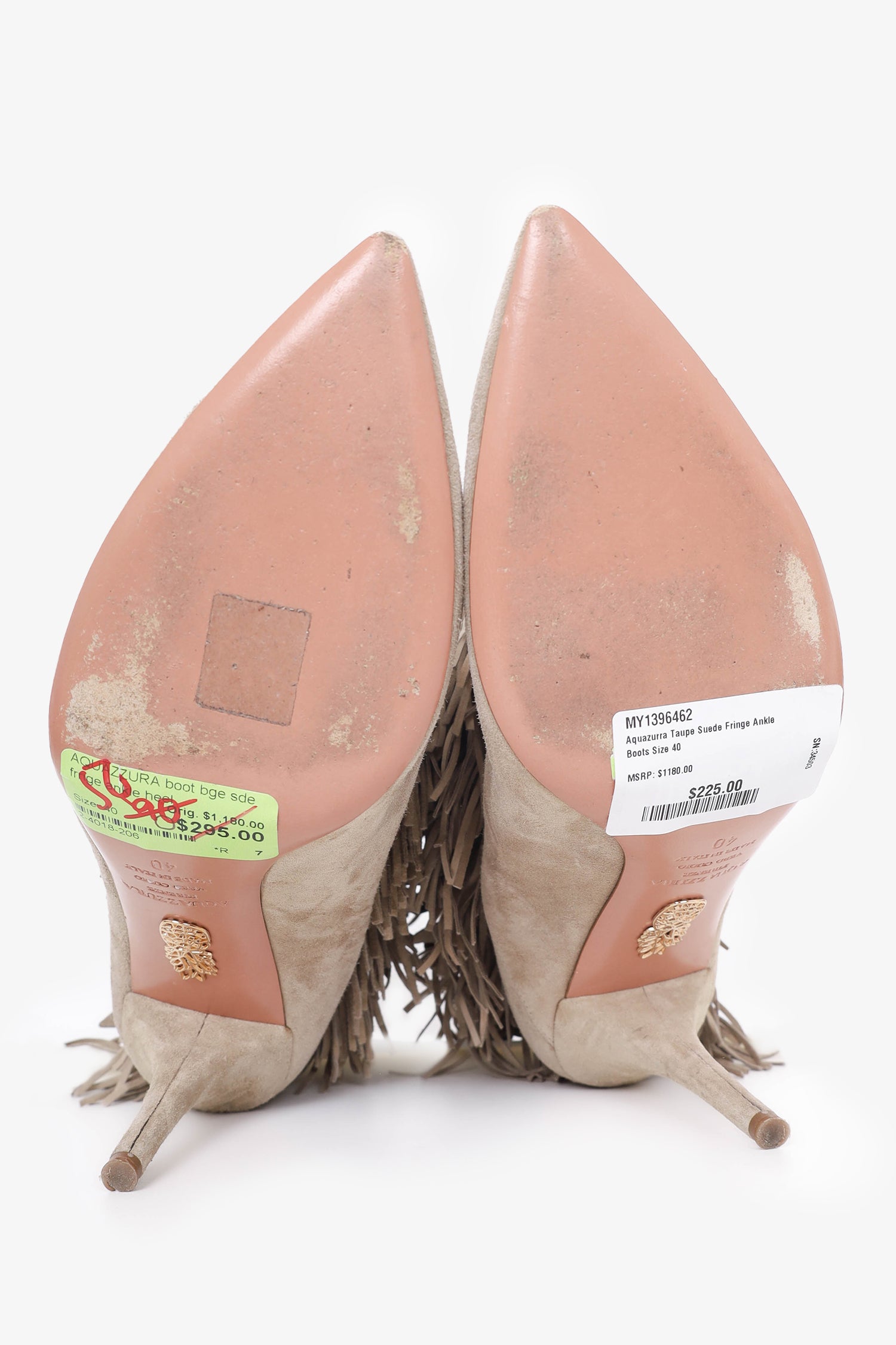 Refresh availabilityAquazurra Taupe Suede Fringe Ankle Boots. Pull-on. Pointed toe. Tonal stitching.