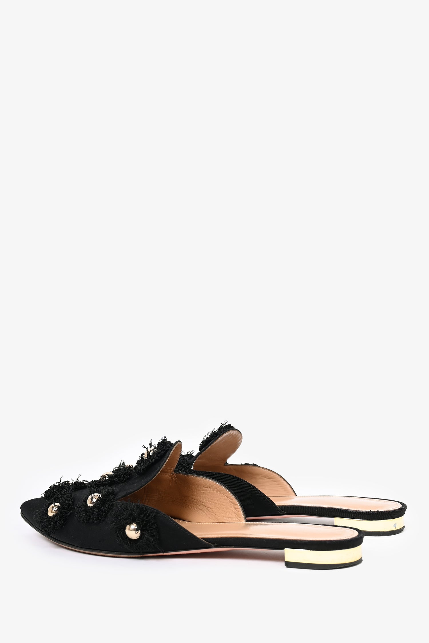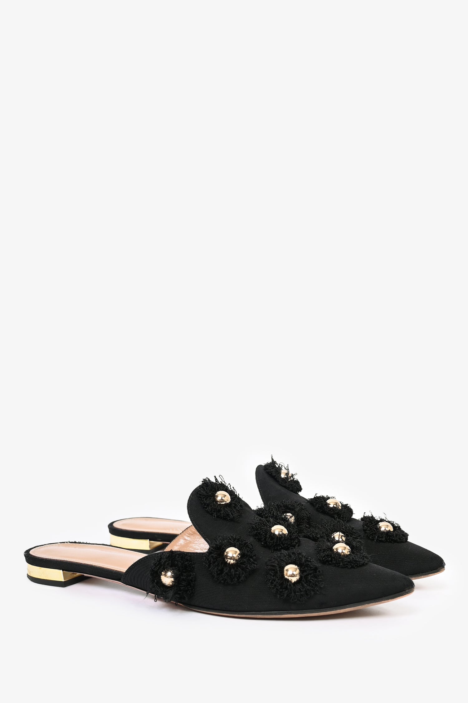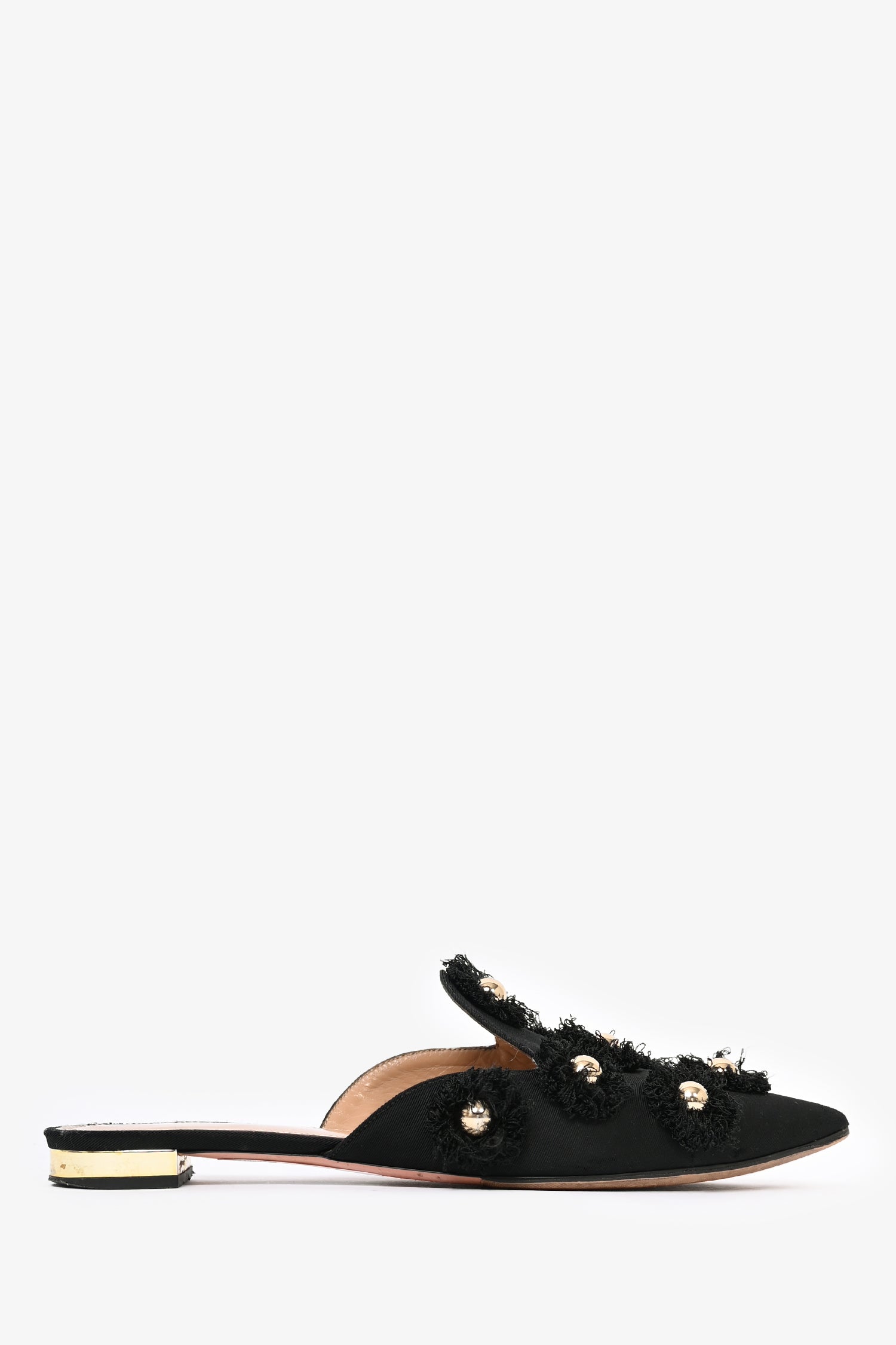 Refresh availabilityAquazzura Black Fabric 'Sunflower' Mule Flats. Slip-on. Pointed toe. Open back. Topy soles.
