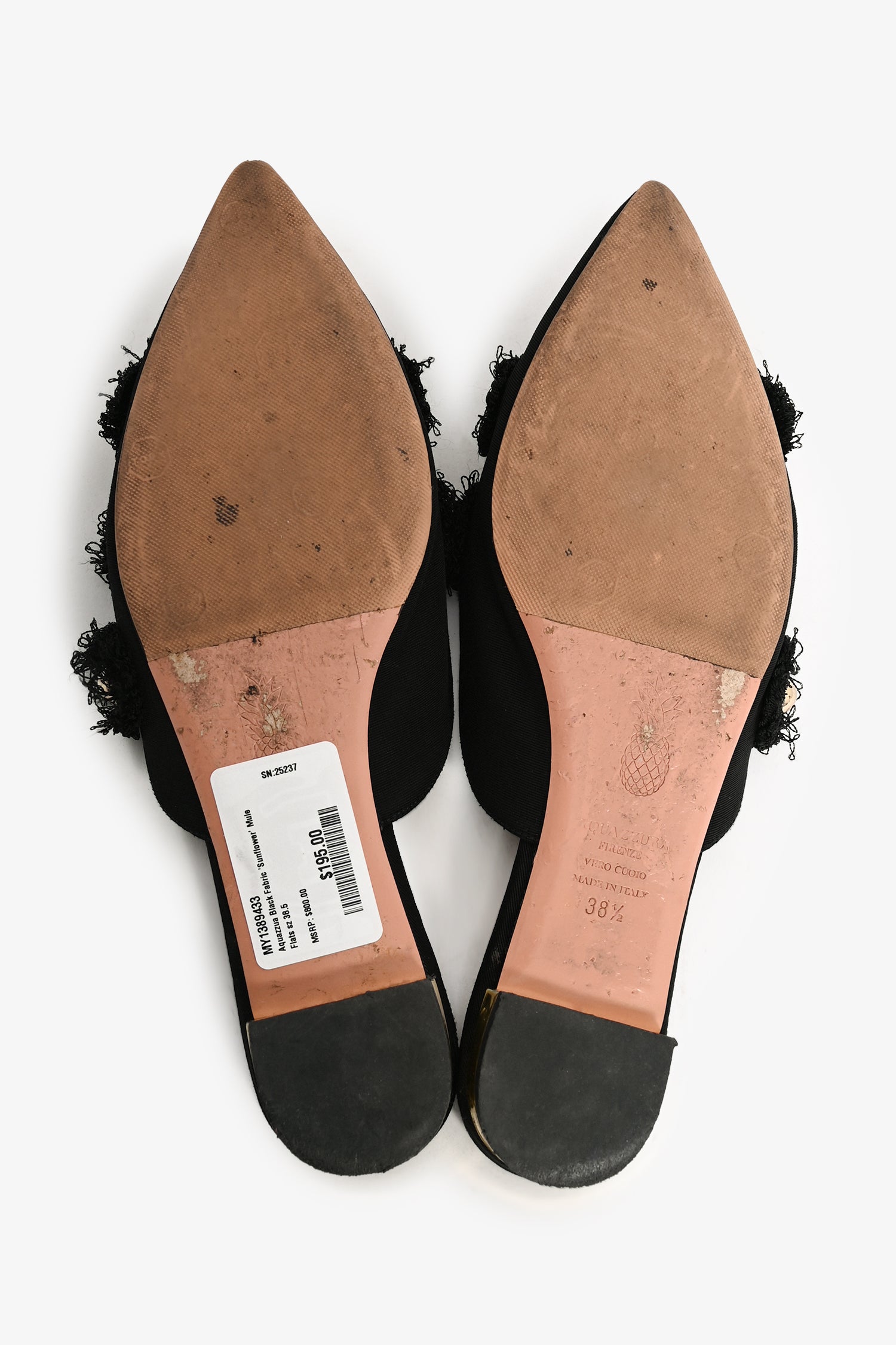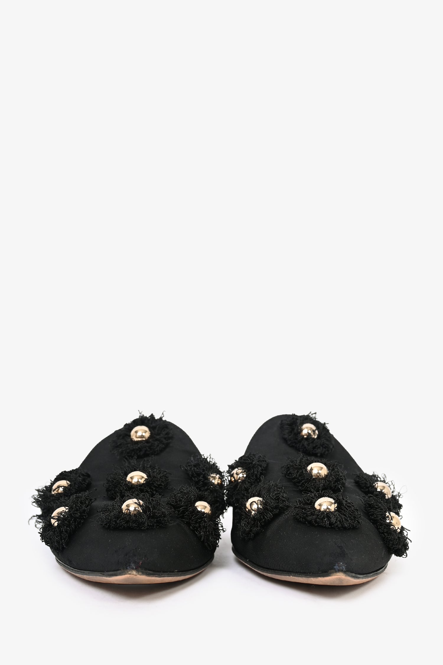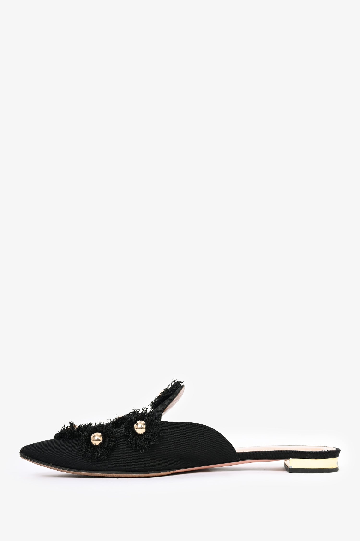 Refresh availabilityAquazzura Black Fabric 'Sunflower' Mule Flats. Slip-on. Pointed toe. Open back. Topy soles.