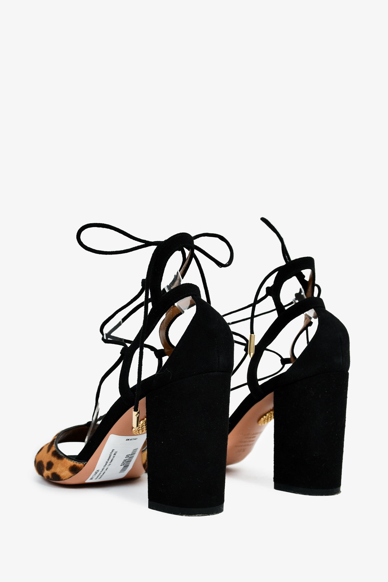 Refresh availabilityAquazzura Austin Black/Leopard Pony Hair/Suede Lace-Up Heels. Ankle tie-up closure. Open-round toe. Block heel. Tonal stitching.