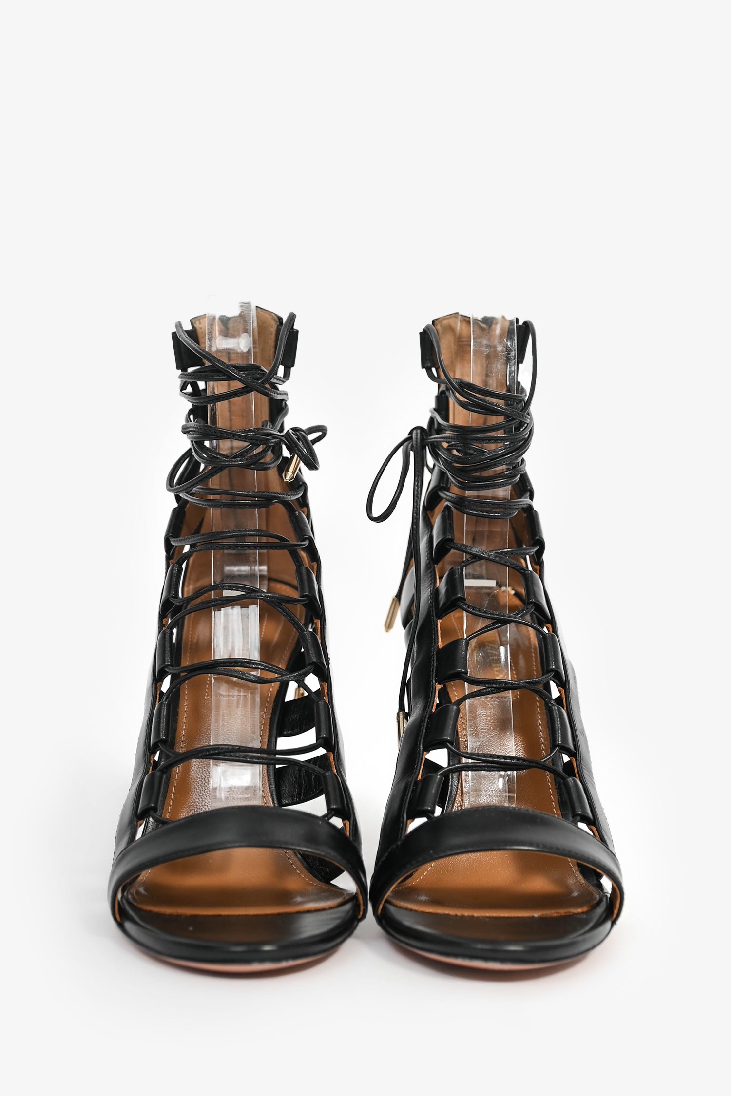 Refresh availabilityAquazzura Black Leather Lace Up Heels. Open toe. Front tie-up closure. Tonal stitching.