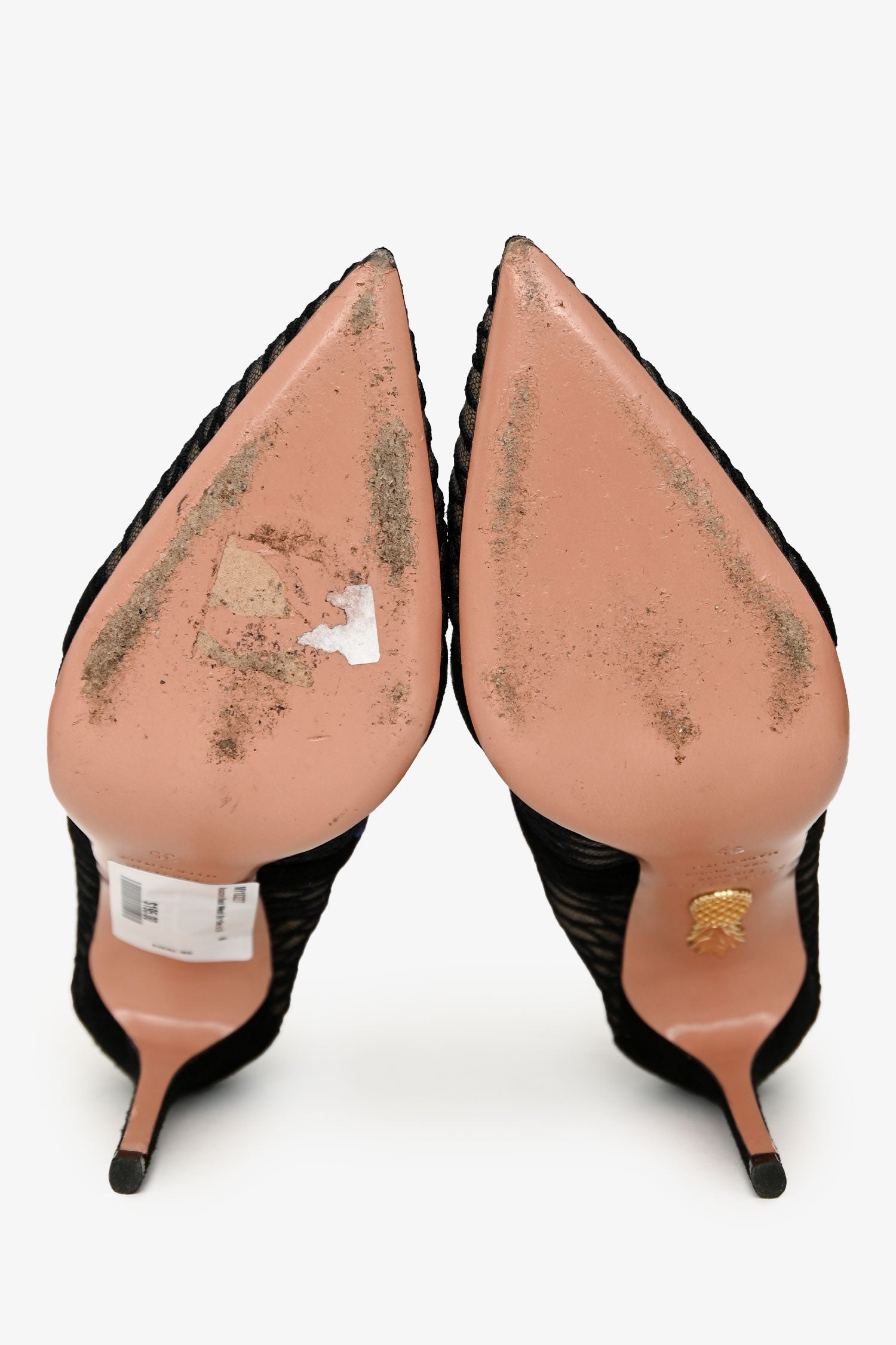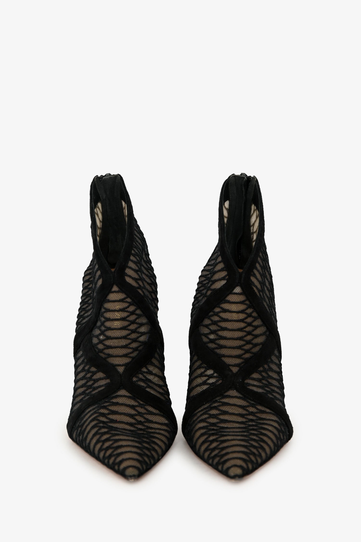 Refresh availabilityAquazzura Black Mesh Booties. Pull-on. Pointed-toe. Suede finish straps. Back zipper closure. Tonal stitching.