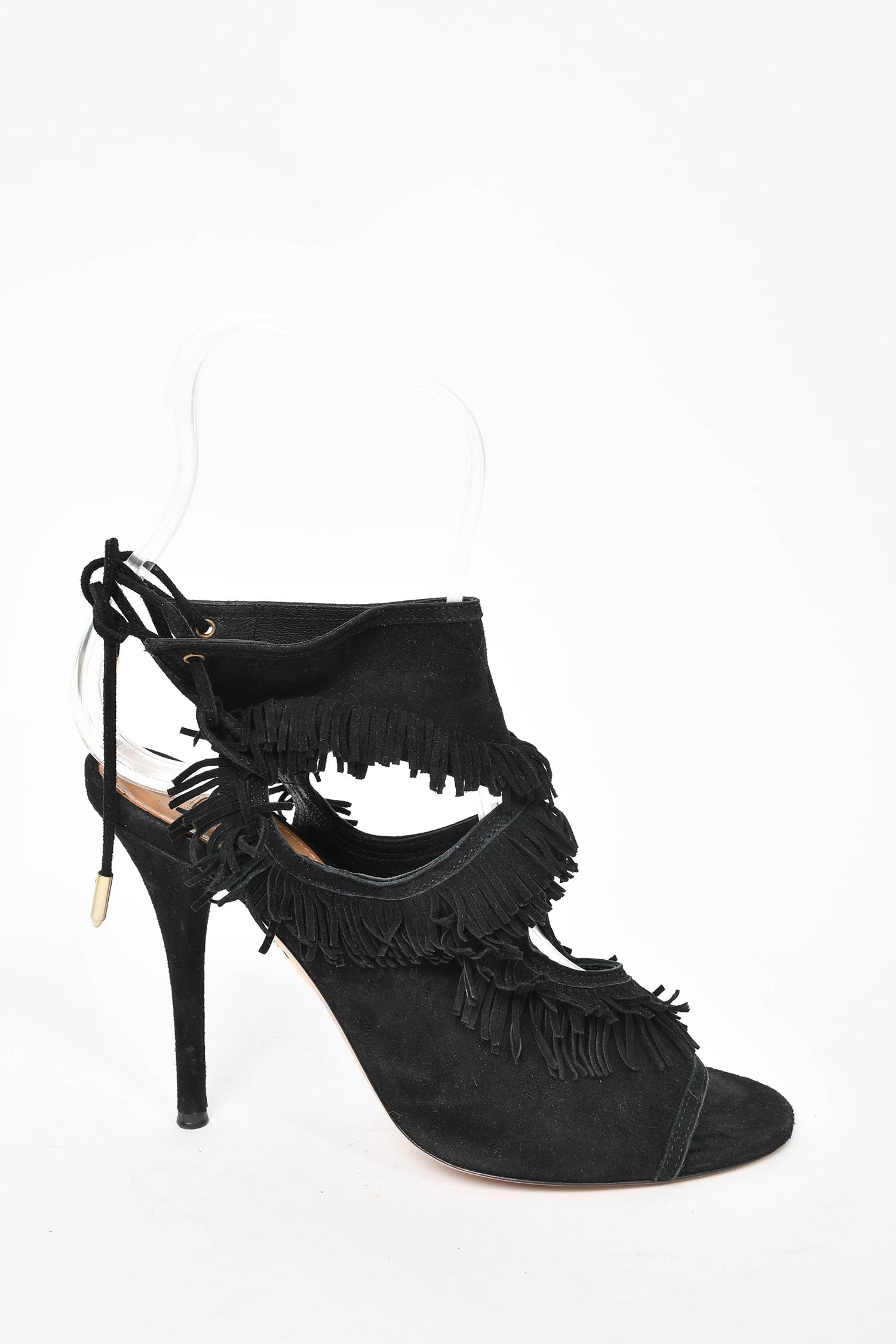 Aquazzura Black Suede Fringe Heel Size 37.5