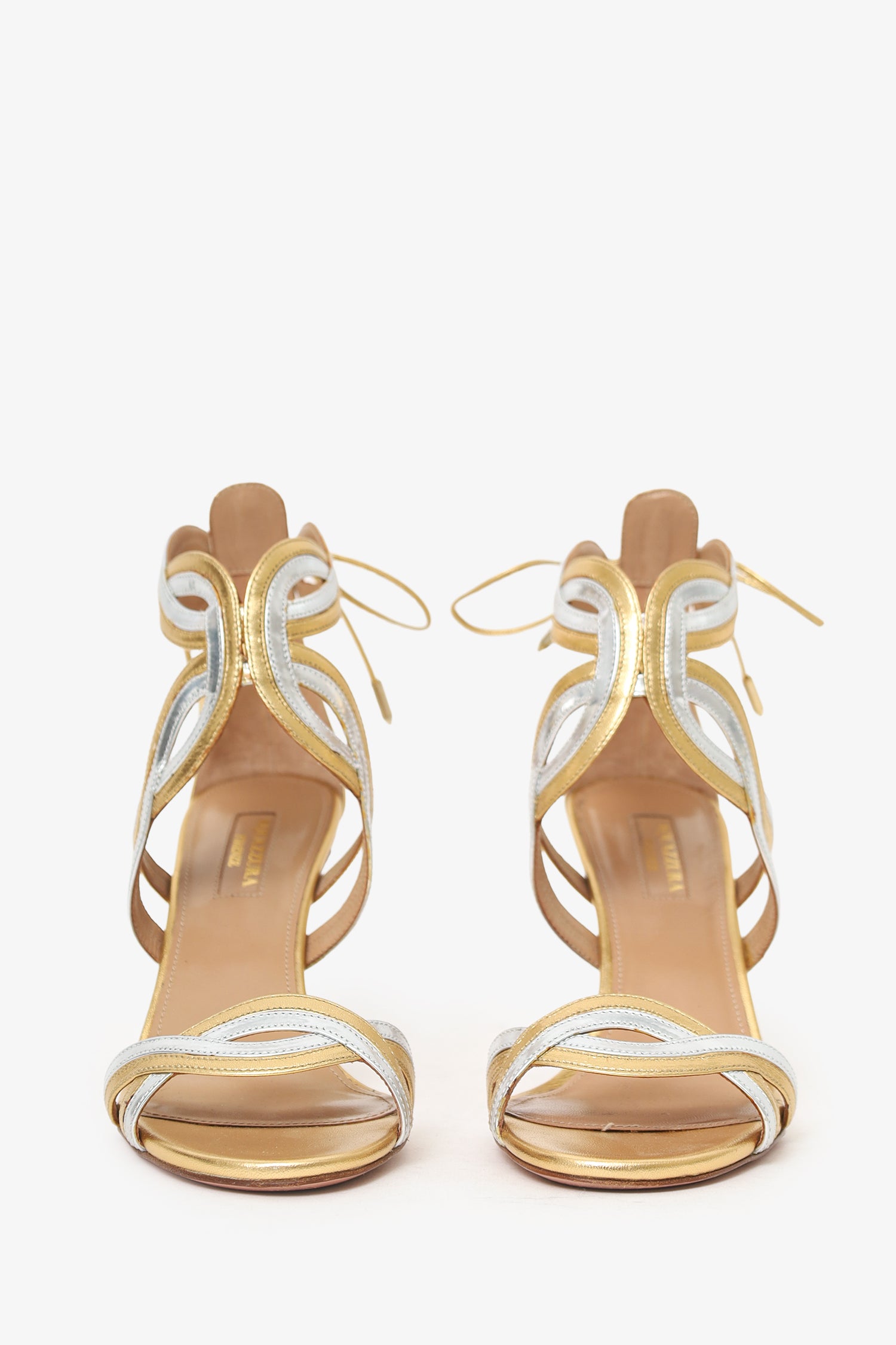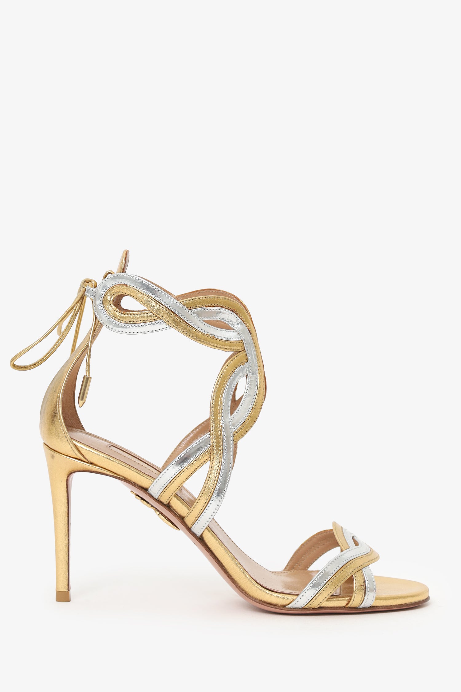 Refresh availabilityAquazzura Gold/Silver Leather Strappy Heels. Slip-on. Round toe. Rear ankle tie-up closure. Gold-tone hardware. Tonal stitching.