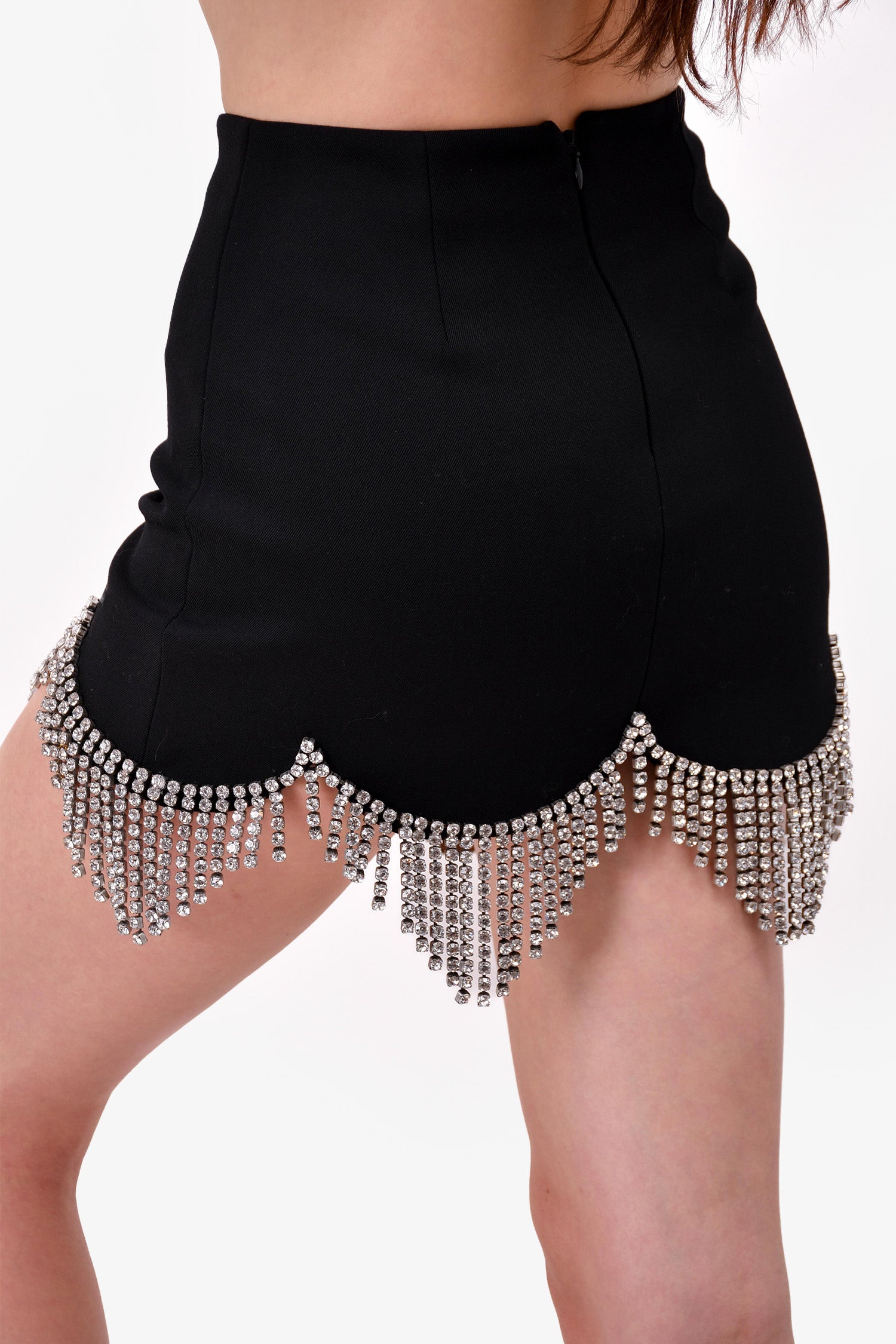 Refresh availabilityArea Black Crystal Embellished Mini Skirt. Back zip closure. Lined. Tonal stitching.