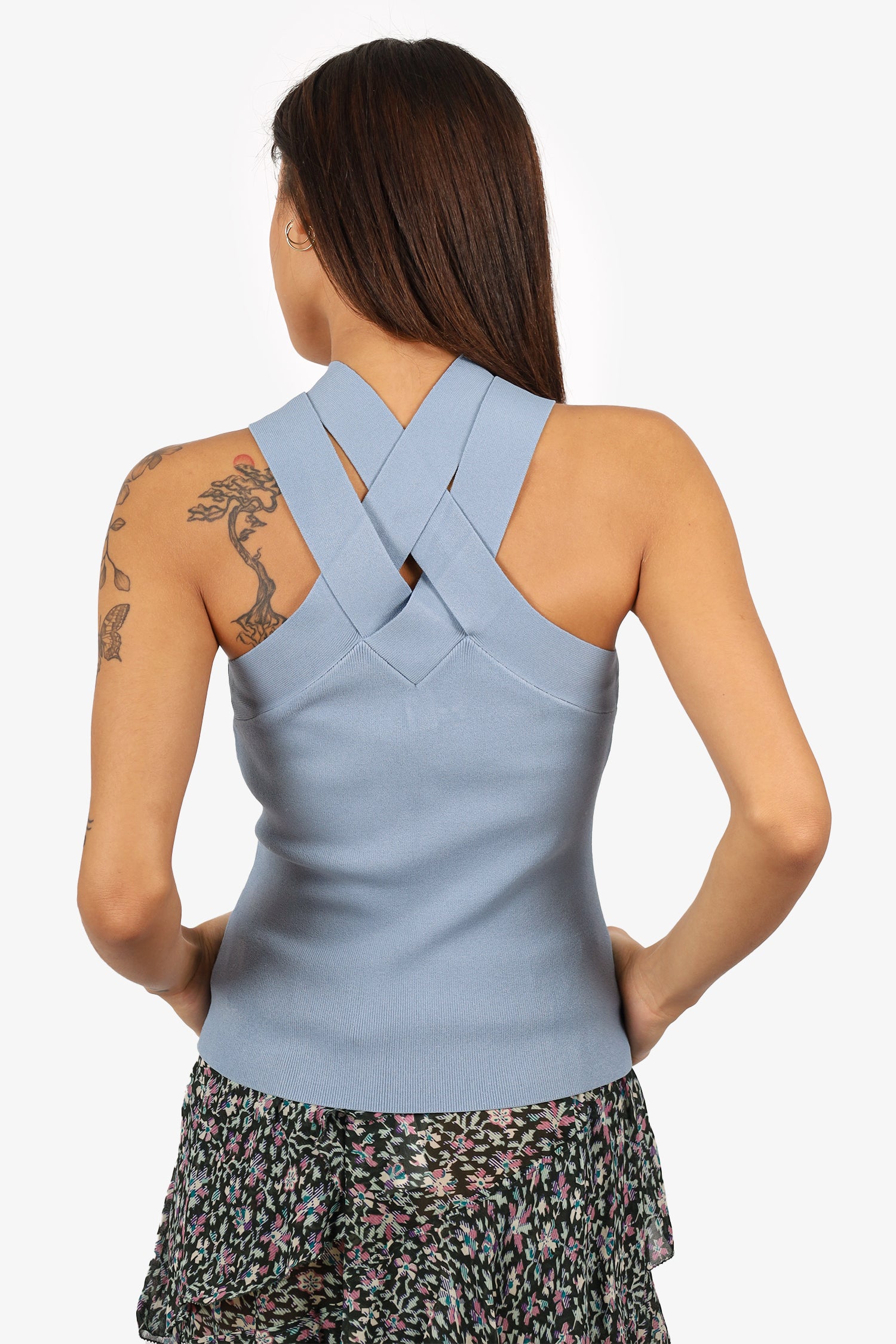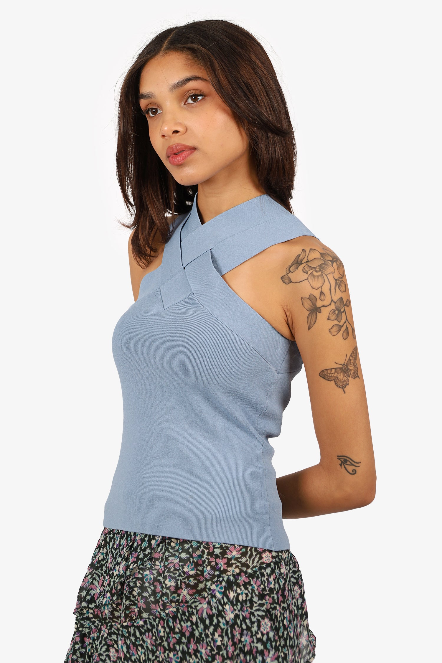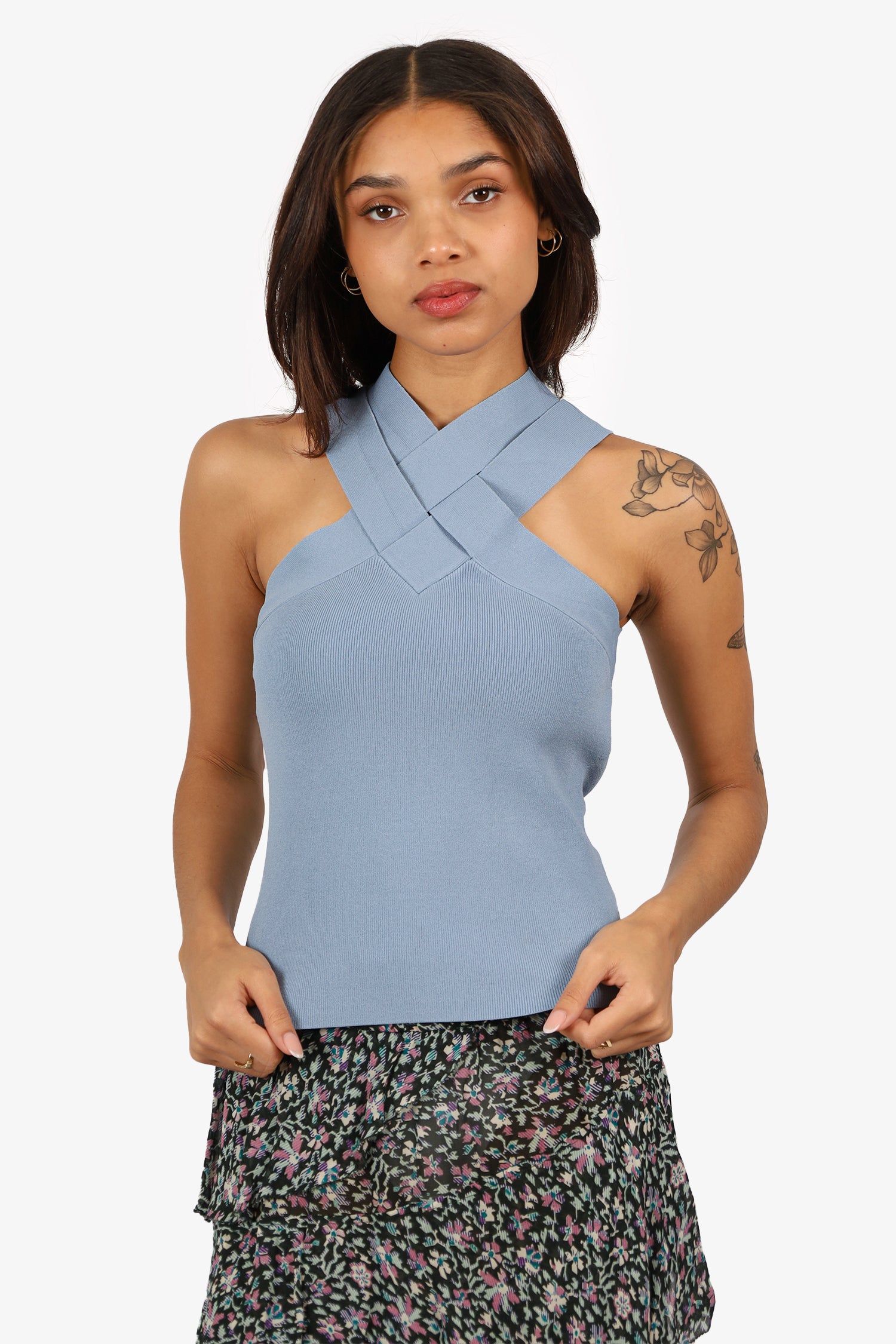 Refresh availabilityAutumn Cashmere Blue Ribbed Knit Sleeveless Top. Pull-on. Criss-cross halter neckline. Ribbed exterior. Tonal stitching.