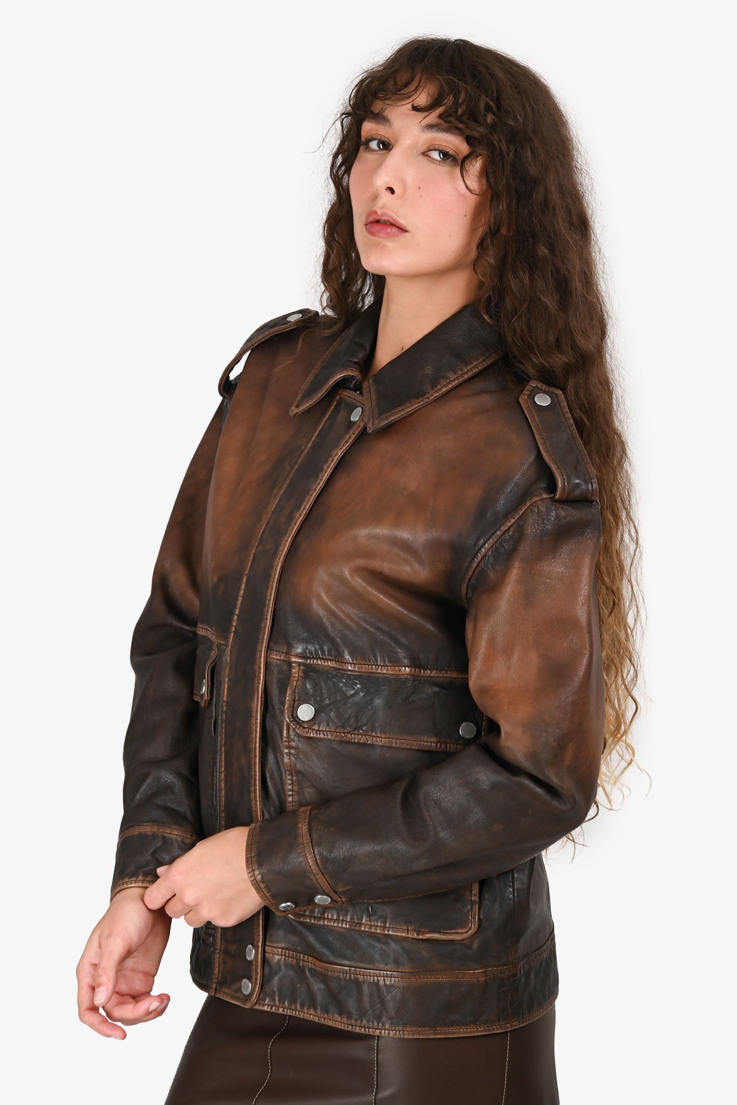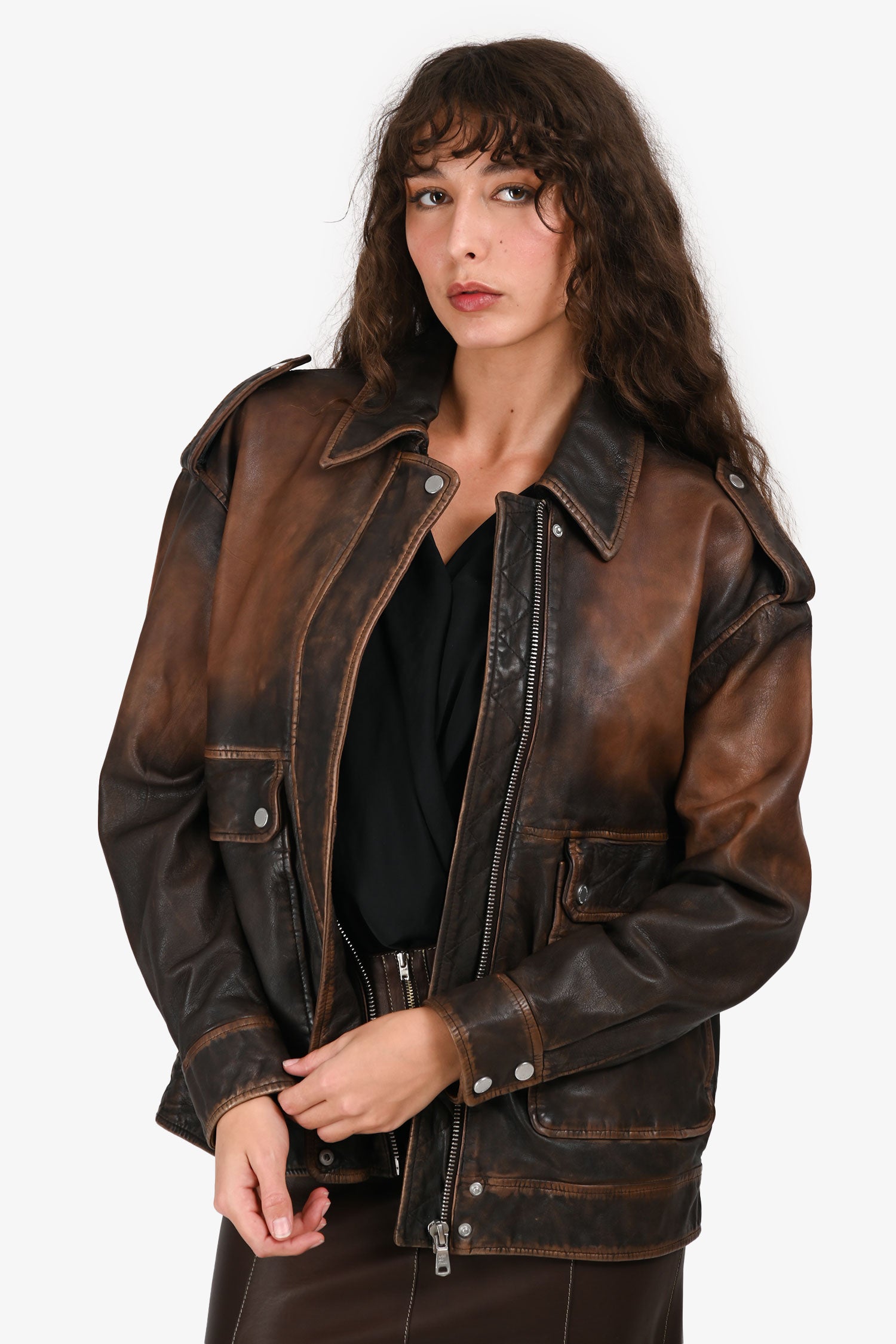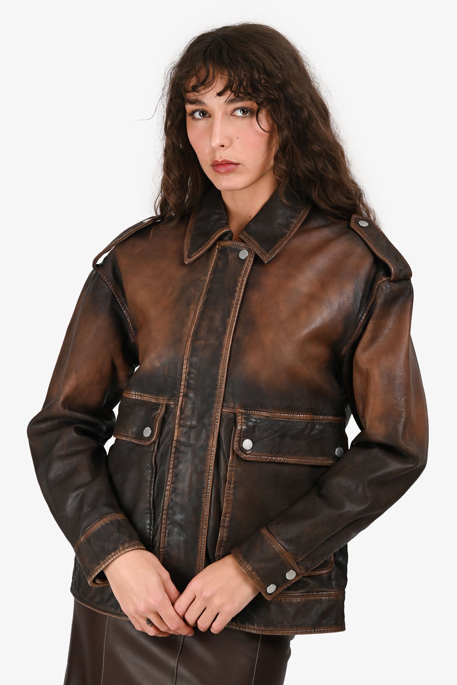 Refresh availabilityAvec Les Filles Aged Brown Leather Oversized Jacket. Pull-on. Hidden front zipper closure. Snap-button detailing. Point collar. 2 exterior flap pockets with snap-button closure. Silver-tone hardware. Tonal stitching.