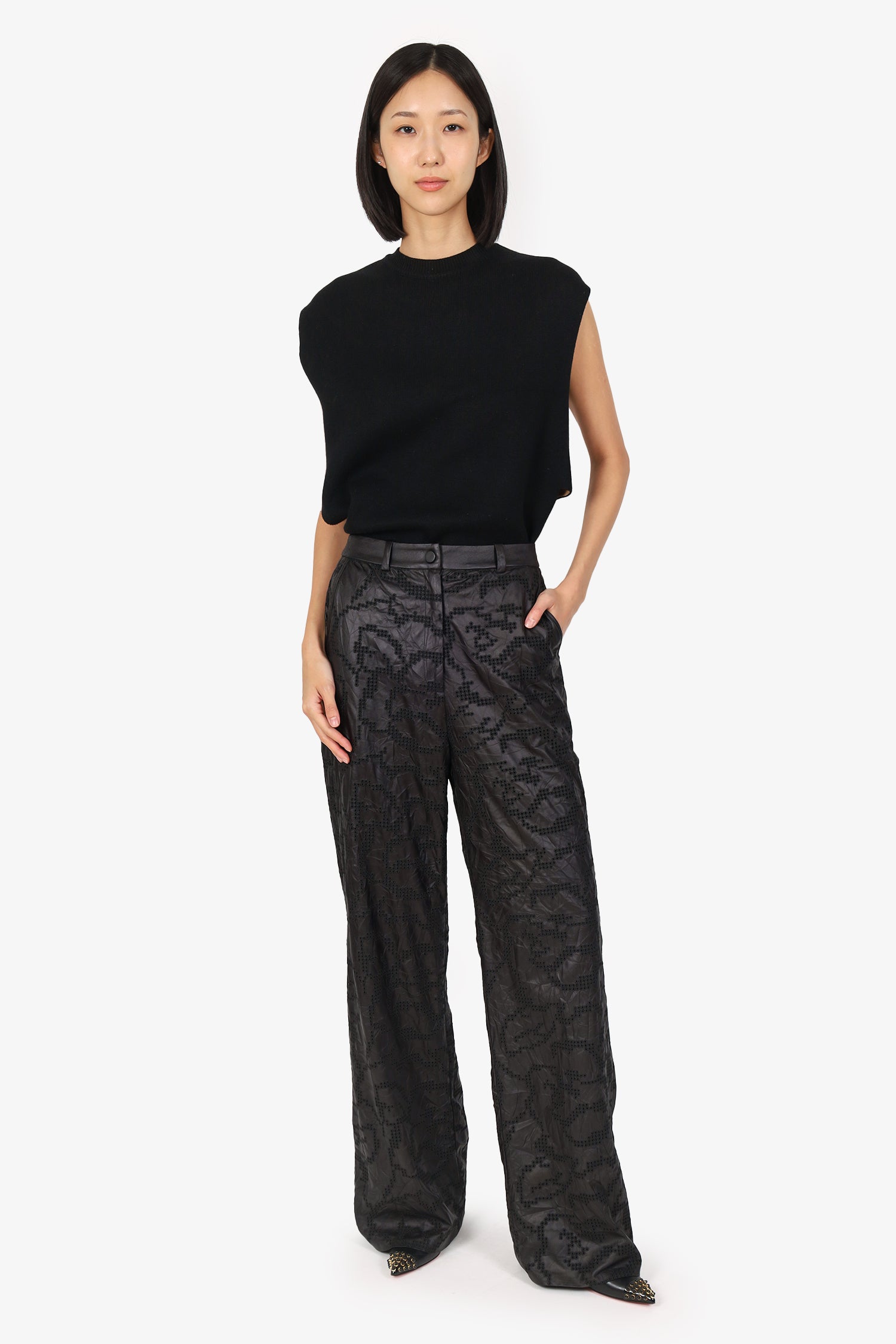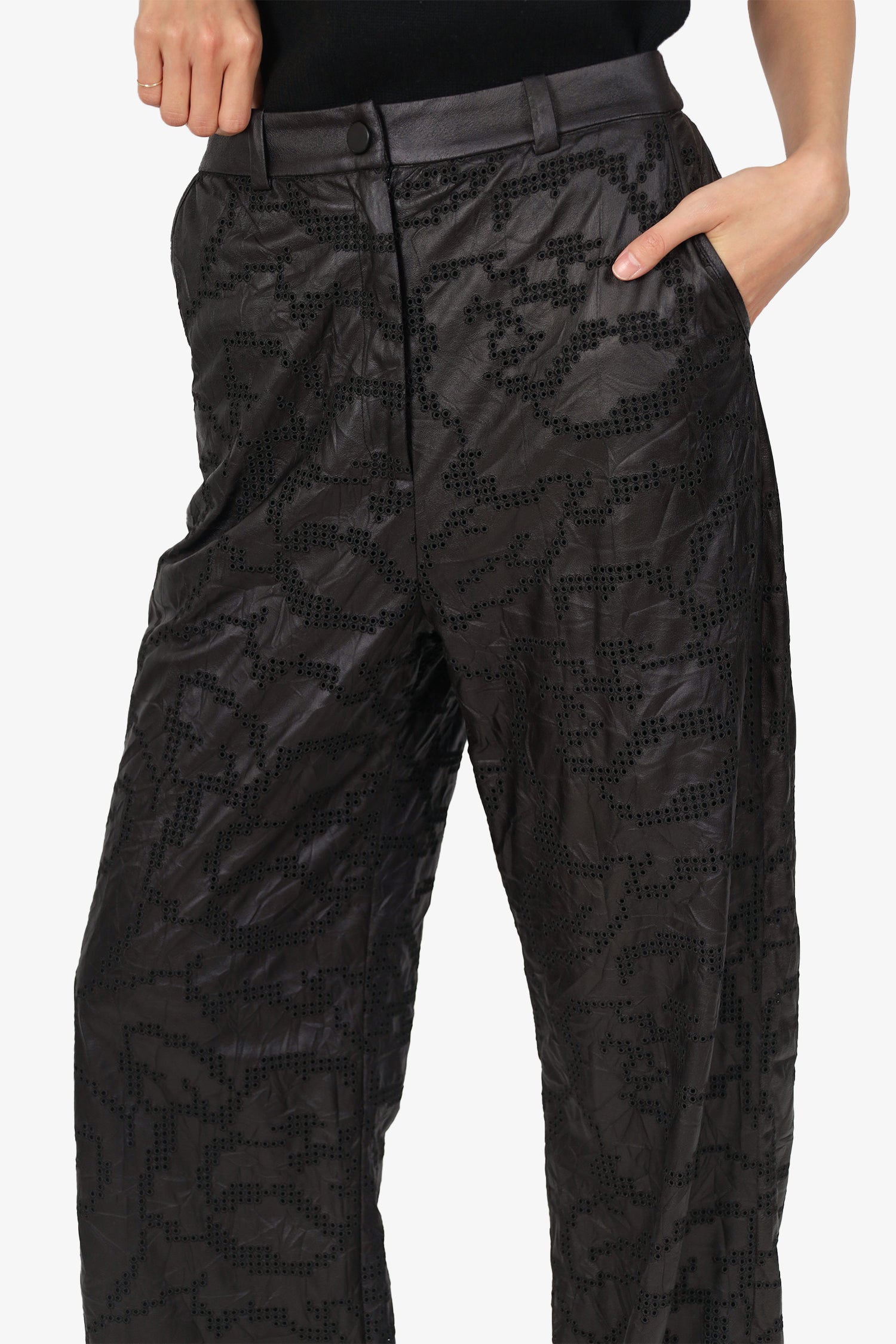 Refresh availabilityAzul Black Faux Leather Wide Leg. Slip-on. Slip-on. Front zip with snap-button closure. Waistband belt loops. 4 exterior pockets; 2 front side slip and 2 rear slip. Lined interior. Tonal stitching.