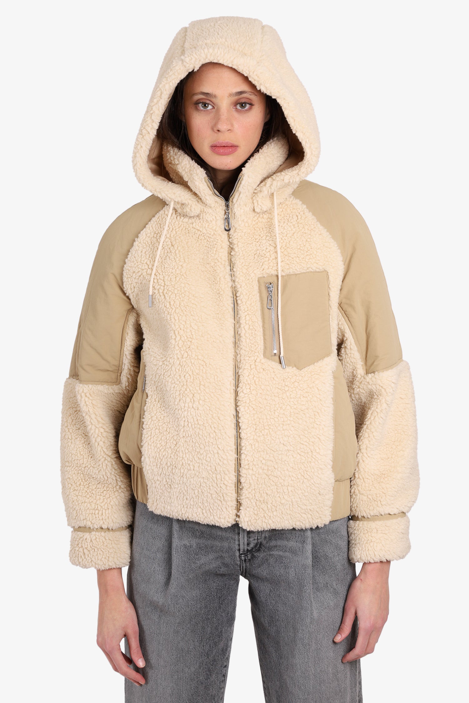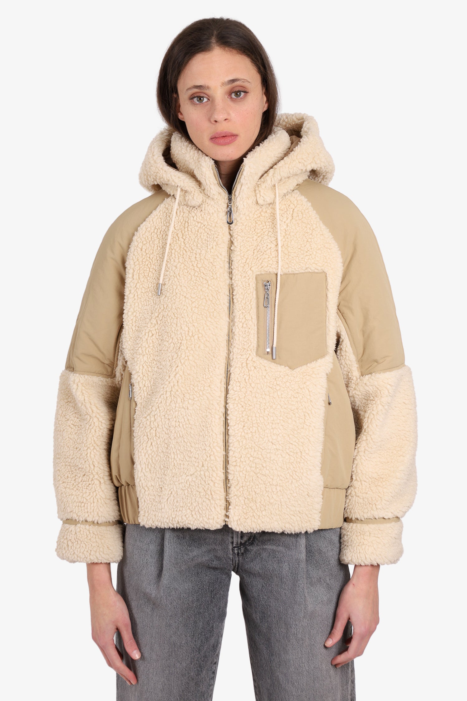 Ba&Sh Beige Teddy Puffer Jacket with Hood. Front zip-up closure. 3 Front zip-up pockets. Elasticated hem. Tonal stitching.