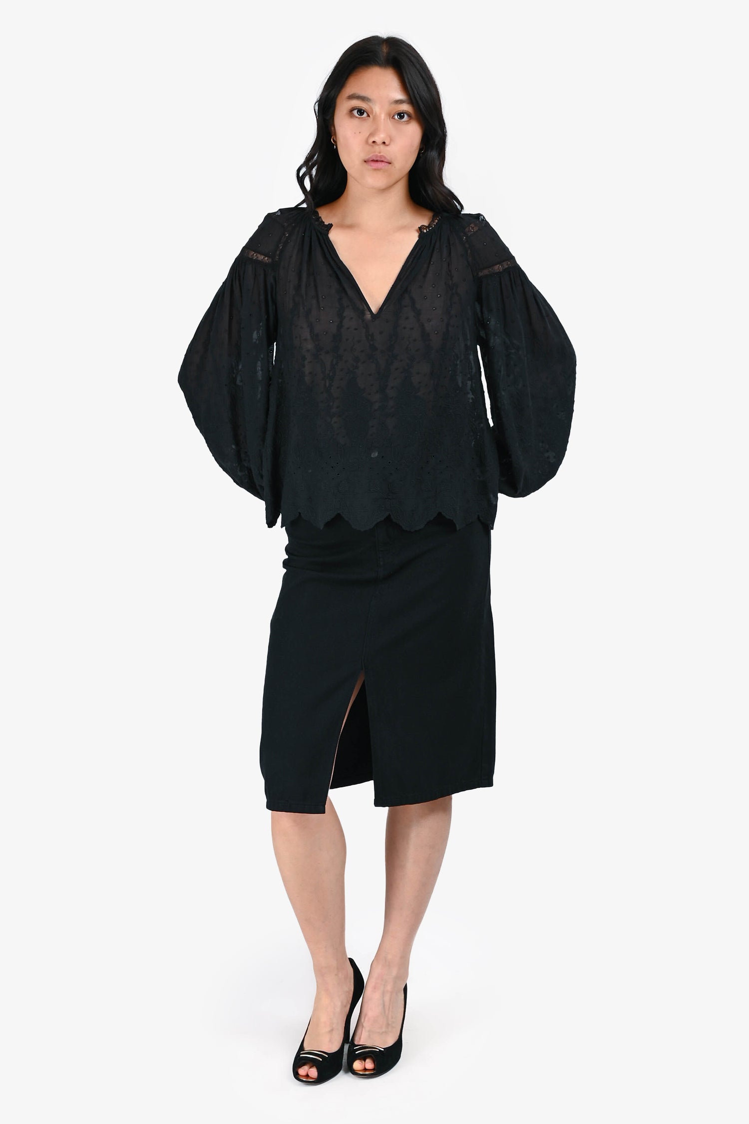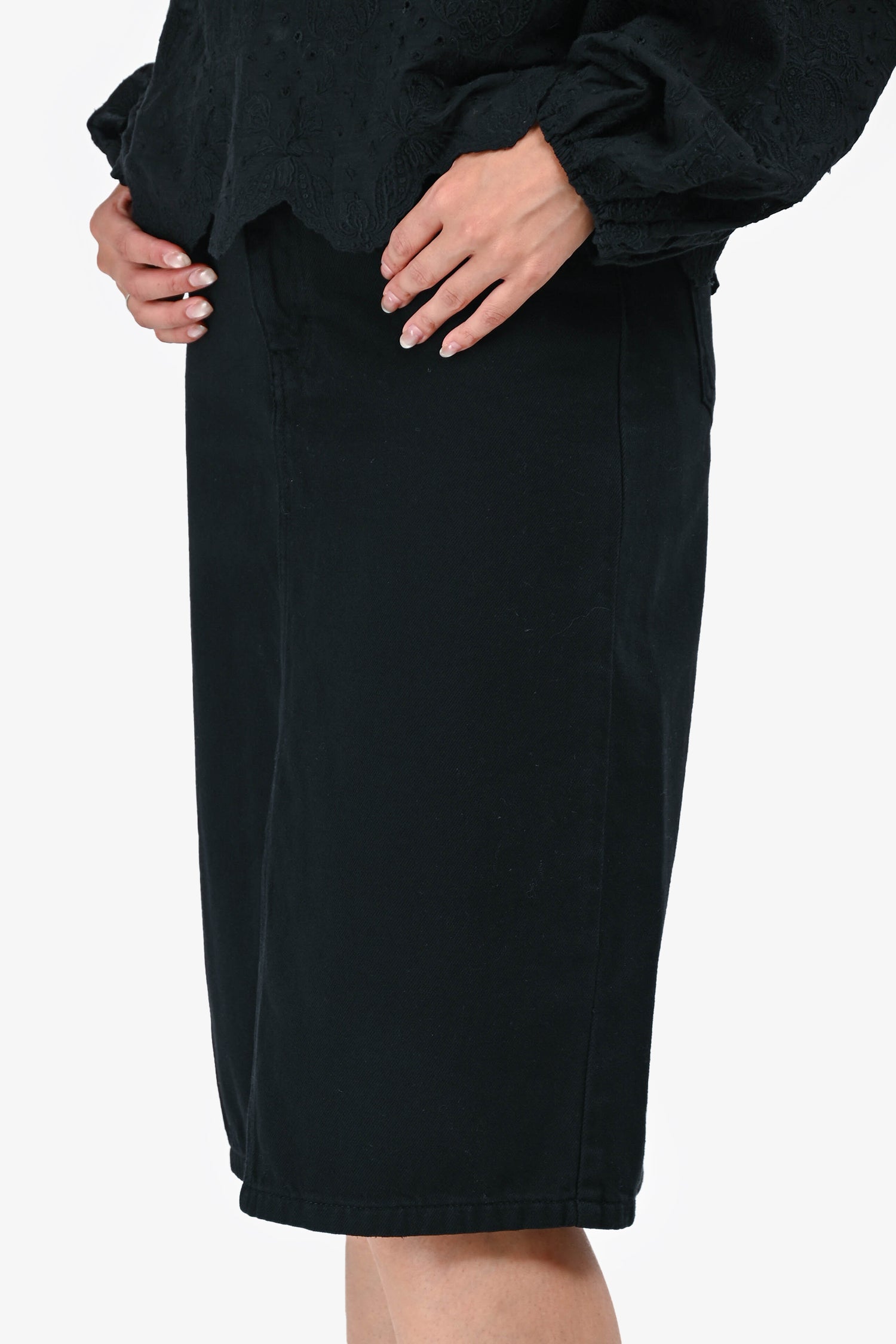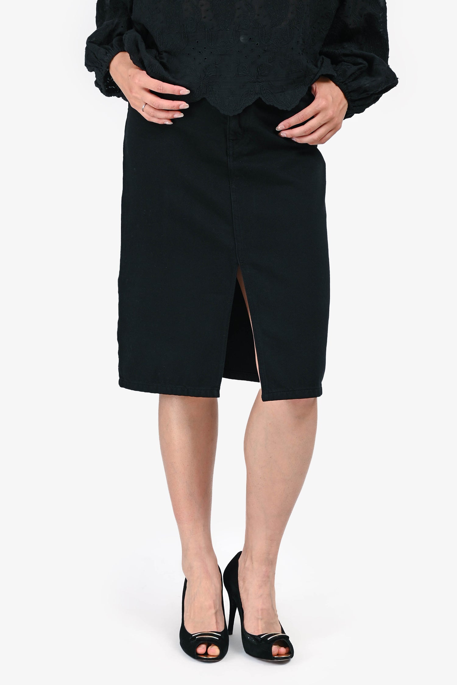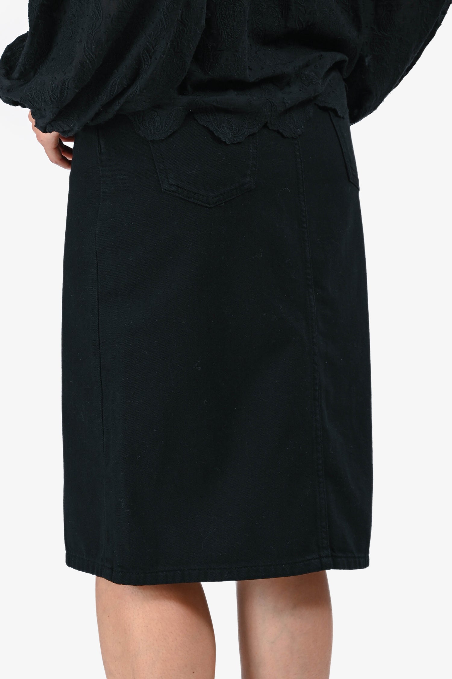 Refresh availabilityBa&sh Black Denim Jude Mini Skirt. Front button and zip closure. Five-pocket styling. Front slit. Tonal stitching.