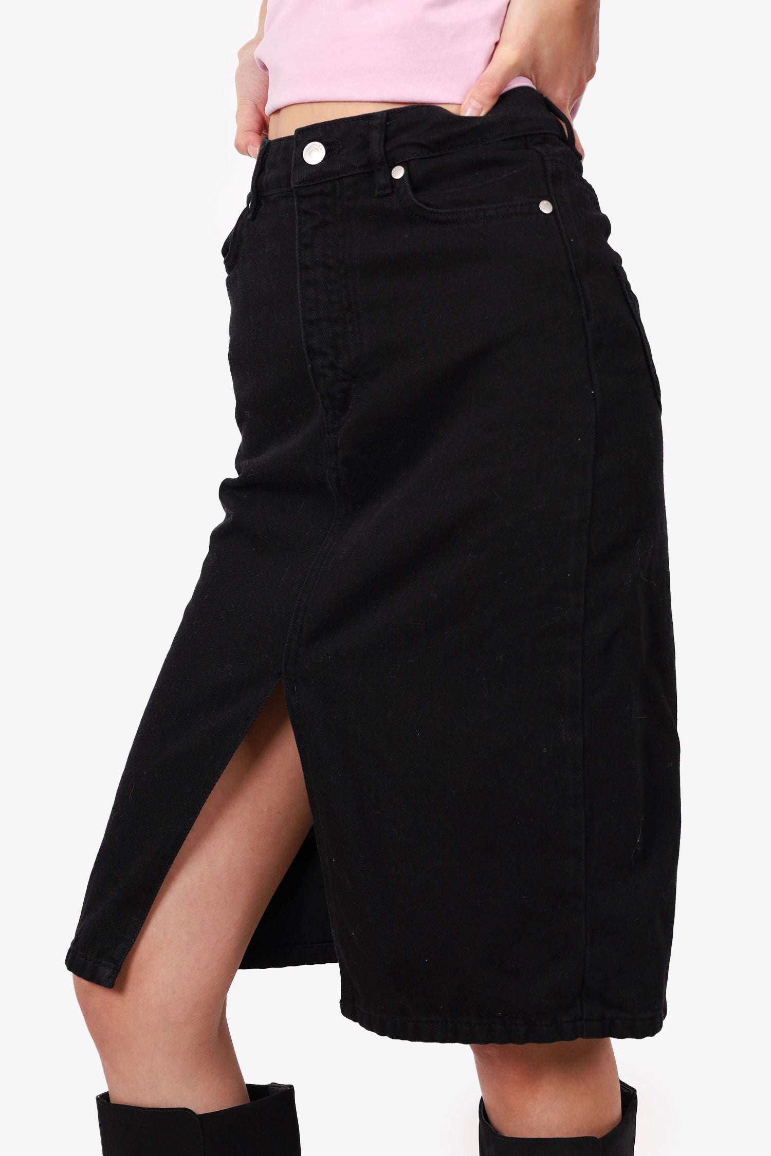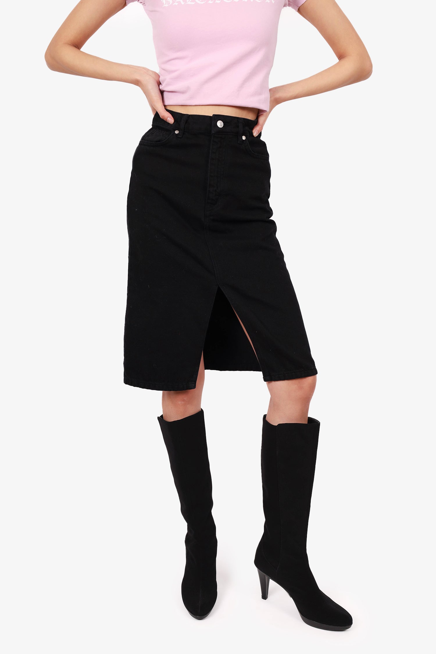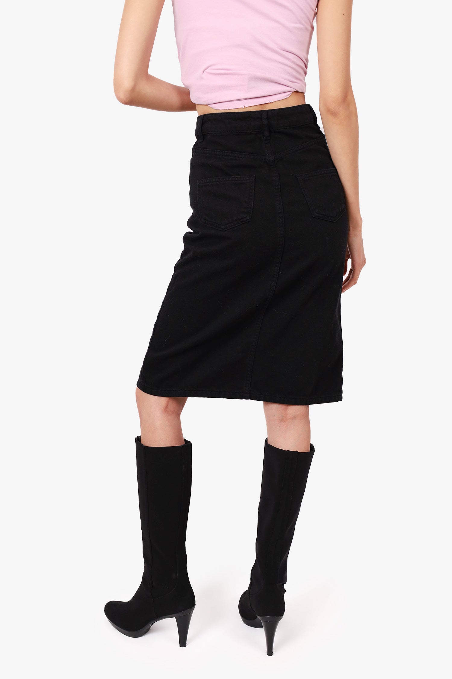 Refresh availabilityBa&sh Black Denim Knee Length Skirt. Front button-up with zip closure. Waist belt loops. Front and rear slip pockets. Tonal stitching.