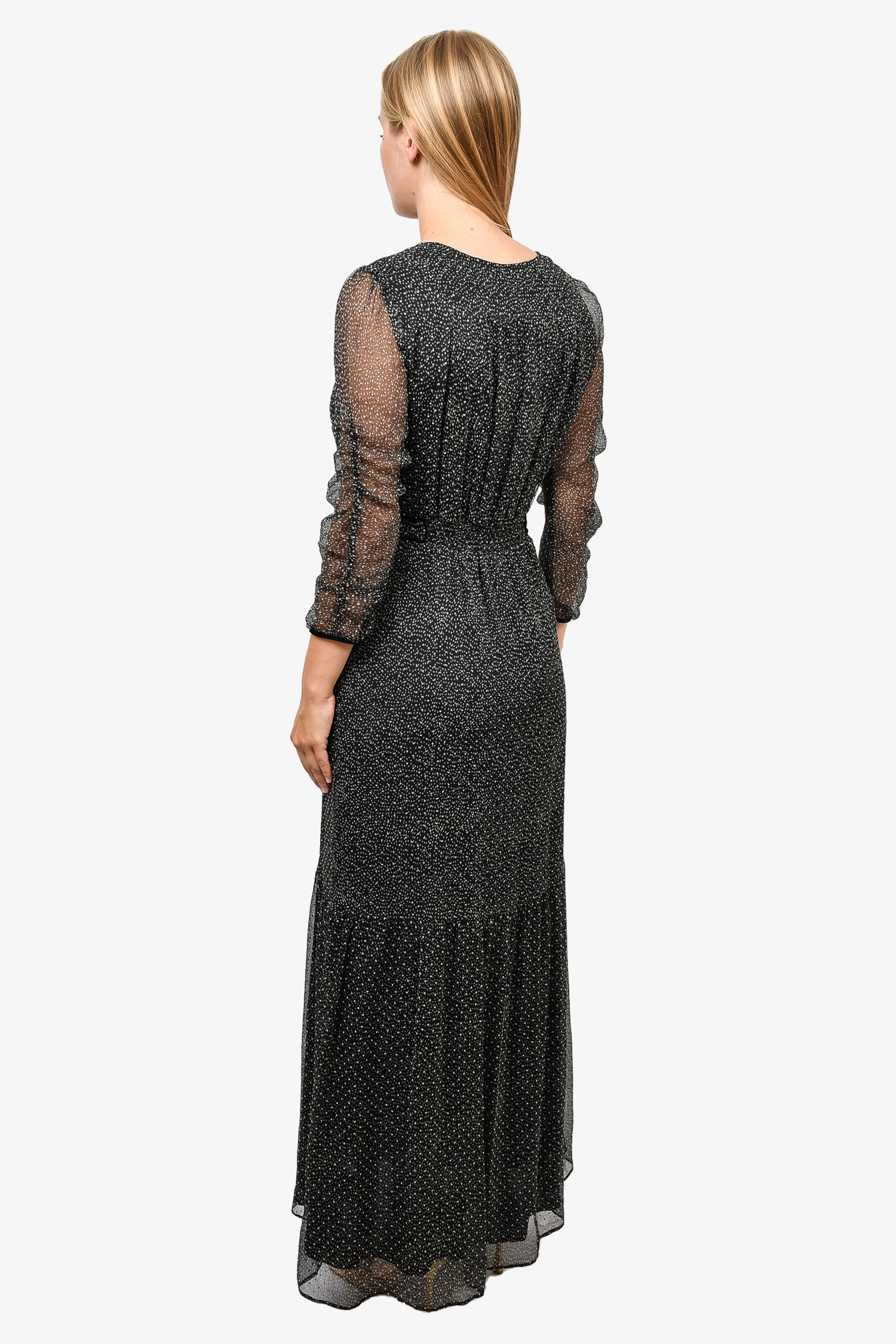 Ba&sh Black Printed V-Neck Maxi Dress. Lined. Elasticized cuffs. Tonal stitching.
