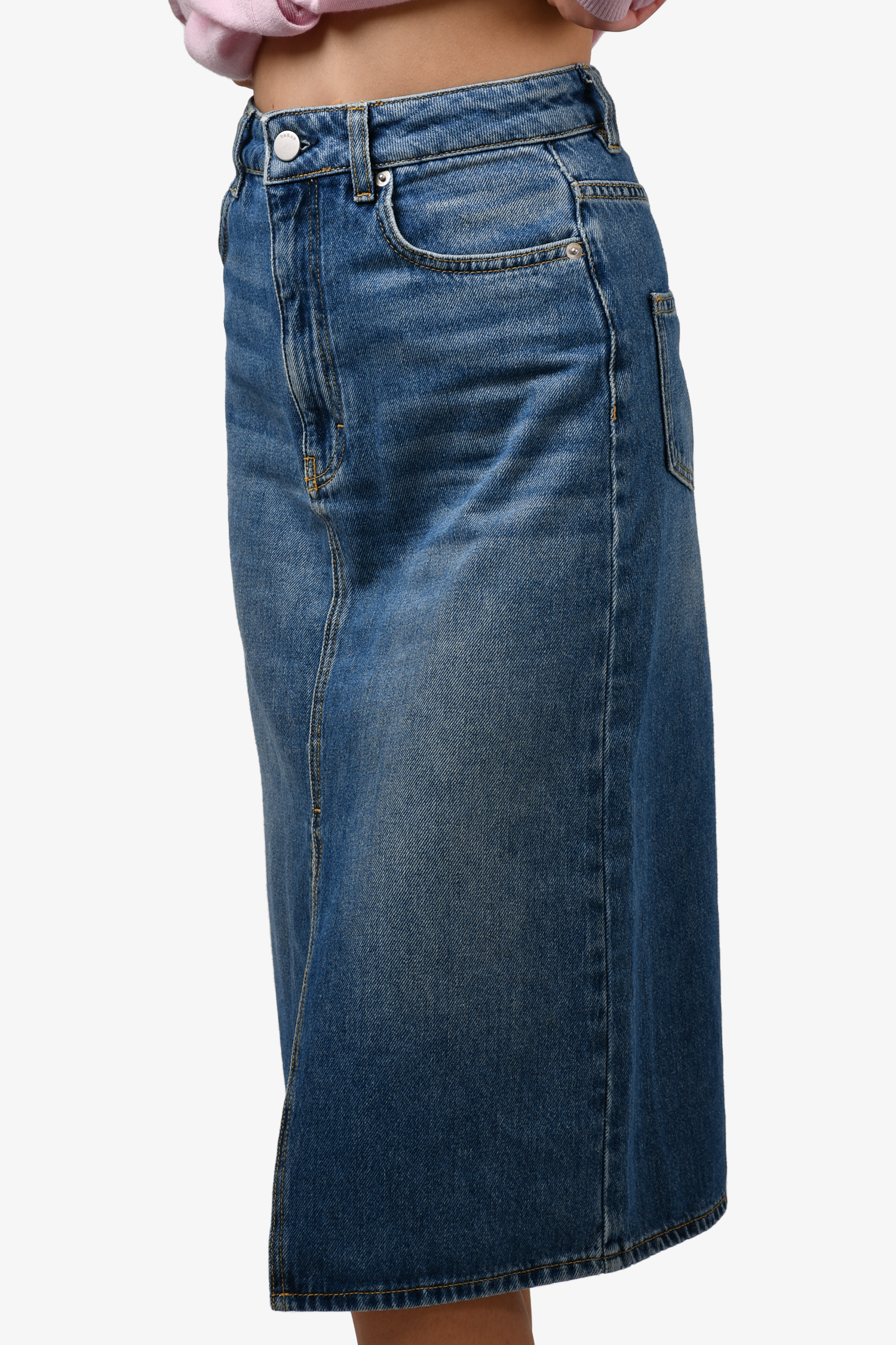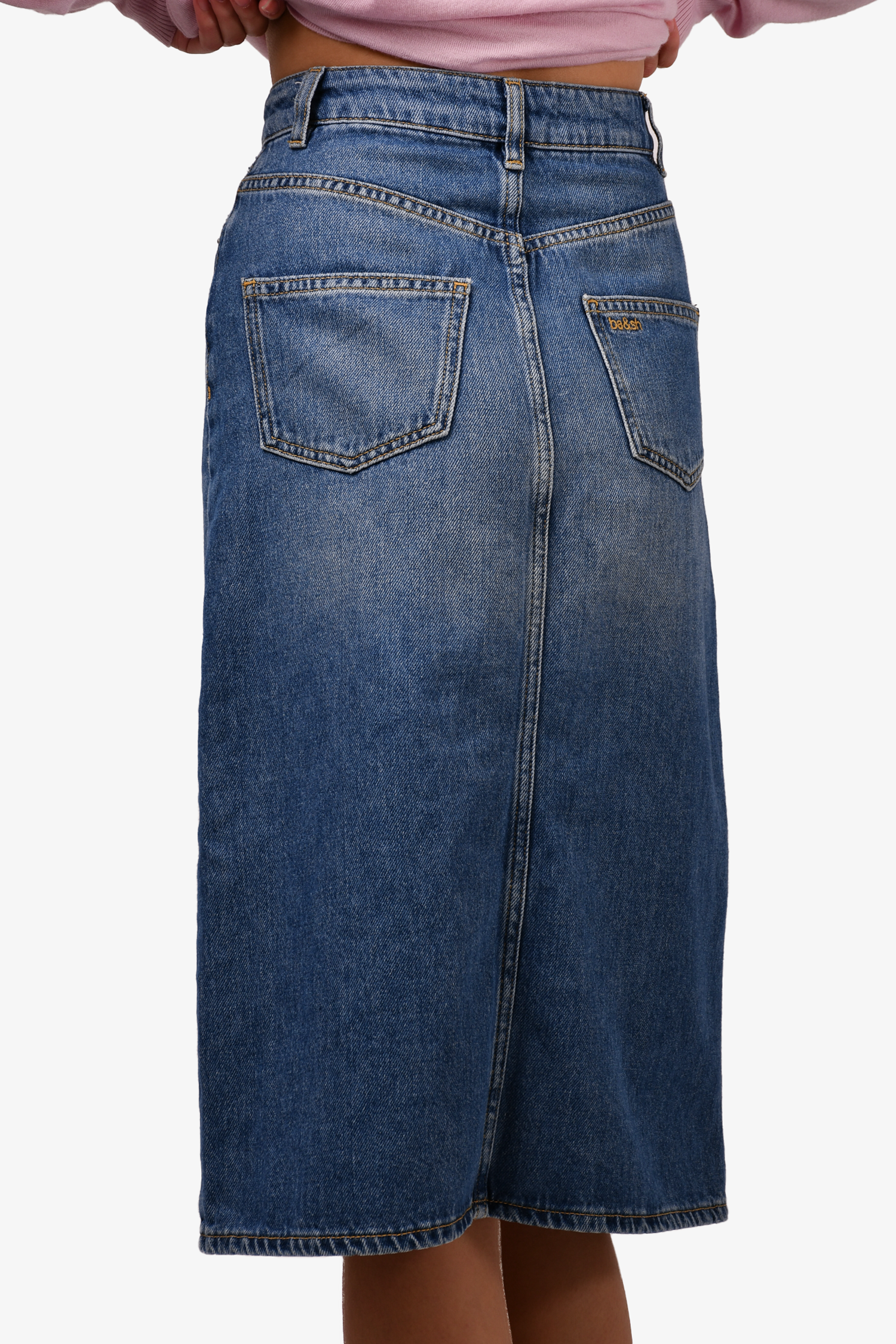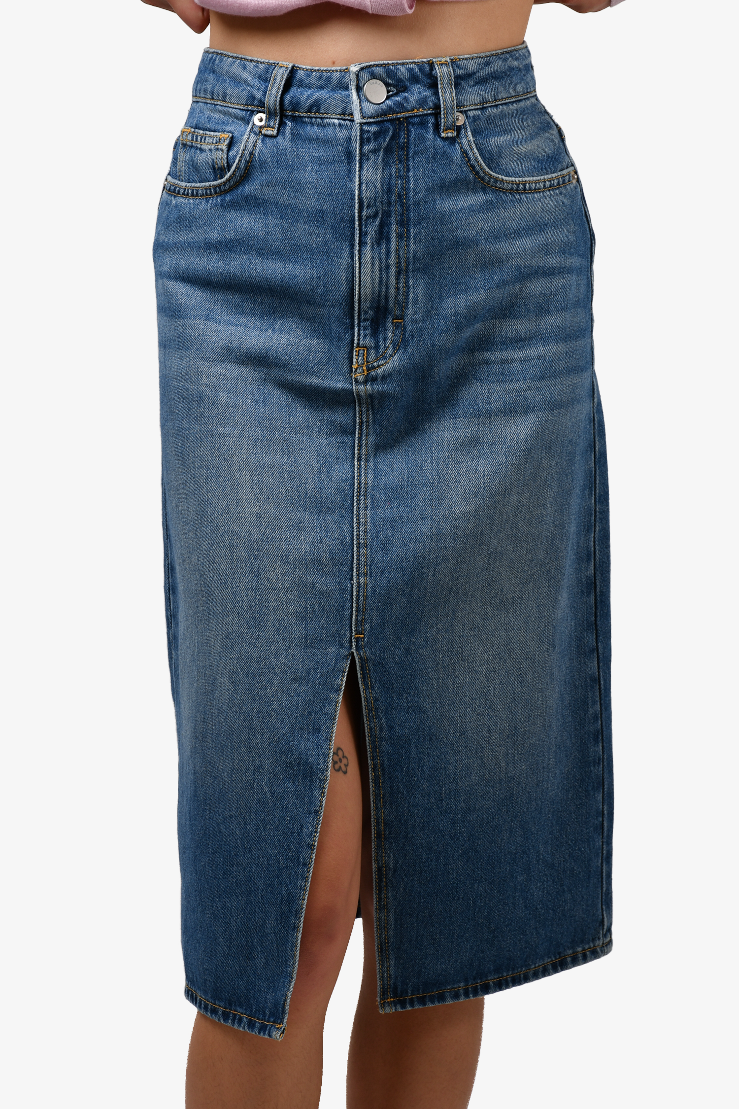 Refresh availabilityBa&sh Blue Denim Slit Midi Skirt. Front zip and button closure. Front and rear pockets. Waist belt loops. Contrast and tonal stitching.