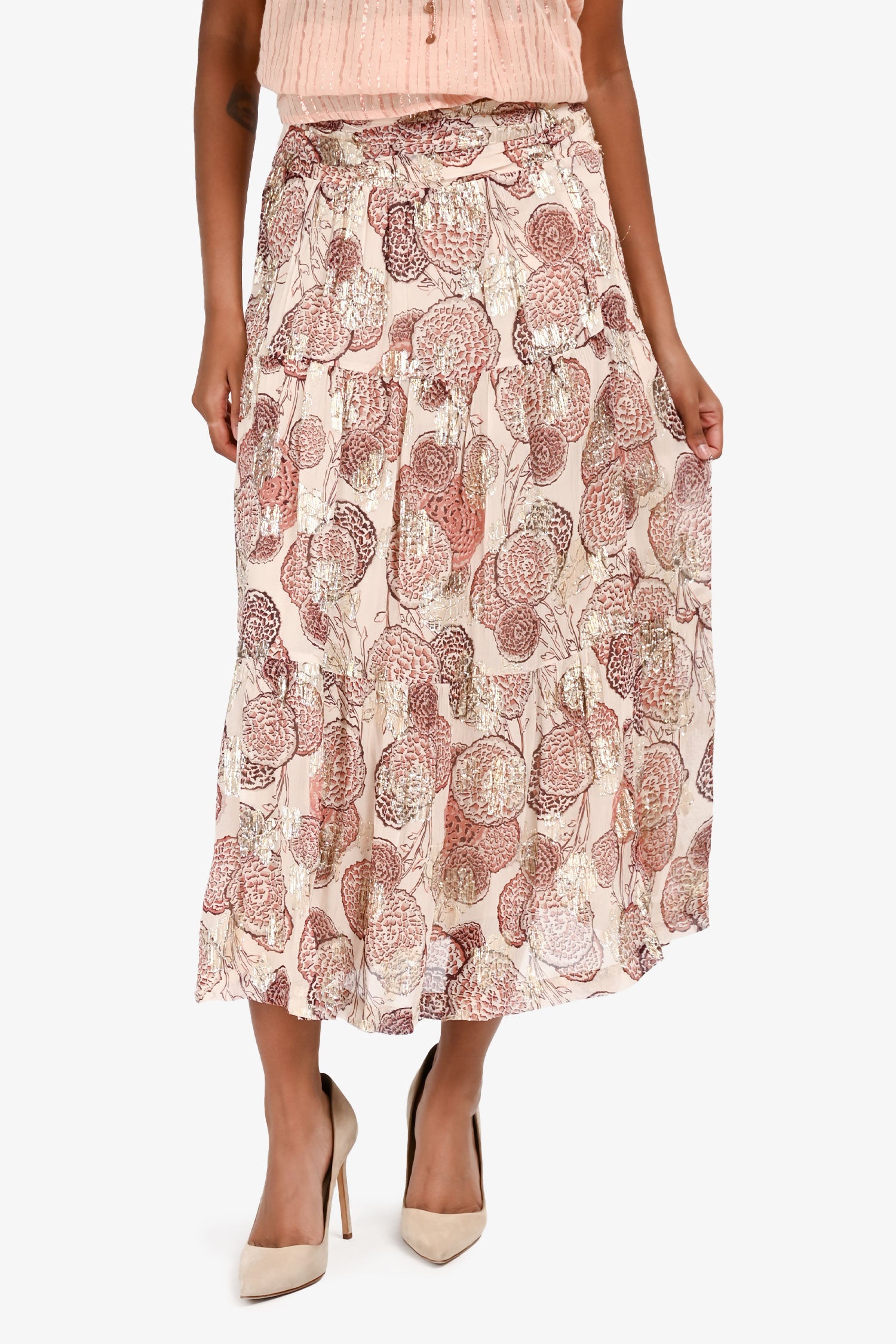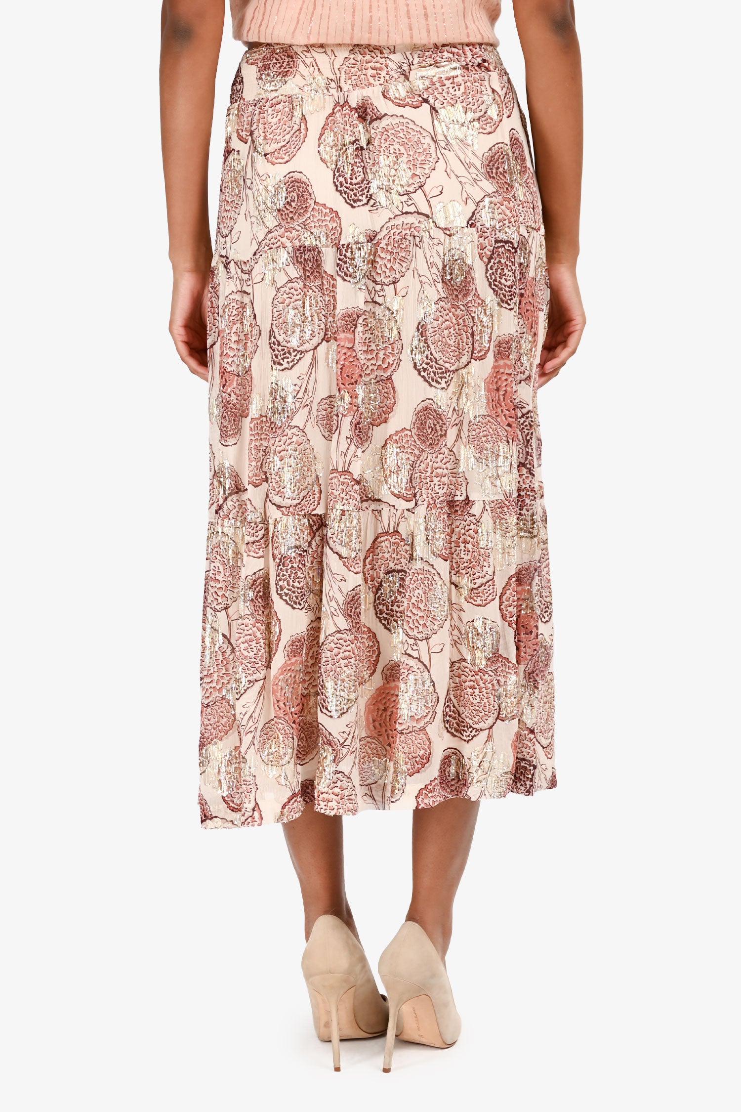 Refresh availabilityBa&sh Pink Floral Gold Detail Midi Skirt. Side zip closure. Fully lined. Tonal stitching.