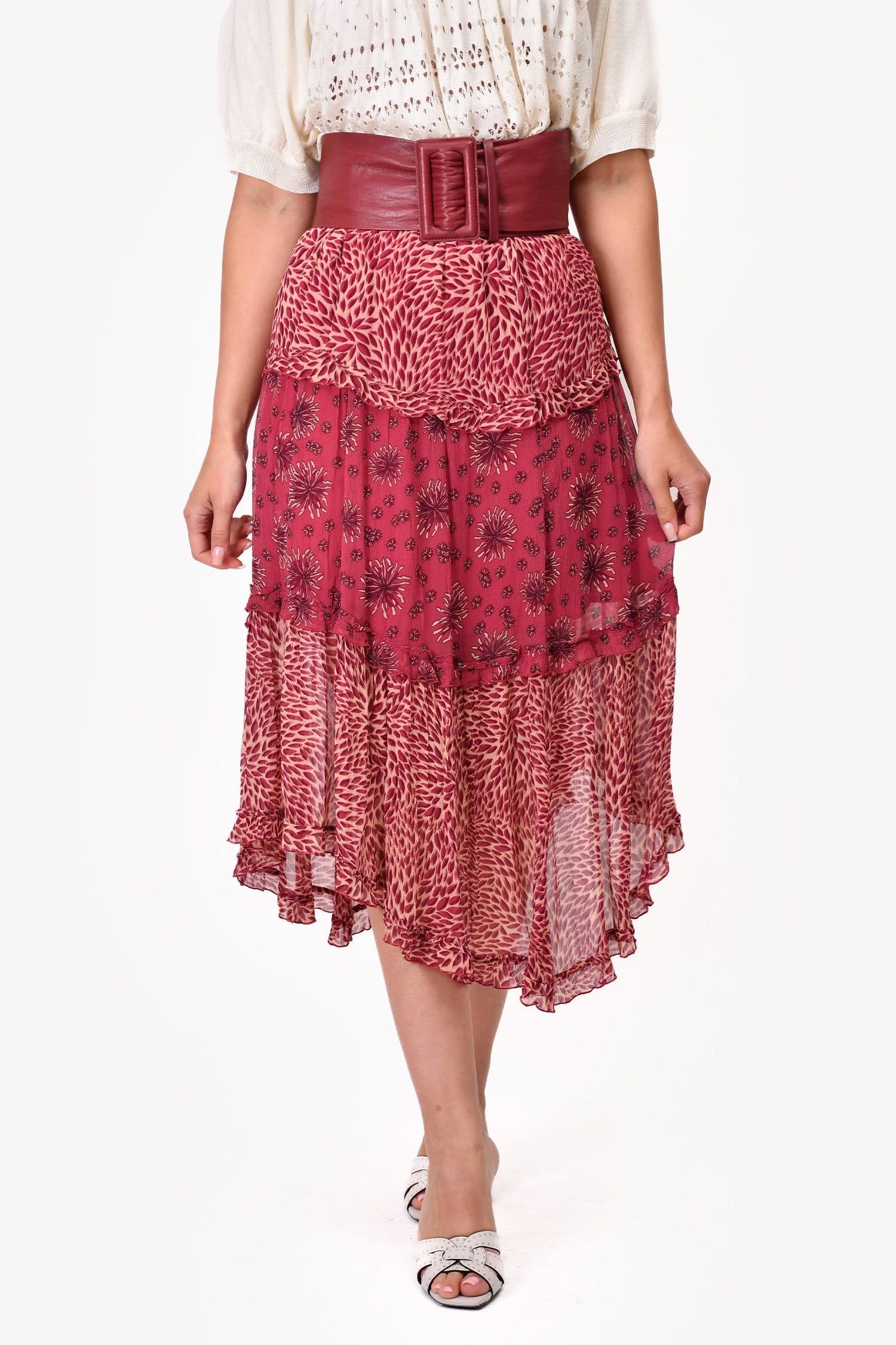 Ba&sh Purple Printed Midi Skirt with Burgundy Leather Belt Size S