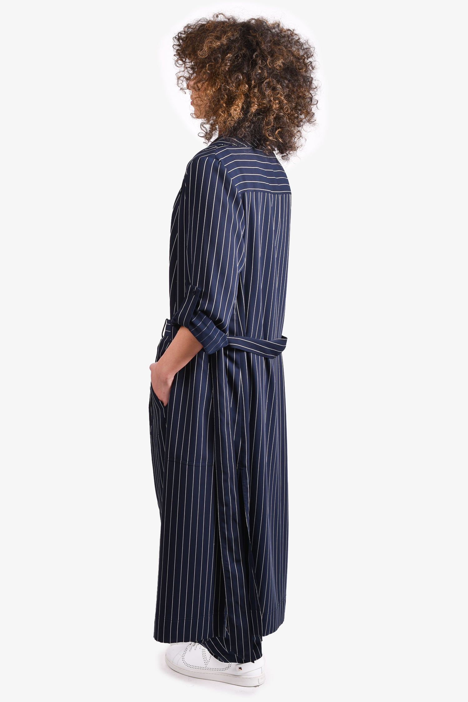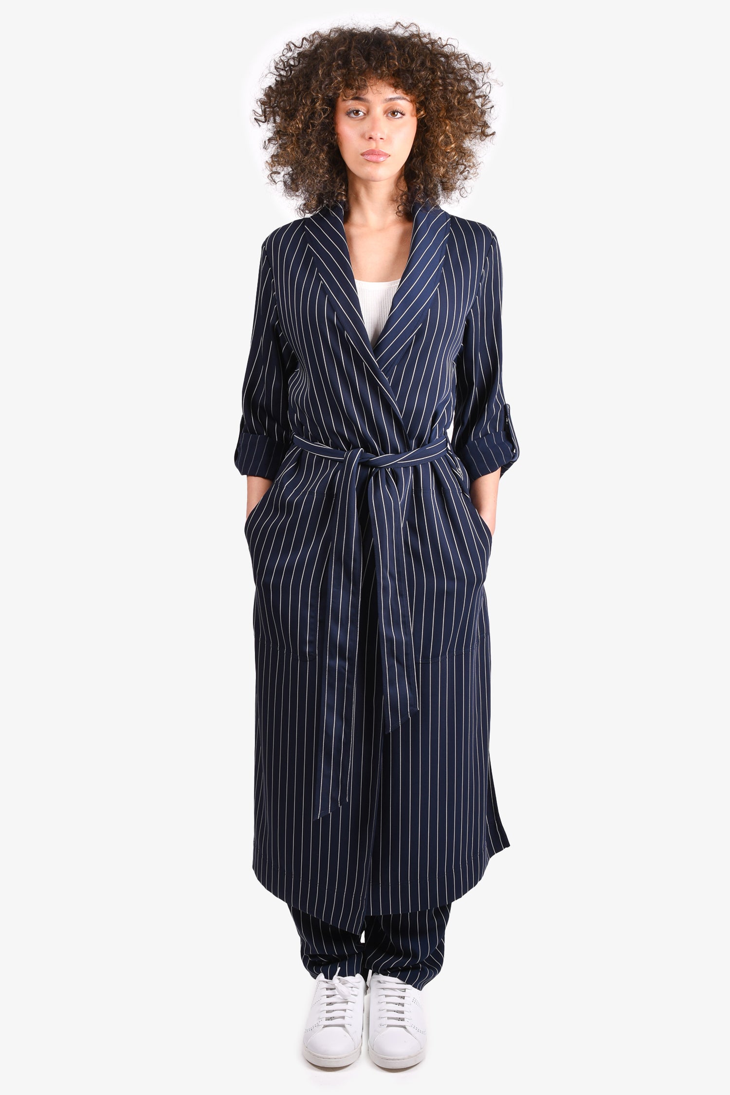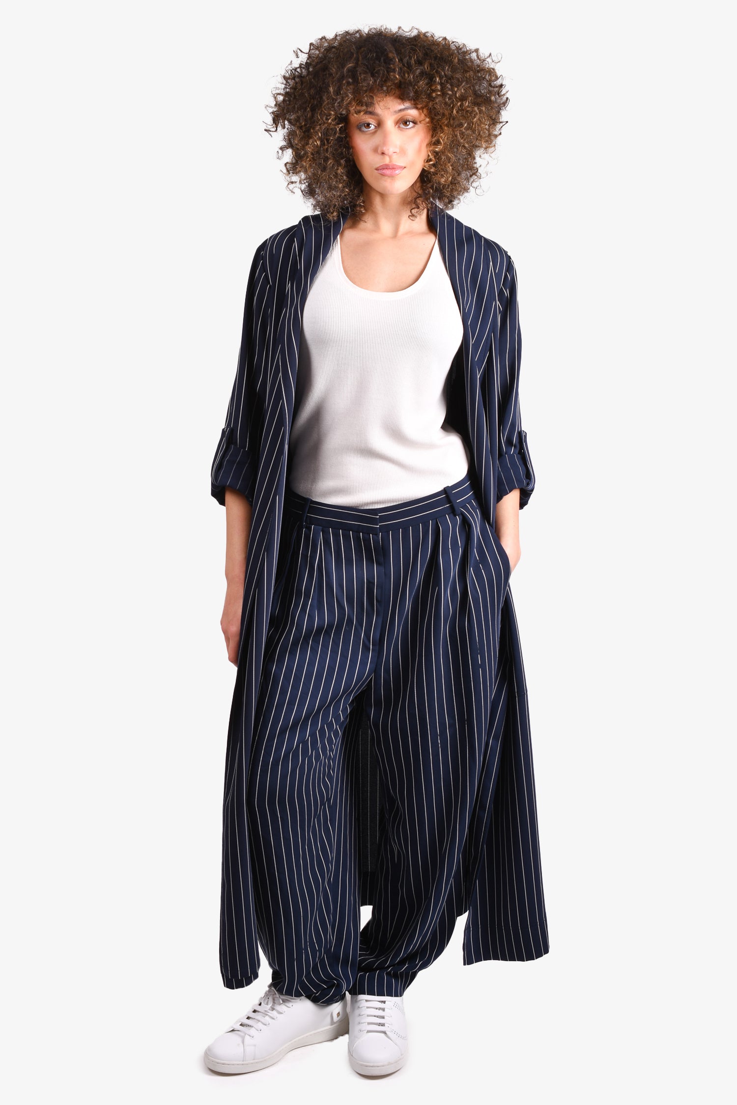 Refresh availabilityBabaton Navy/White Striped Robe with Tie + Wide Leg Trousers. Robe: Tie closure. Pants: Front zip and hook-up closure. Waist belt loops. Front pockets.