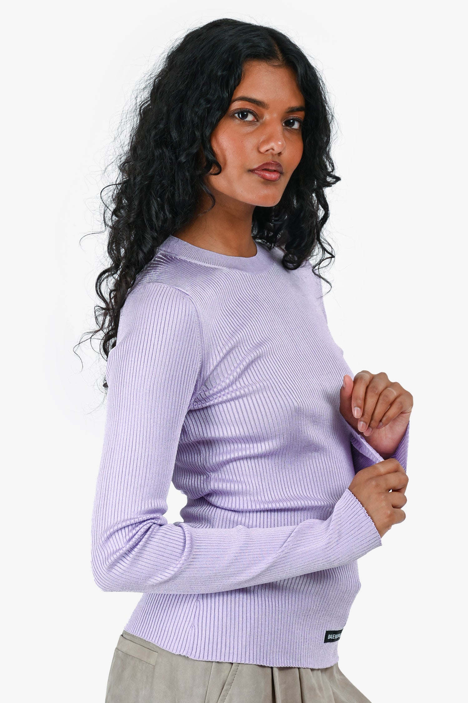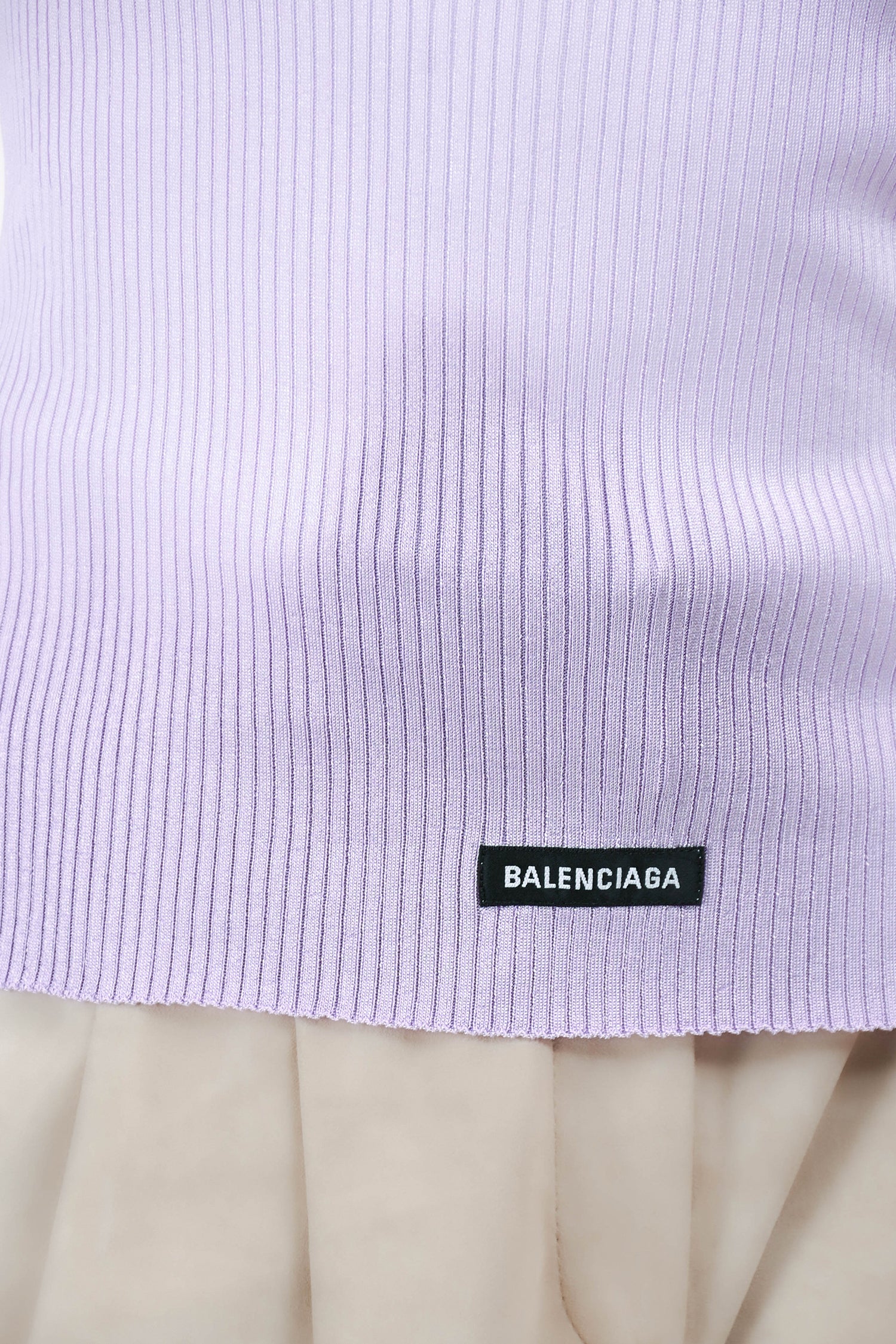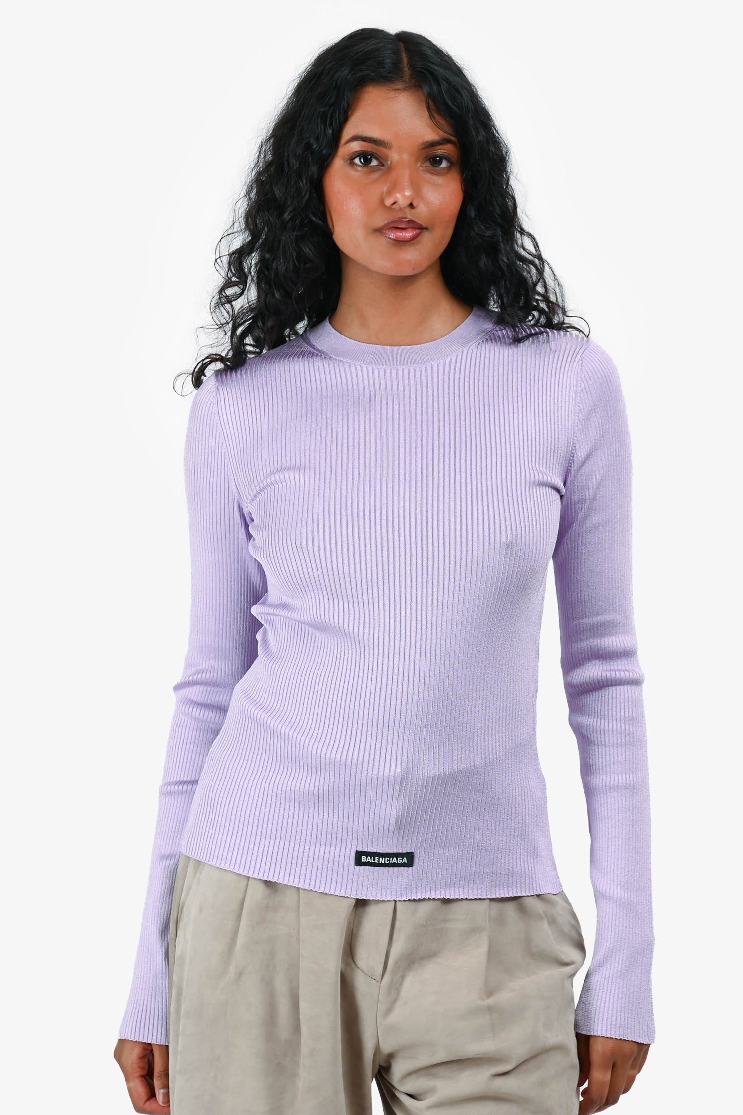 Refresh availabilityBalenciaga 2021 Purple Metallic Ribbed Knit Logo Long Sleeves Top. Crew neckline. Subtle logo detail woven into fabric. Tonal stitching.