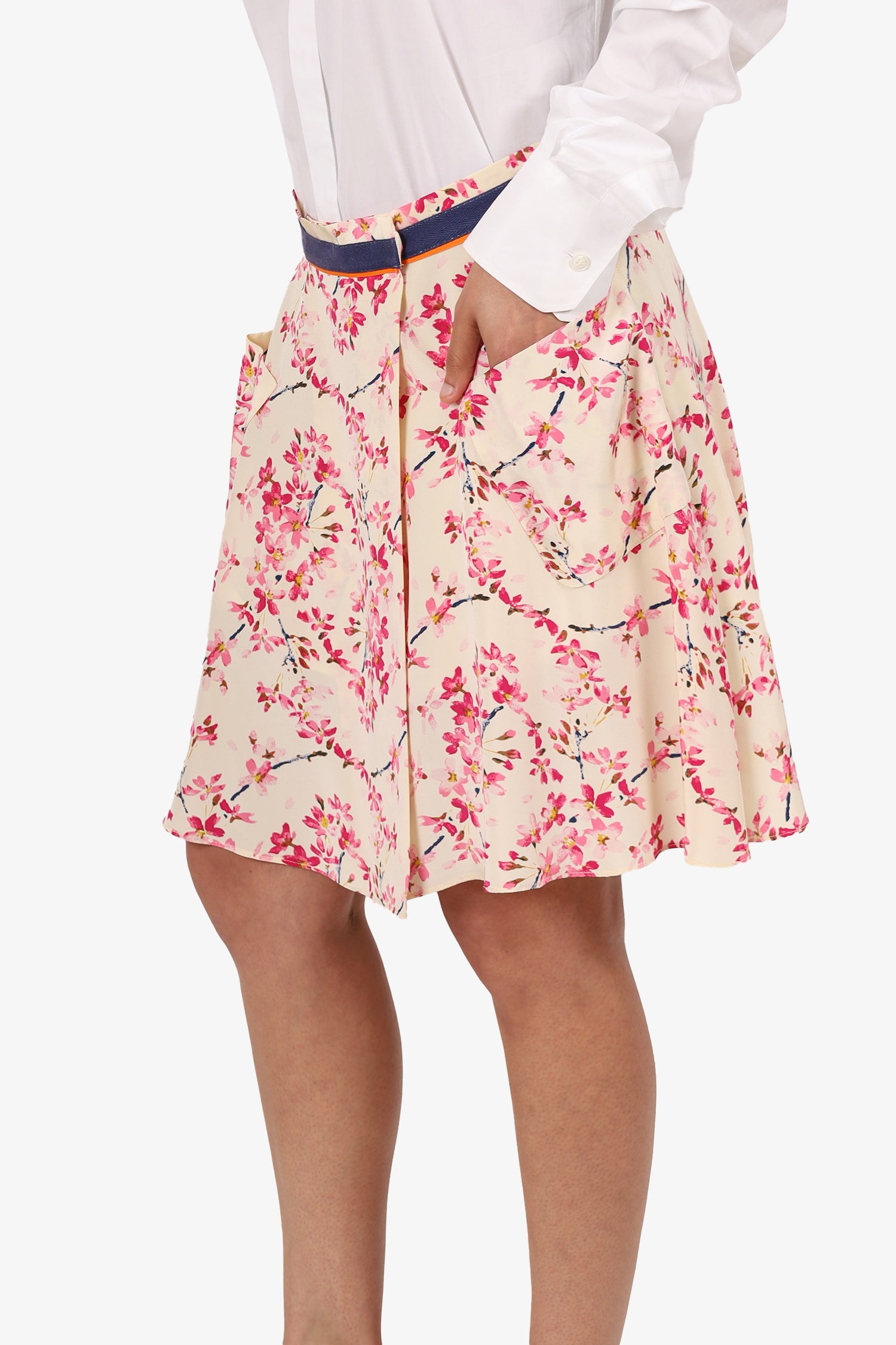 Refresh availabilityBalenciaga Beige/Pink Silk Floral Print Wrap Mini Skirt. Slip-on. Wrap design with hook and snap-button closure. 2 front exterior slip pockets. Tonal stitching.