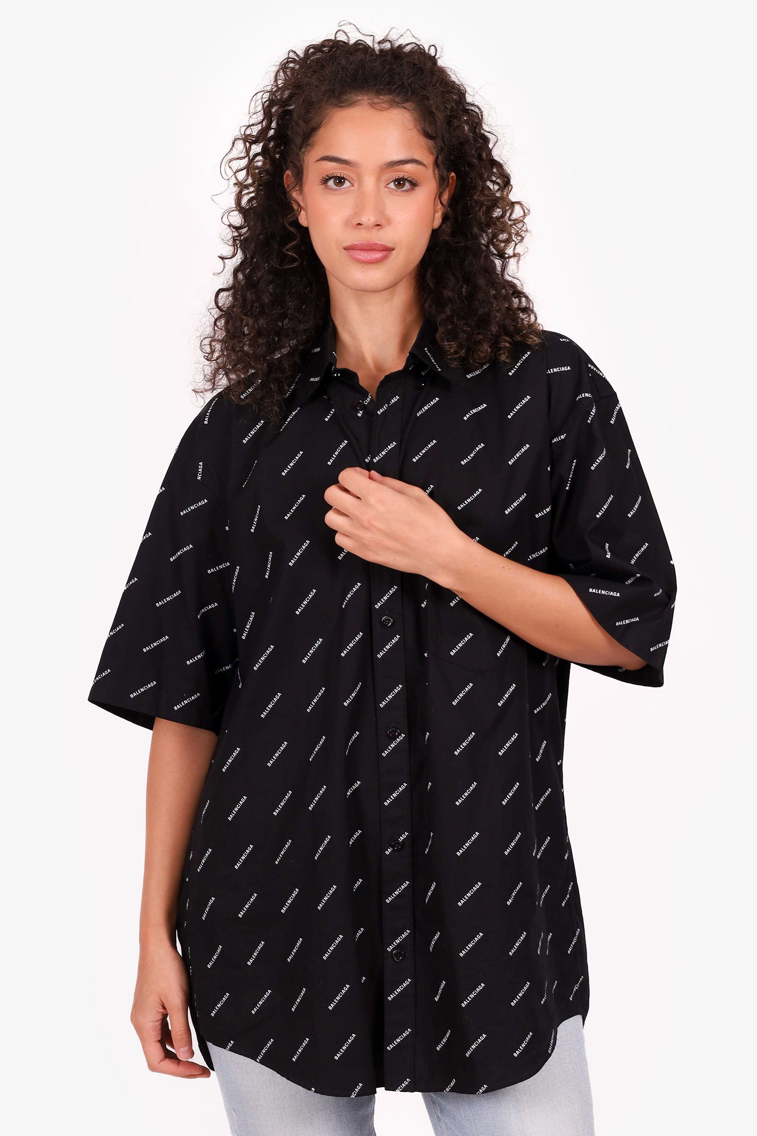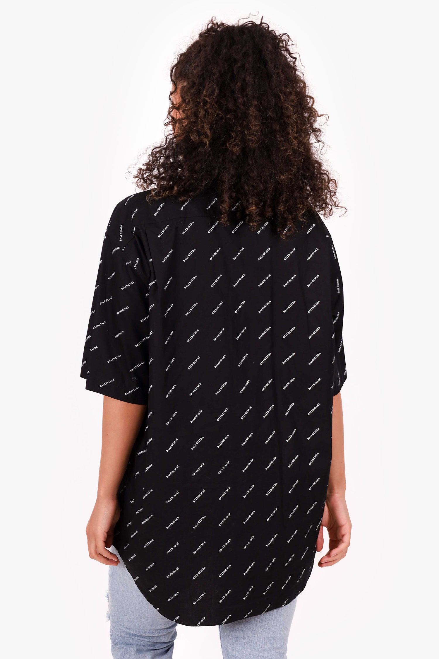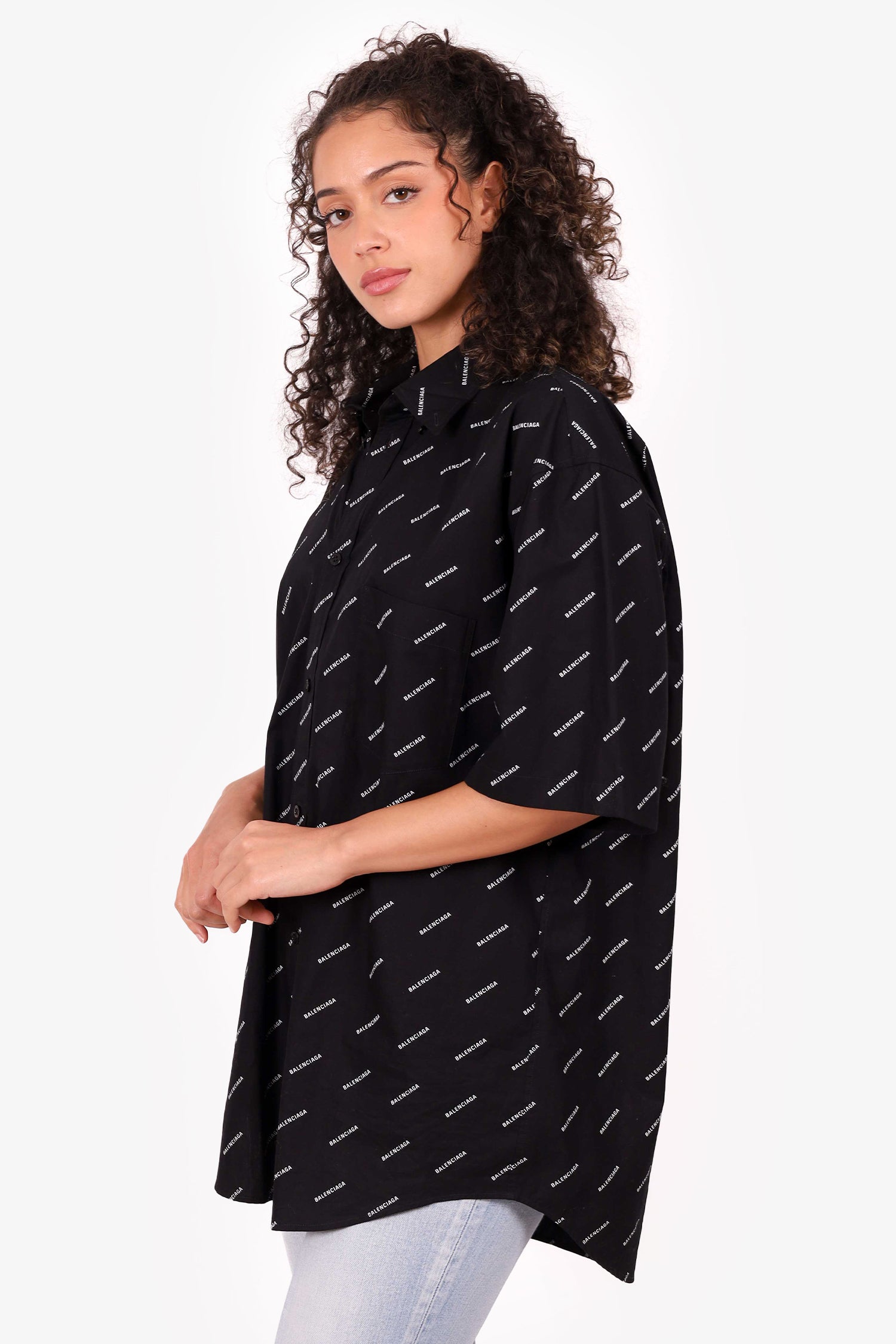 Refresh availabilityBalenciaga Black All Over Logo Print Short Sleeve Shirt. Pull-on. Collared neckline. Front button-up closure. Front single exterior slip pocket. Tonal stitching.