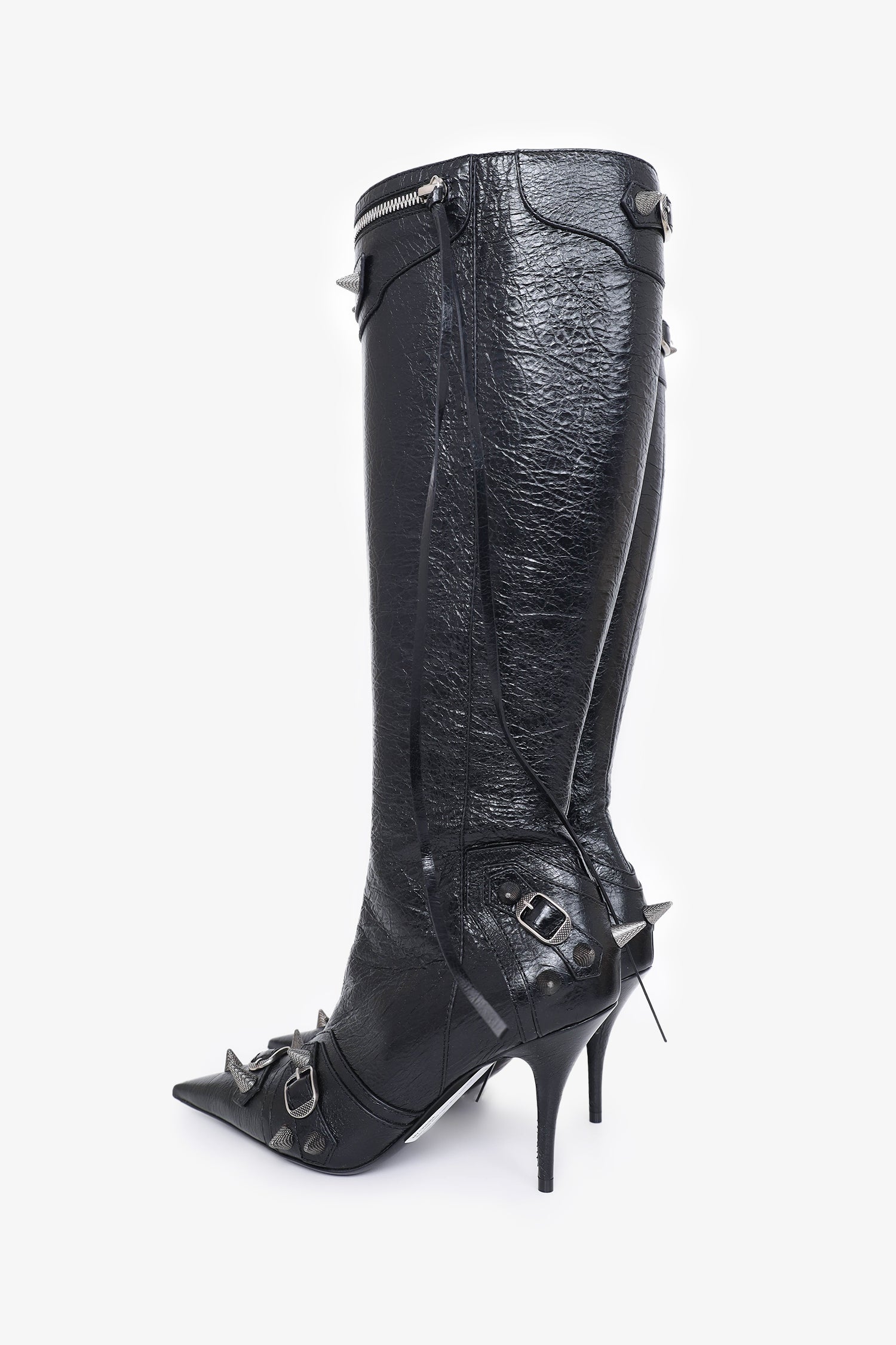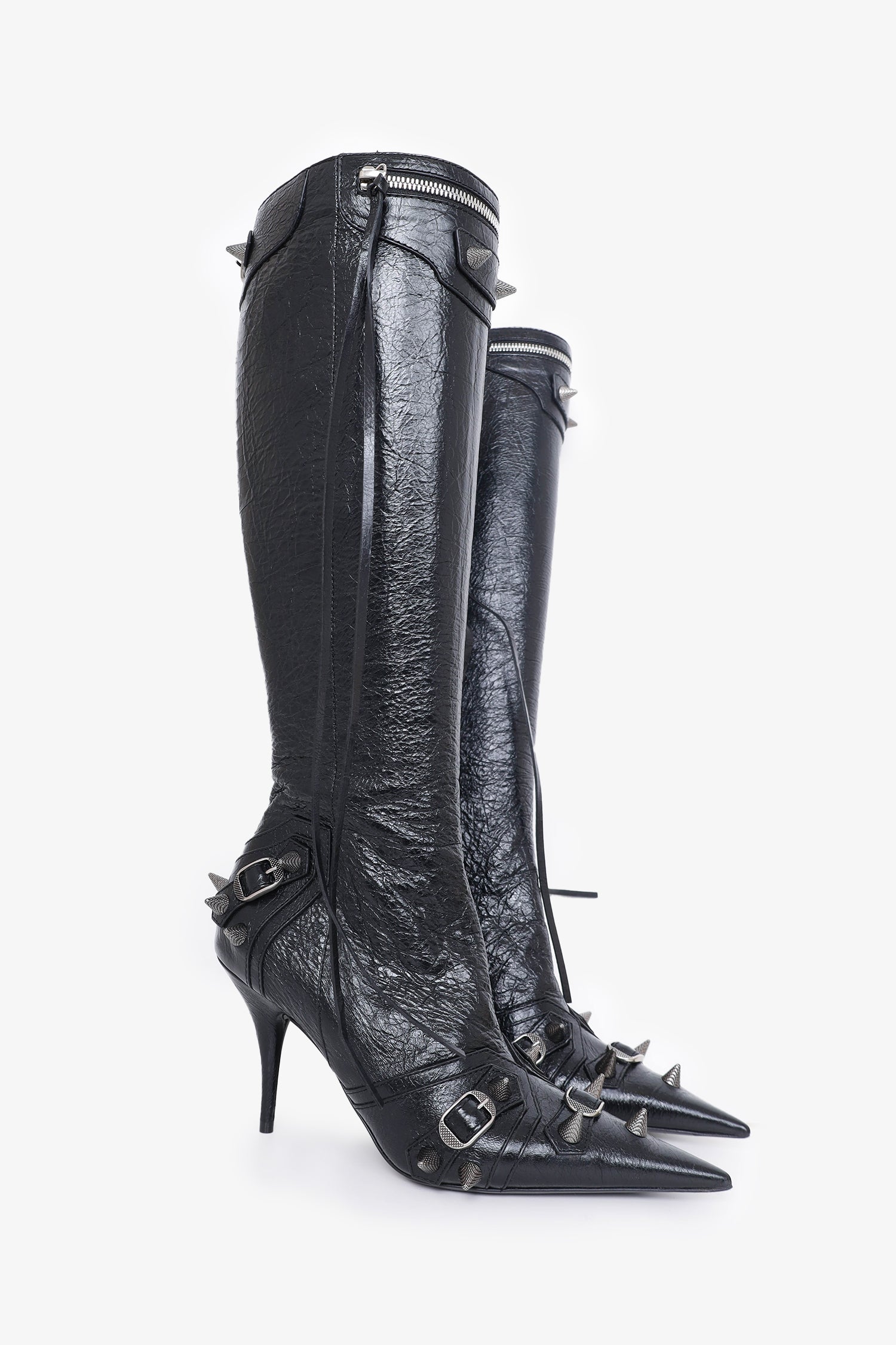 Refresh availabilityBalenciaga Black Cagole 90mm Boots. Inside side zip closures. Pointed toe. Zipper detail along front. Long tassel string on all zip closures. Silver-tone hardware. Tonal stitching.