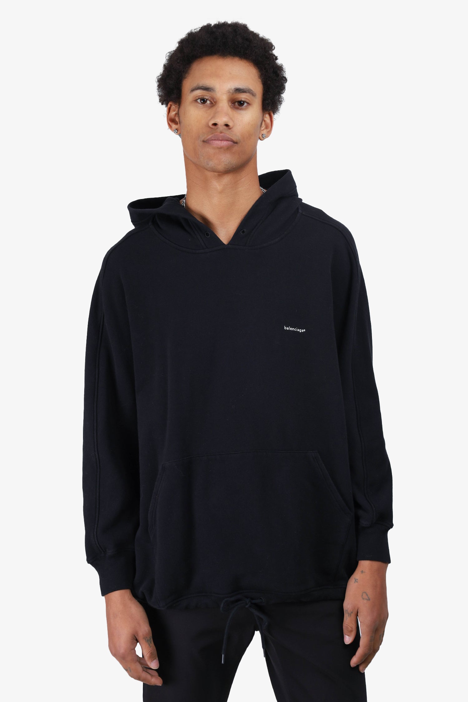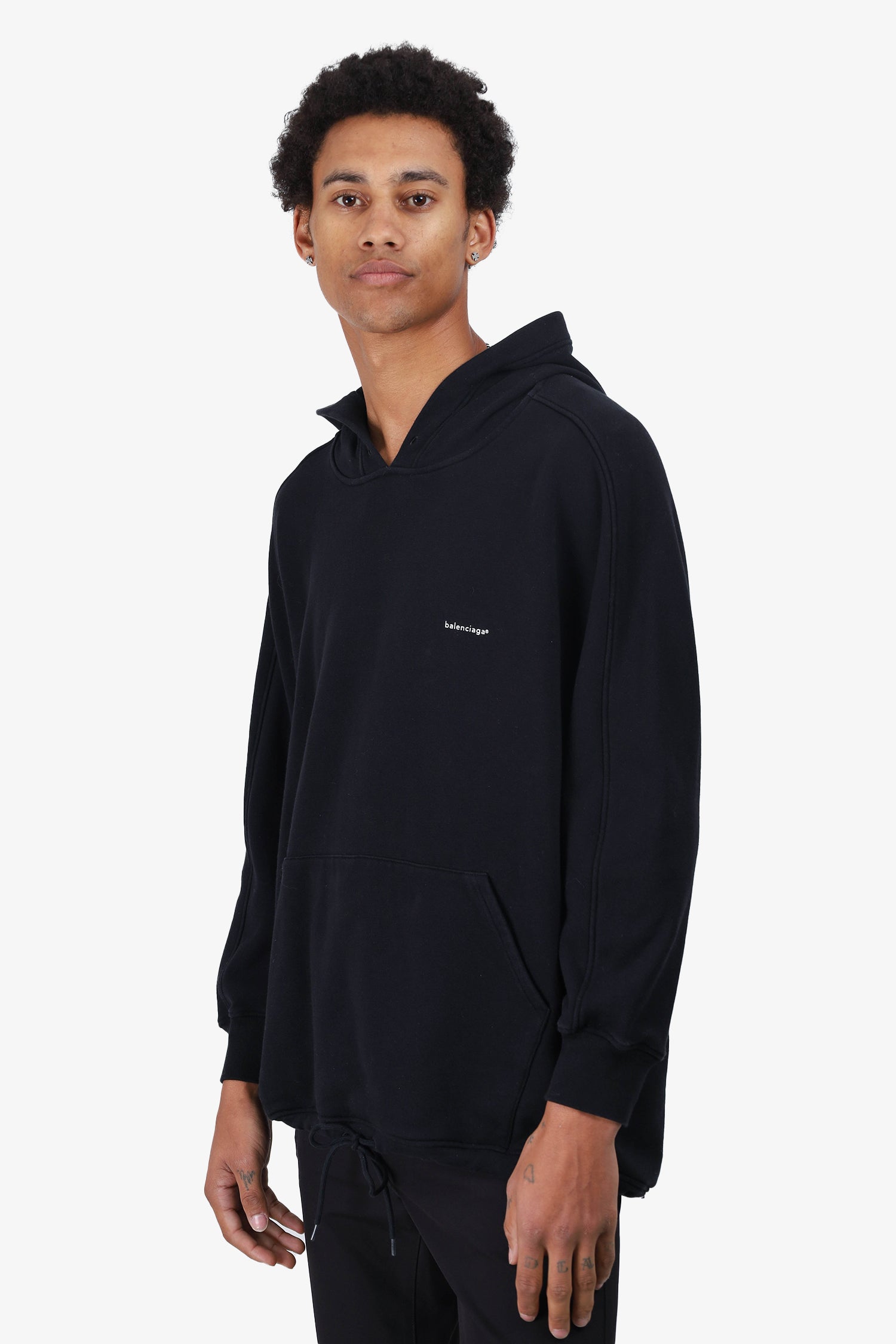 Refresh availabilityBalenciaga Black Cotton Logo Print Hoodie. Pull-on. Front slip pocket. Ribbed sleeve cuffs. High-low drawstring on bottom hem. Lined. Tonal stitching.