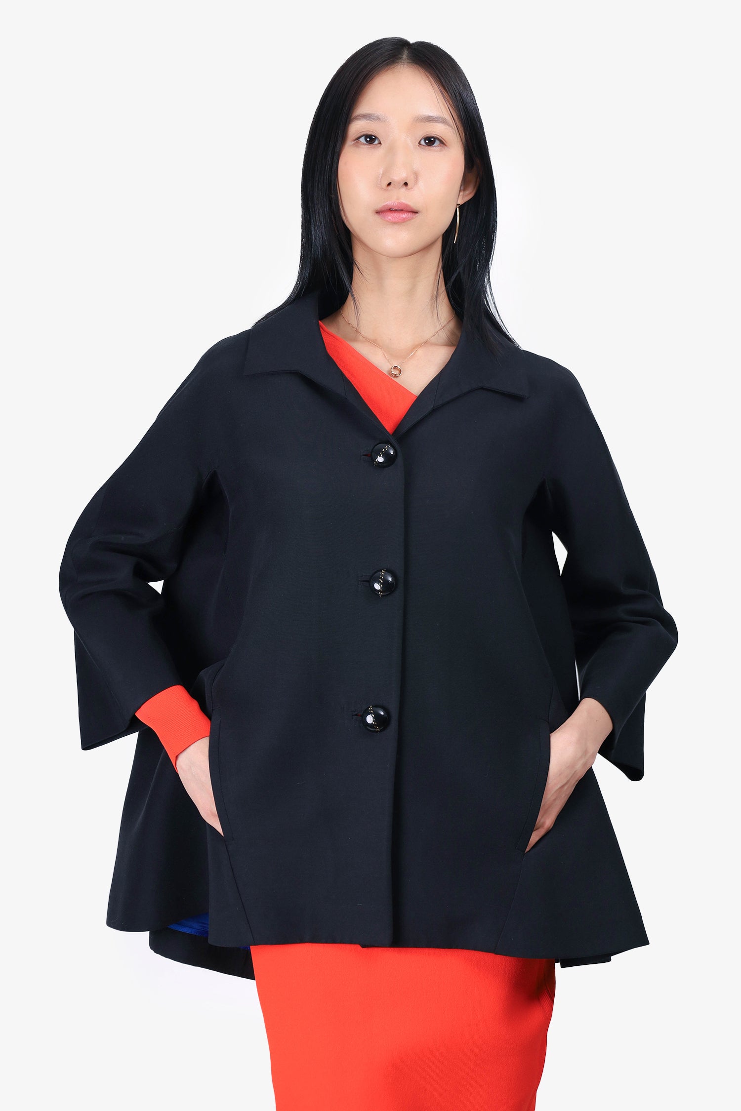 Refresh availabilityBalenciaga Black Cotton/Silk Oversized Jacket. Collared neckline. Front button-up closure. Shortened sleeve length. 2 front slip pockets. Lined. Tonal stitching.