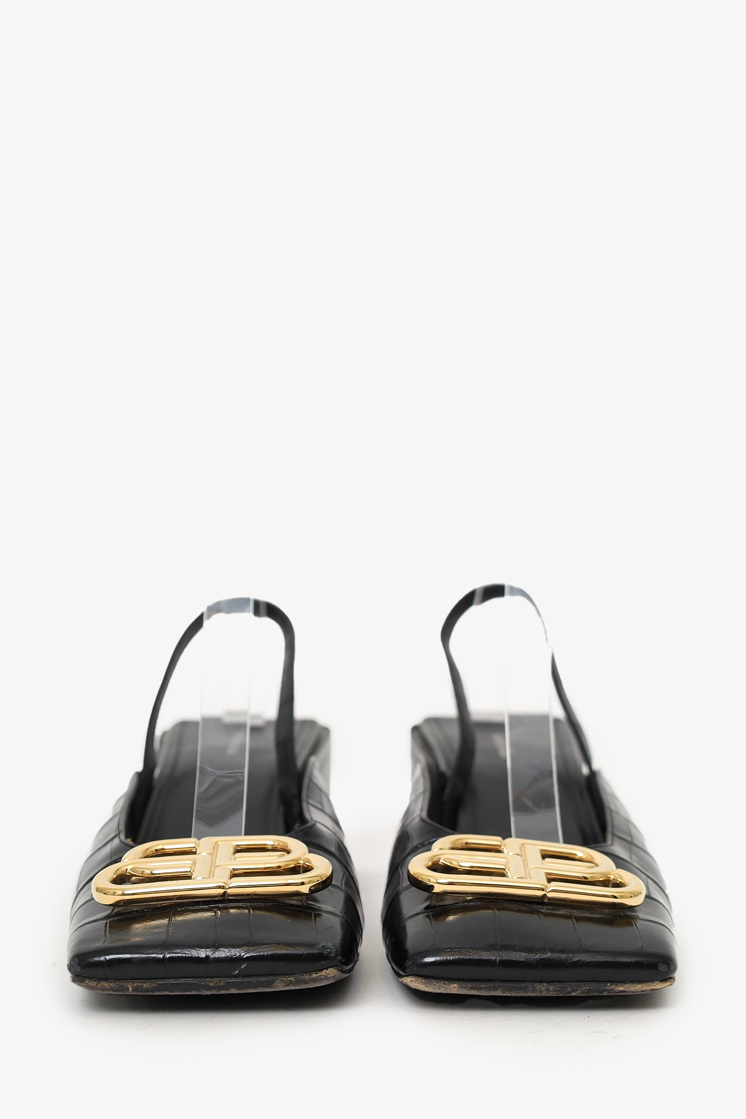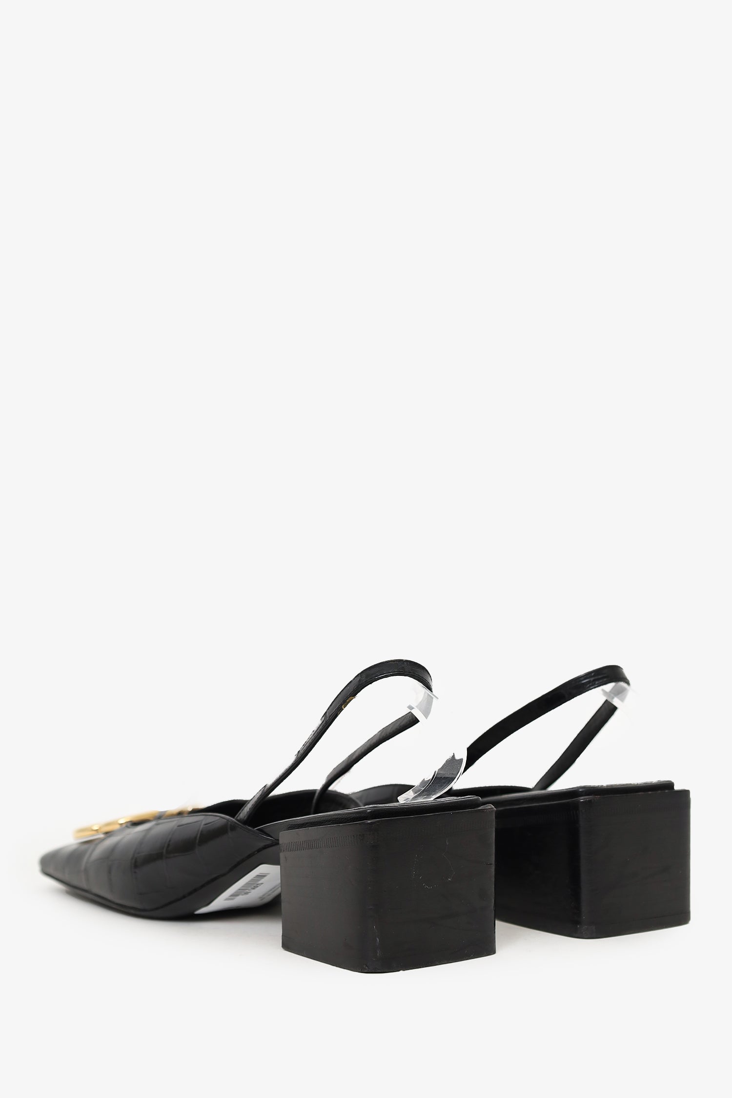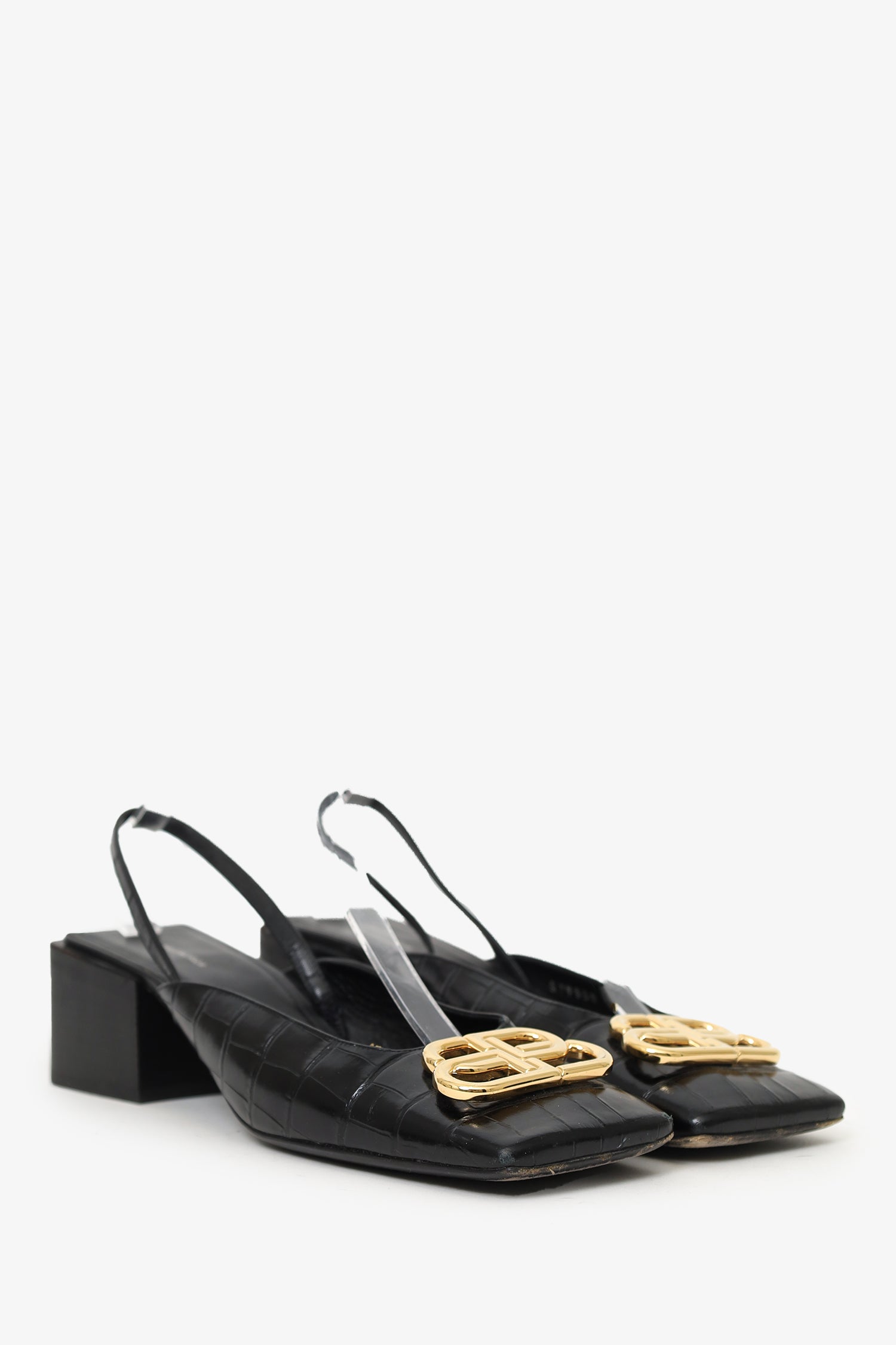 Refresh availabilityBalenciaga Black Croc Embossed BB Logo Square Toe Slingback Sandals. Slip-on. Squared-toe. Elasticated slingback. Gold-tone hardware. Tonal stitching.