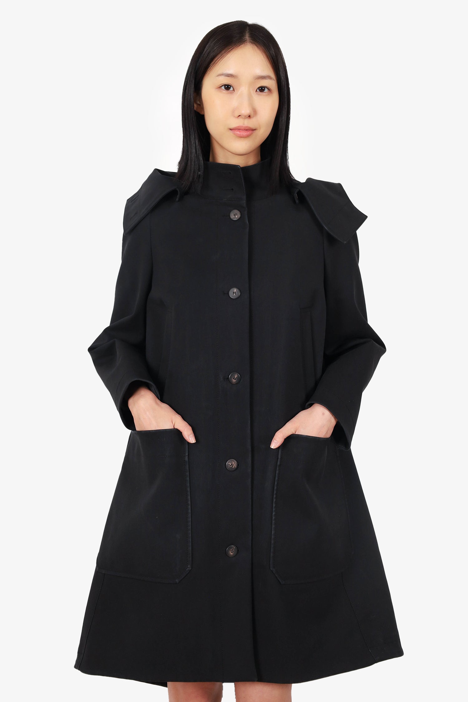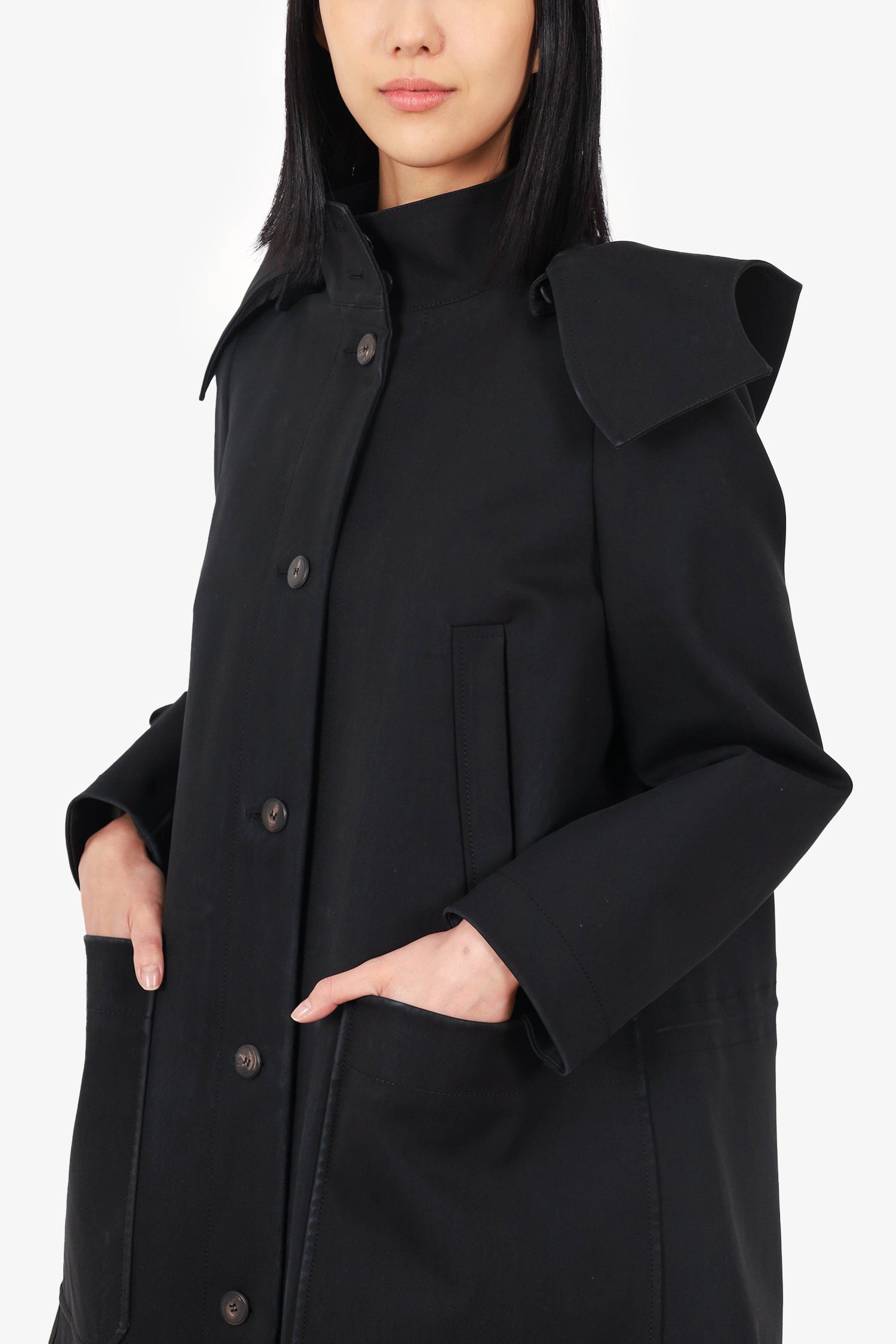 Refresh availabilityBalenciaga Black Front Pocket Detail Parka with Removable Hood. Front button-up closure. 2 front slip pockets. Rear vent with cinching tabs. Unlined. Tonal stitching.