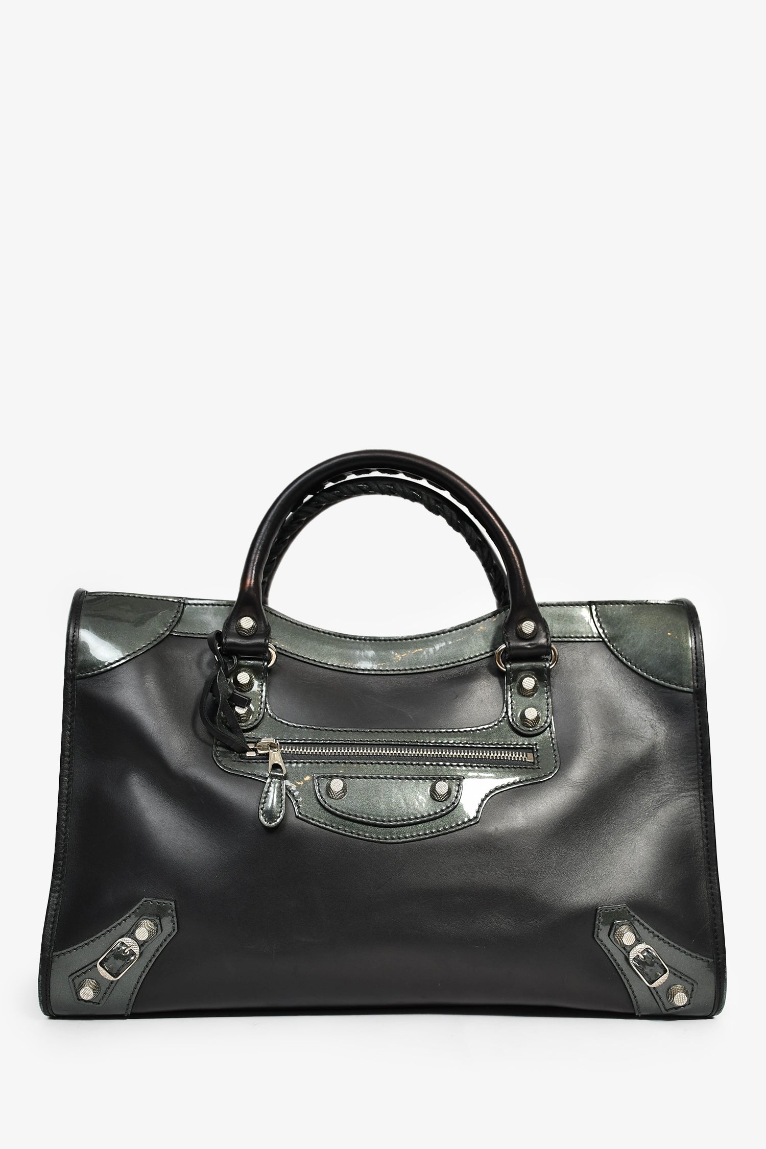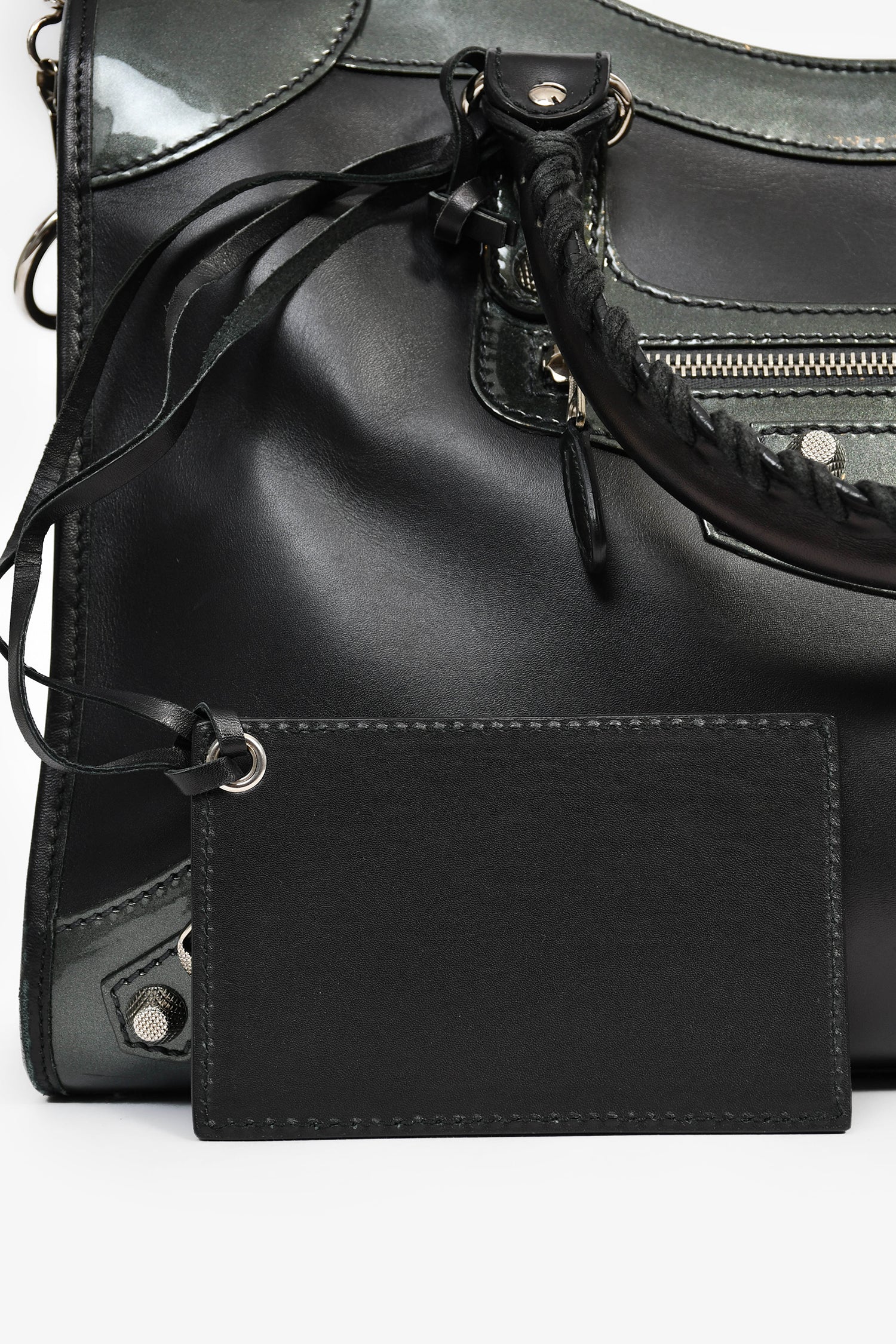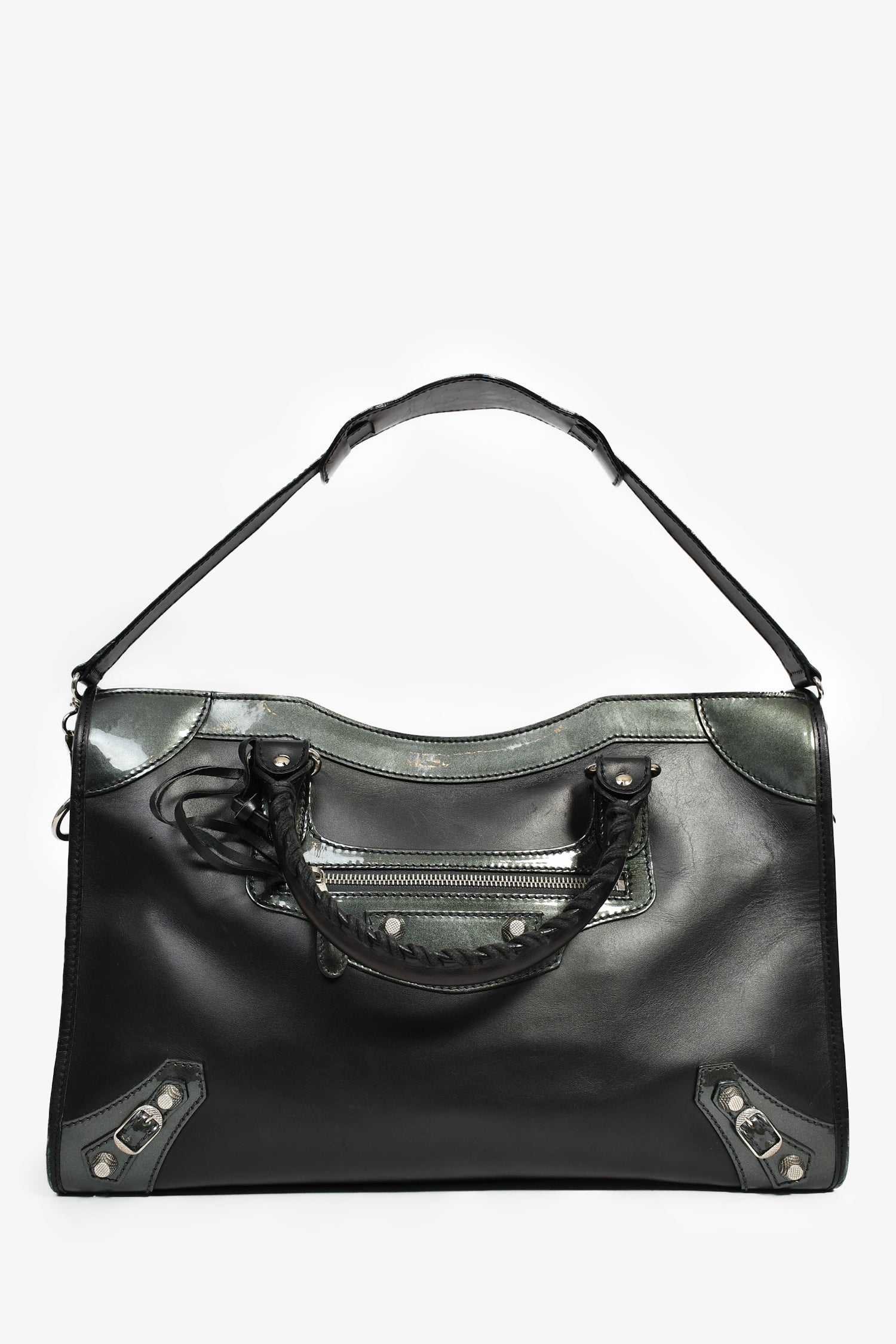 Refresh availabilityBalenciaga Black Leather '12 Nickel City' Bag with Strap. Dual handles with braided trims. Front exterior zip pocket. Top zip closure. Tonal textile interior lining. Three interior wall pockets; two slip and one with zip closure. Detachable and adjustable strap. Detachable mini mirror. Silver-tone hardware.