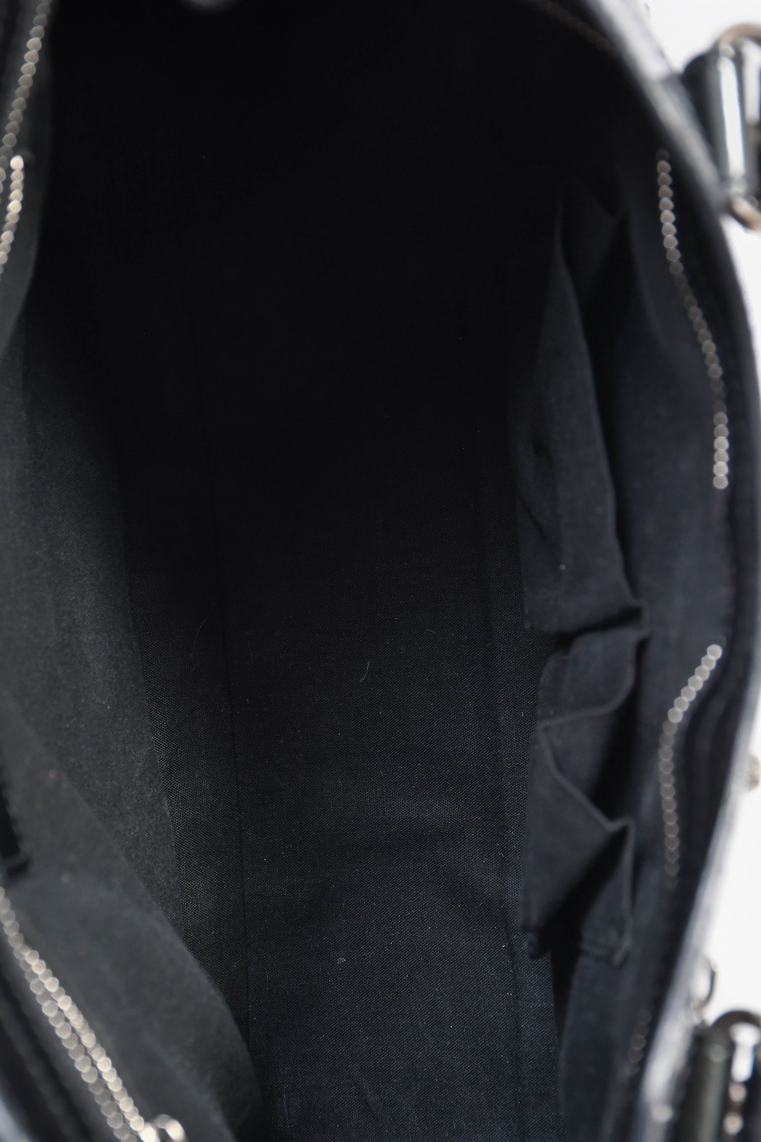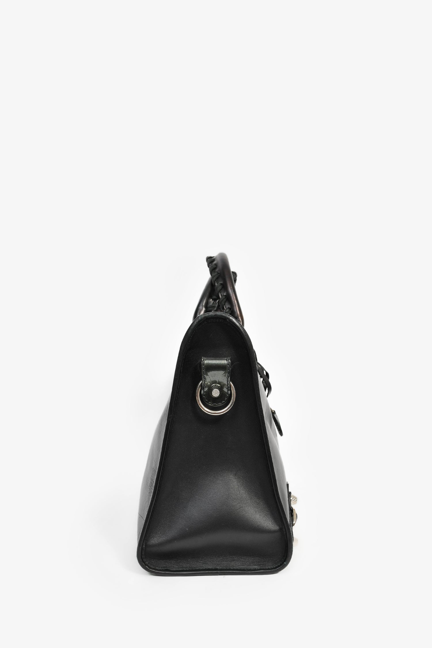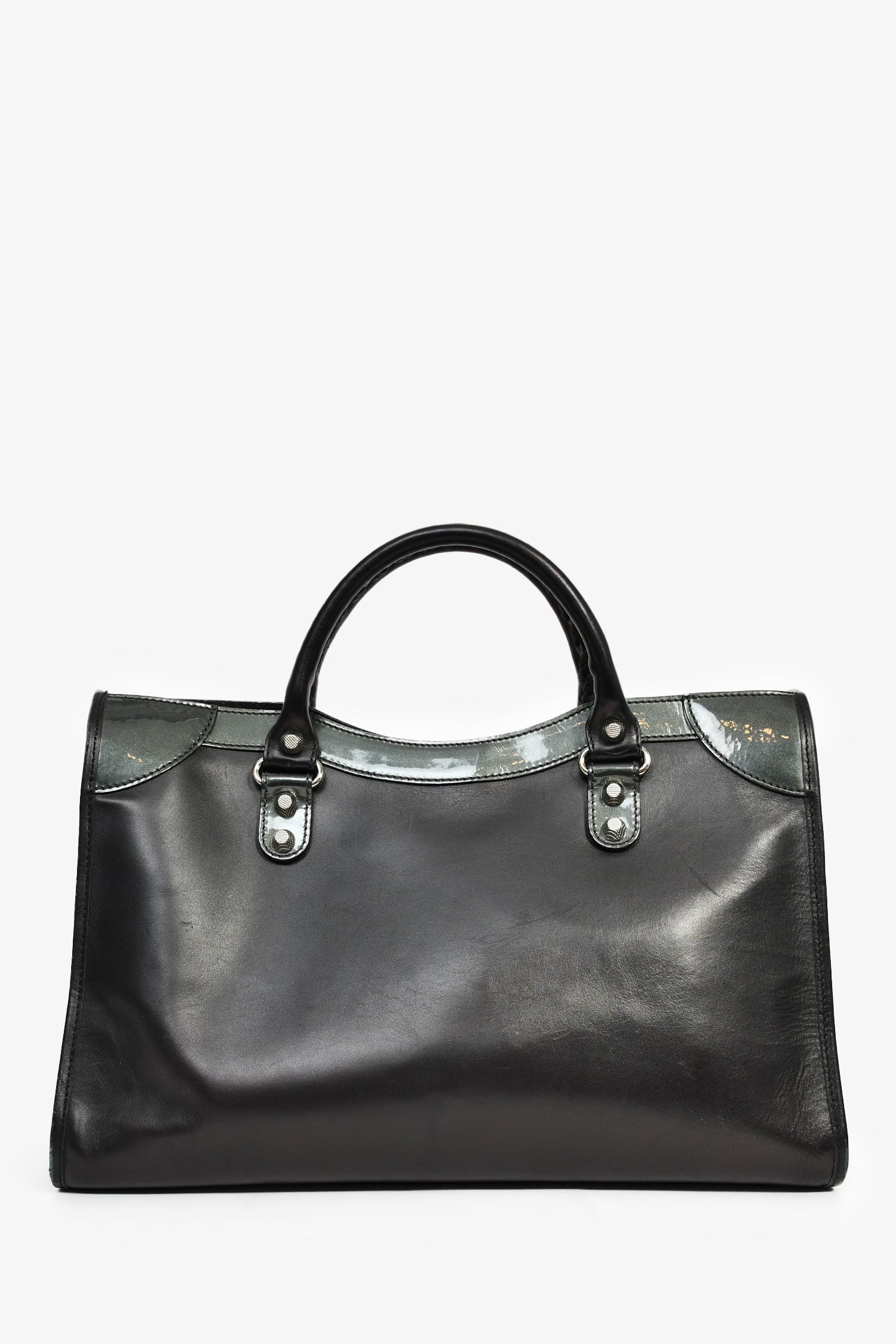 Refresh availabilityBalenciaga Black Leather '12 Nickel City' Bag with Strap. Dual handles with braided trims. Front exterior zip pocket. Top zip closure. Tonal textile interior lining. Three interior wall pockets; two slip and one with zip closure. Detachable and adjustable strap. Detachable mini mirror. Silver-tone hardware.