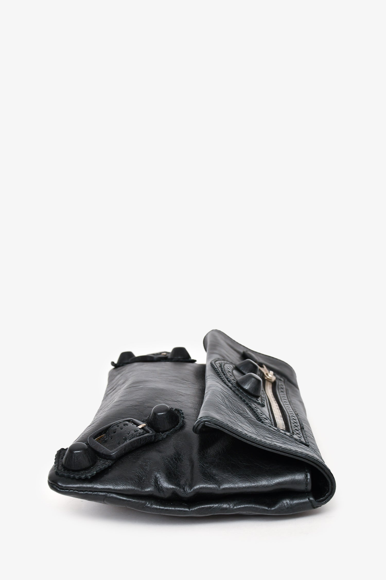 Refresh availabilityBalenciaga Black Leather City Brougues Envelope Clutch. Fold-over flap with concealed magnetic closure. Distinctive front zipper pocket with leather pull tab. Two open compartments on the interior. Silver-tone hardware. Tonal stitching.
