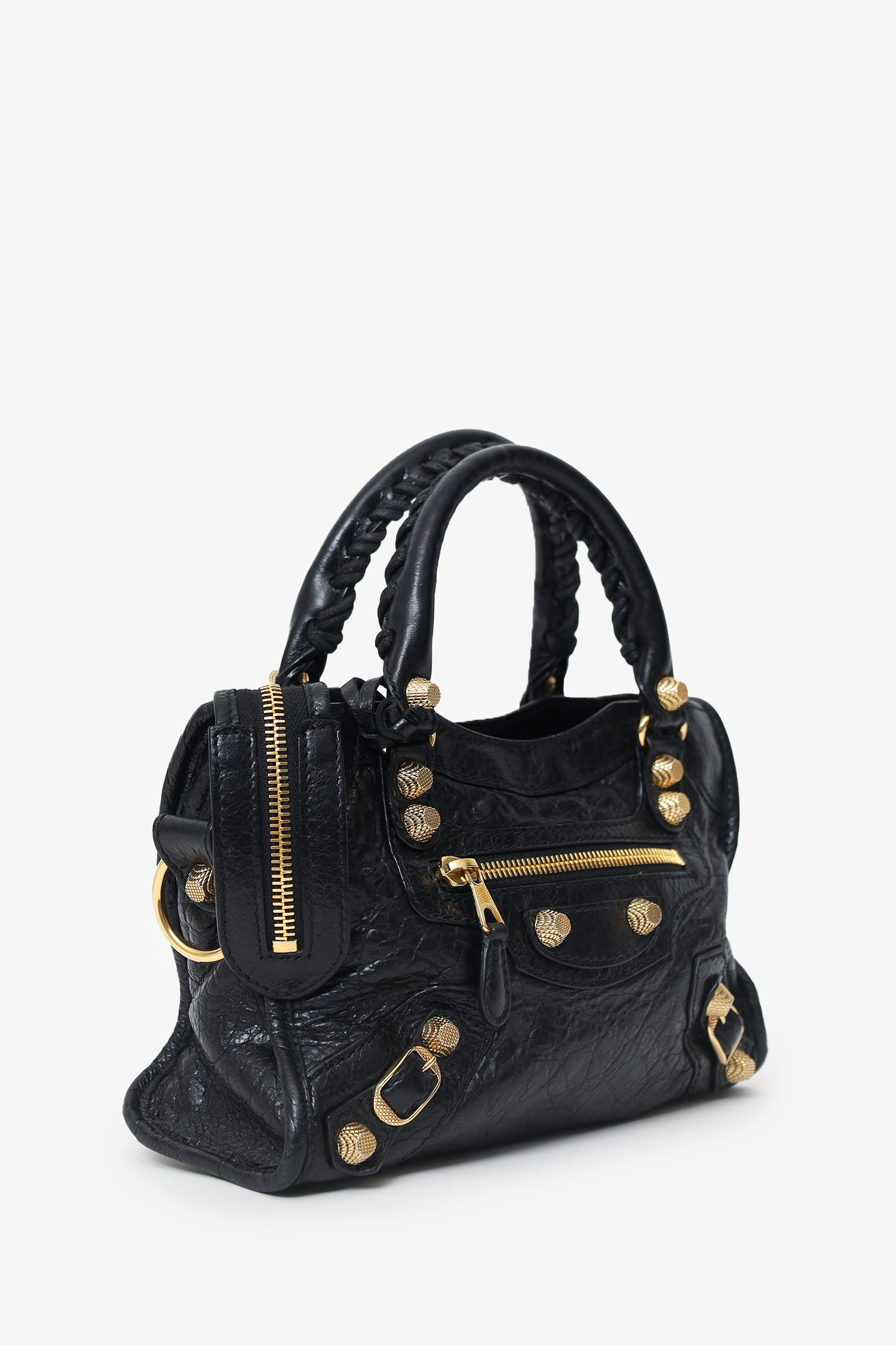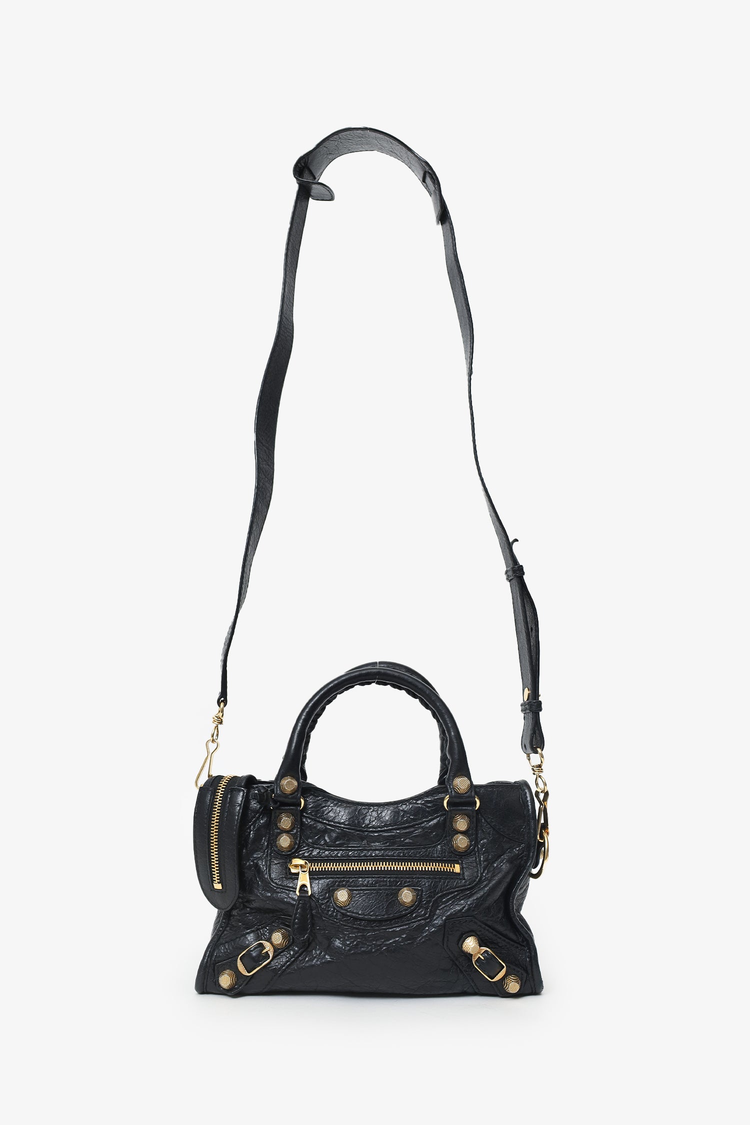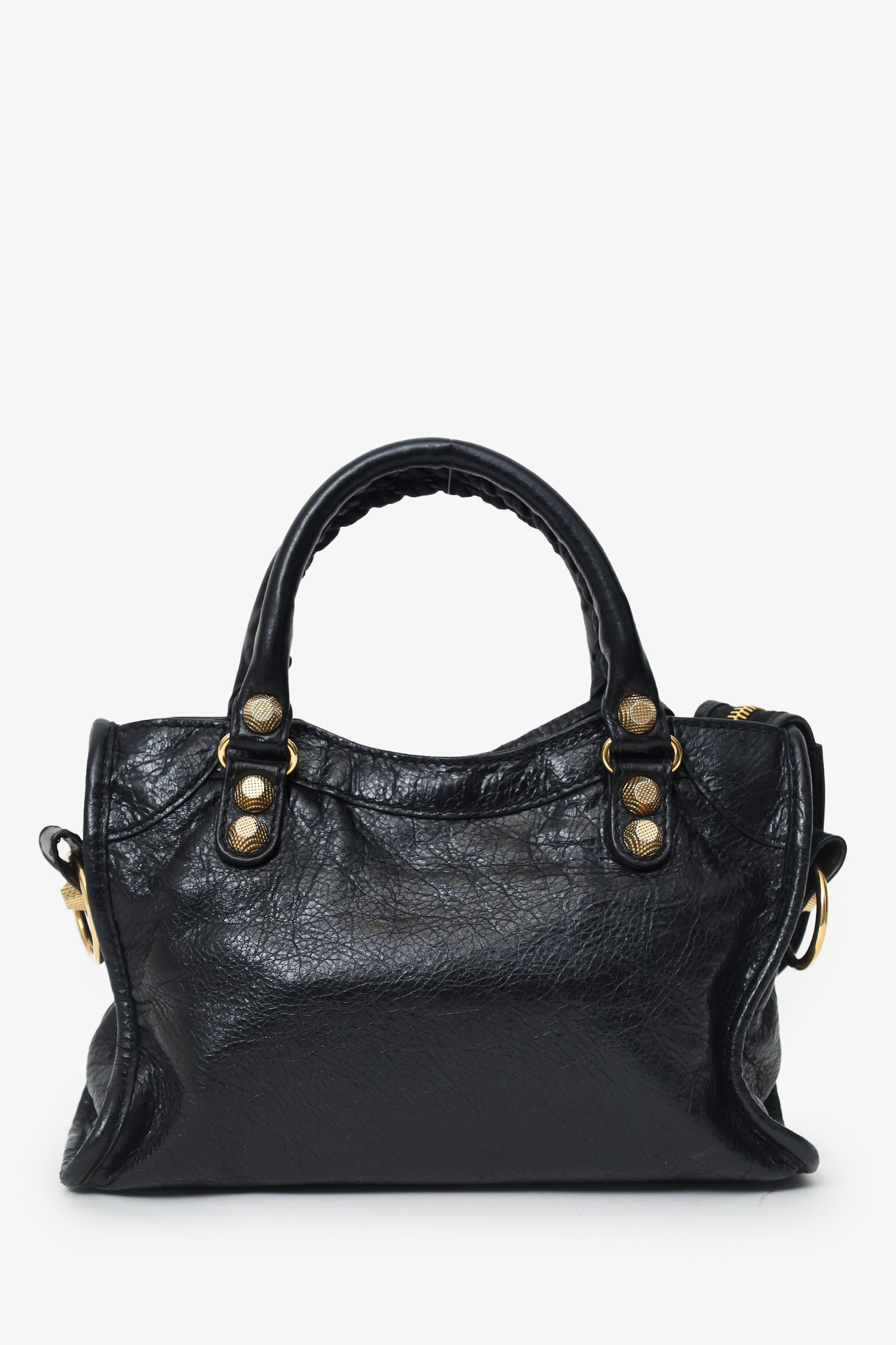 Refresh availabilityBalenciaga Black Leather Giant 12 Mini City Bag With GHW. Top zip closure. Twin top handles. Removable strap with adjustable push-pin closure. Lined interior. Single interior zip pocket. Gold-tone hardware. Tonal stitching.