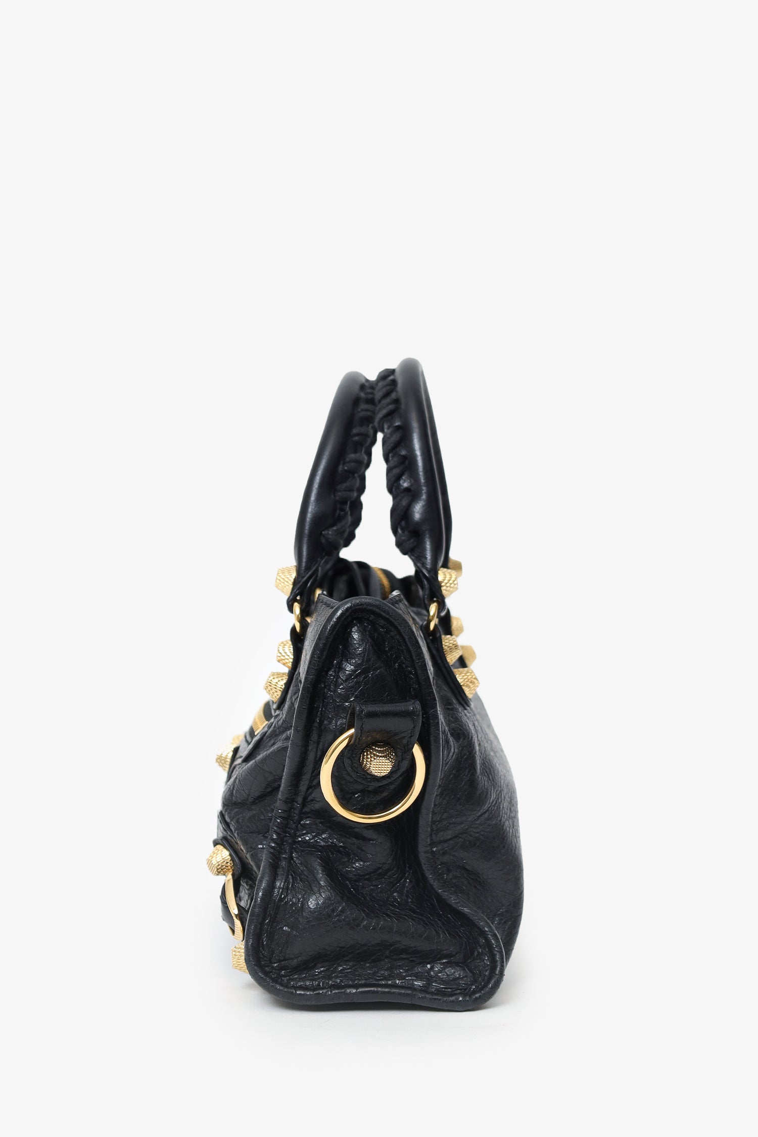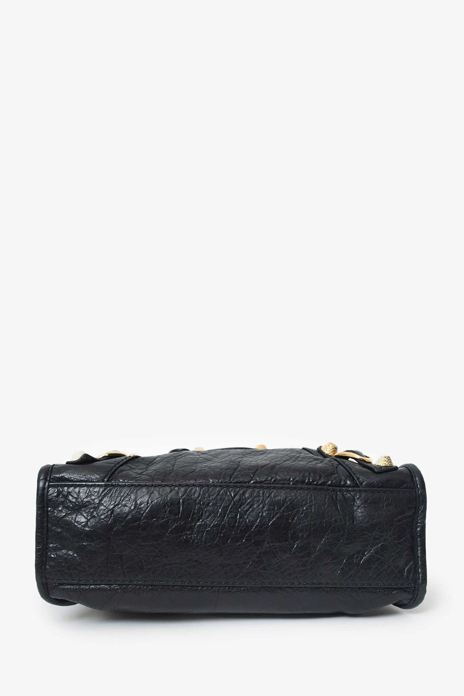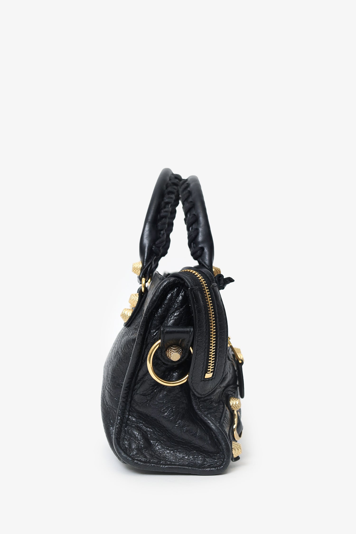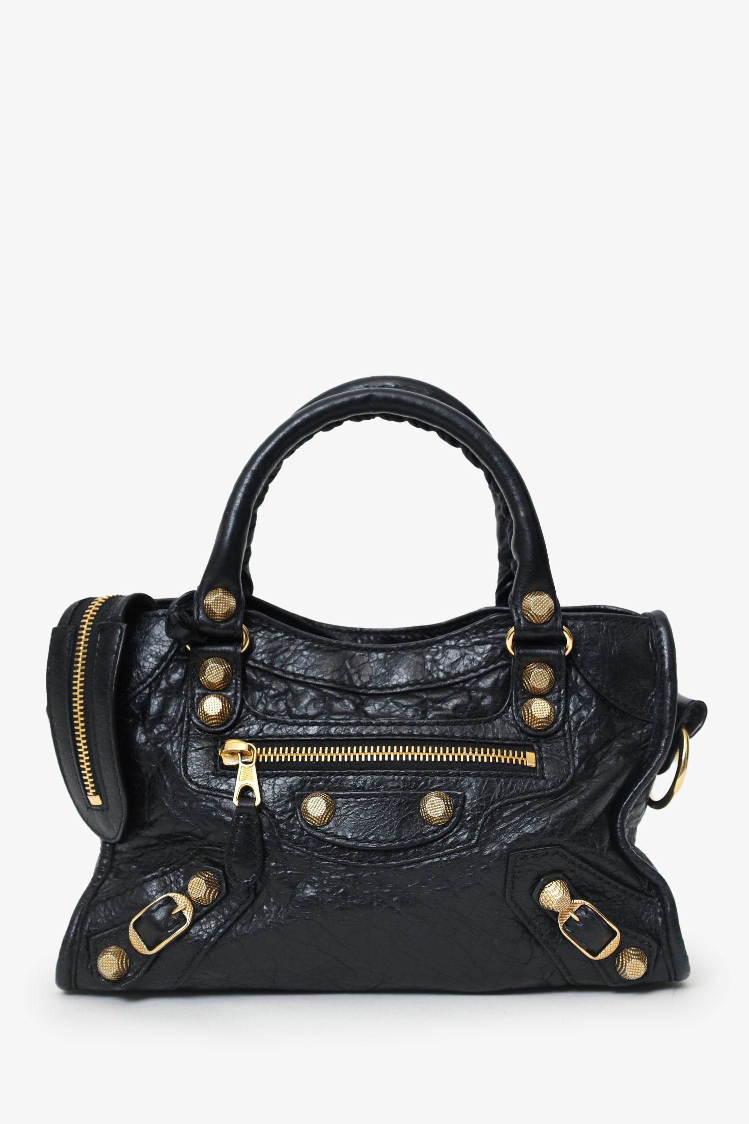 Refresh availabilityBalenciaga Black Leather Giant 12 Mini City Bag With GHW. Top zip closure. Twin top handles. Removable strap with adjustable push-pin closure. Lined interior. Single interior zip pocket. Gold-tone hardware. Tonal stitching.