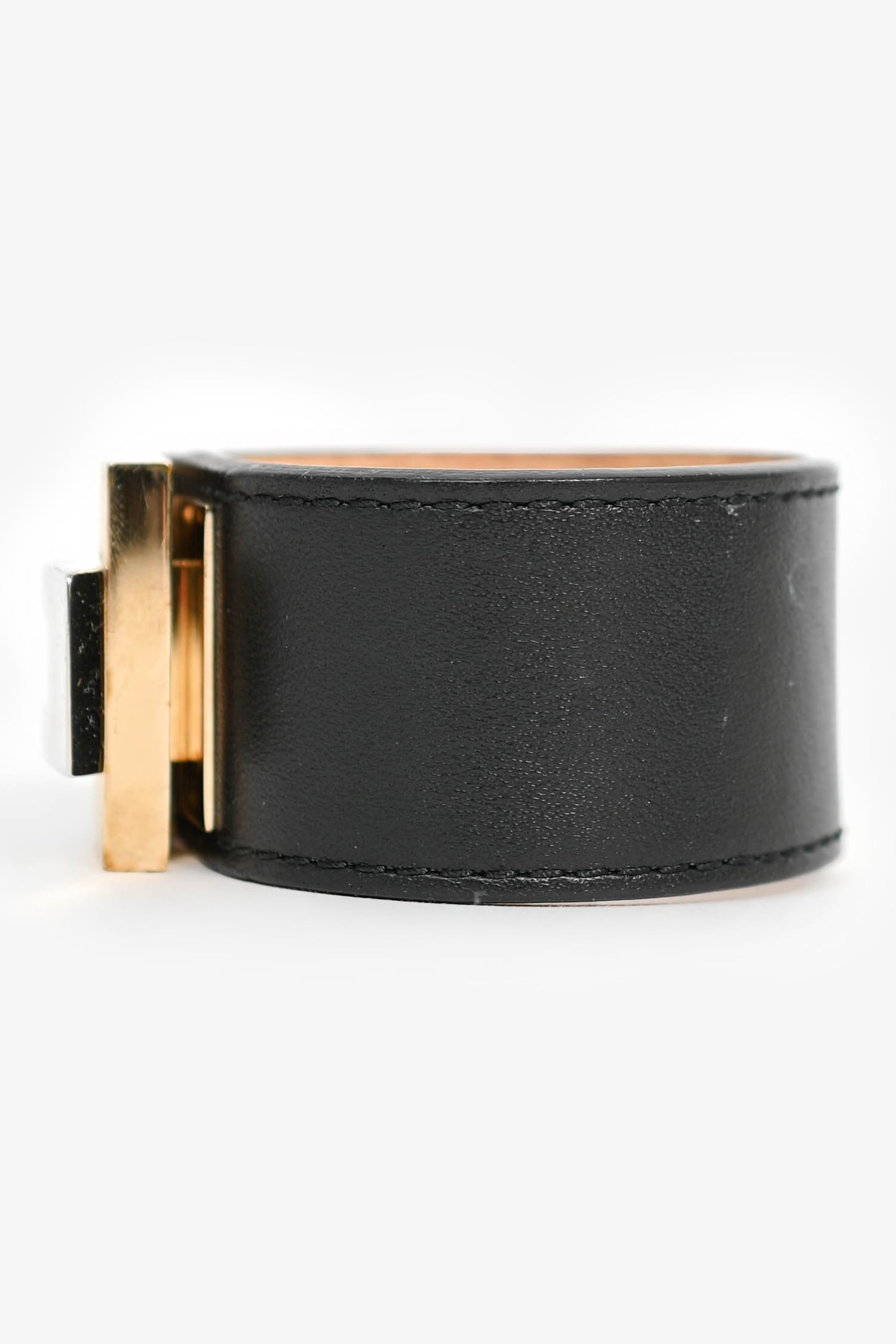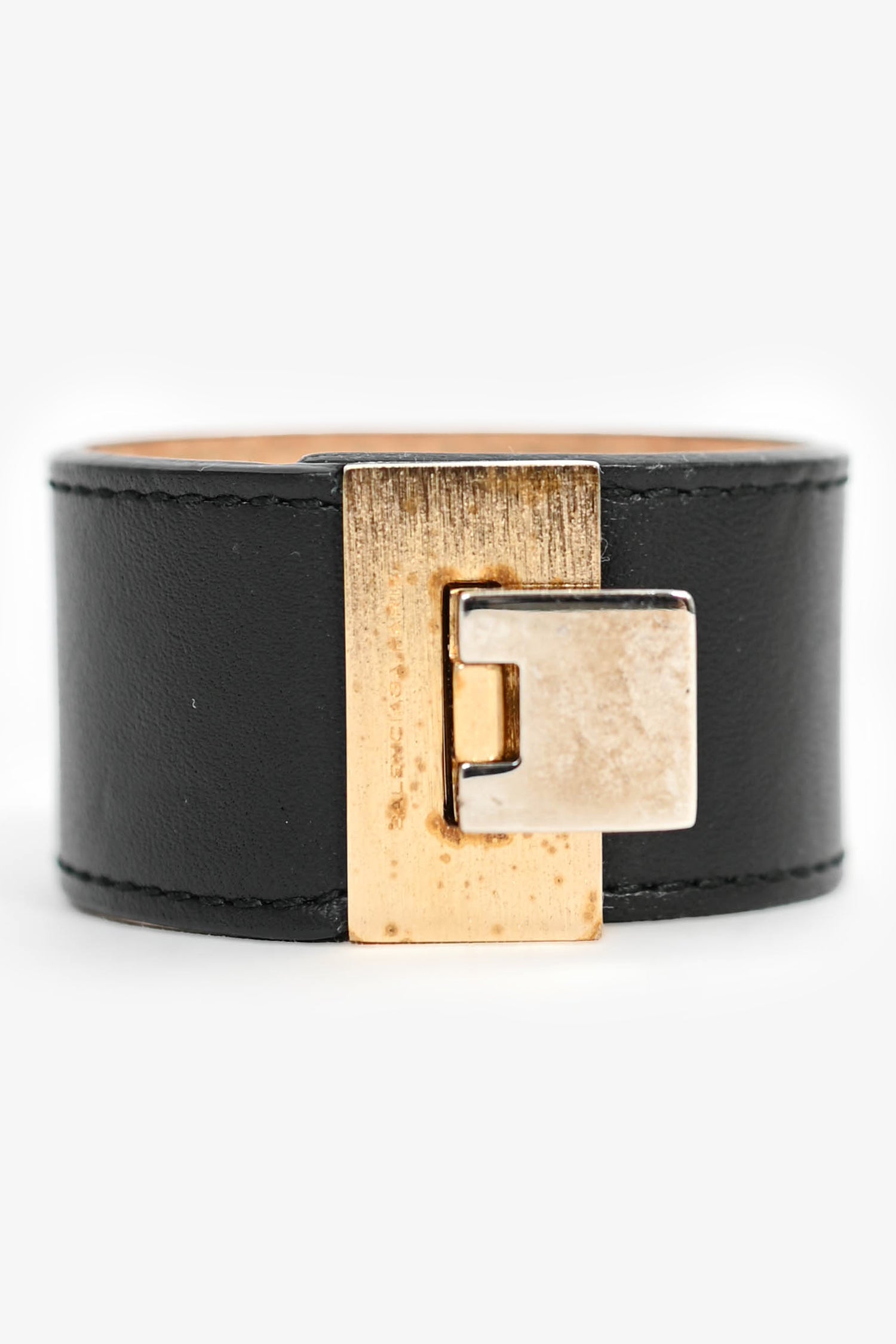 Refresh availabilityBalenciaga Black Leather Gold/Silver Toned Cuff Bracelet. Turn-lock closure.
