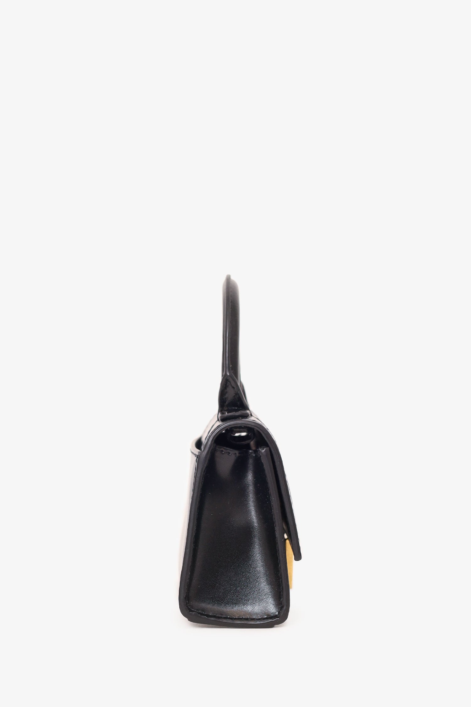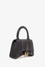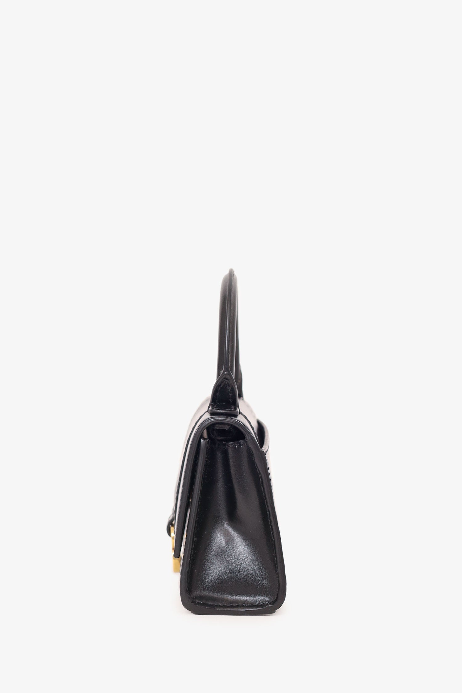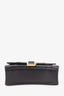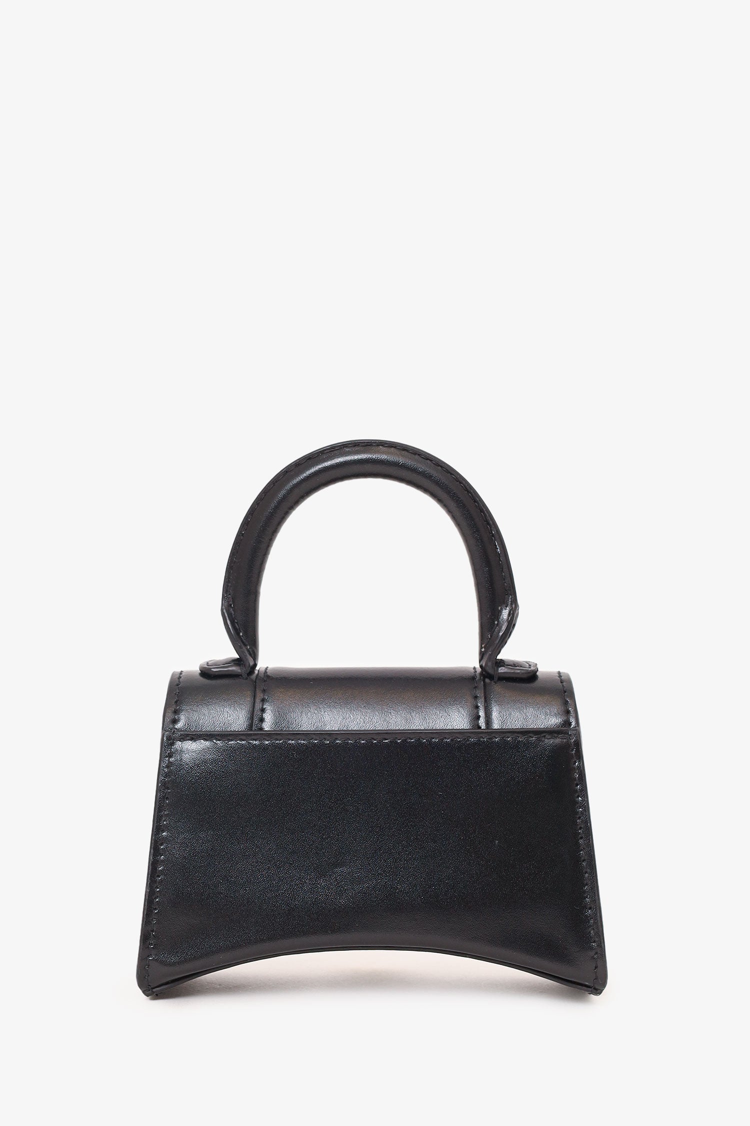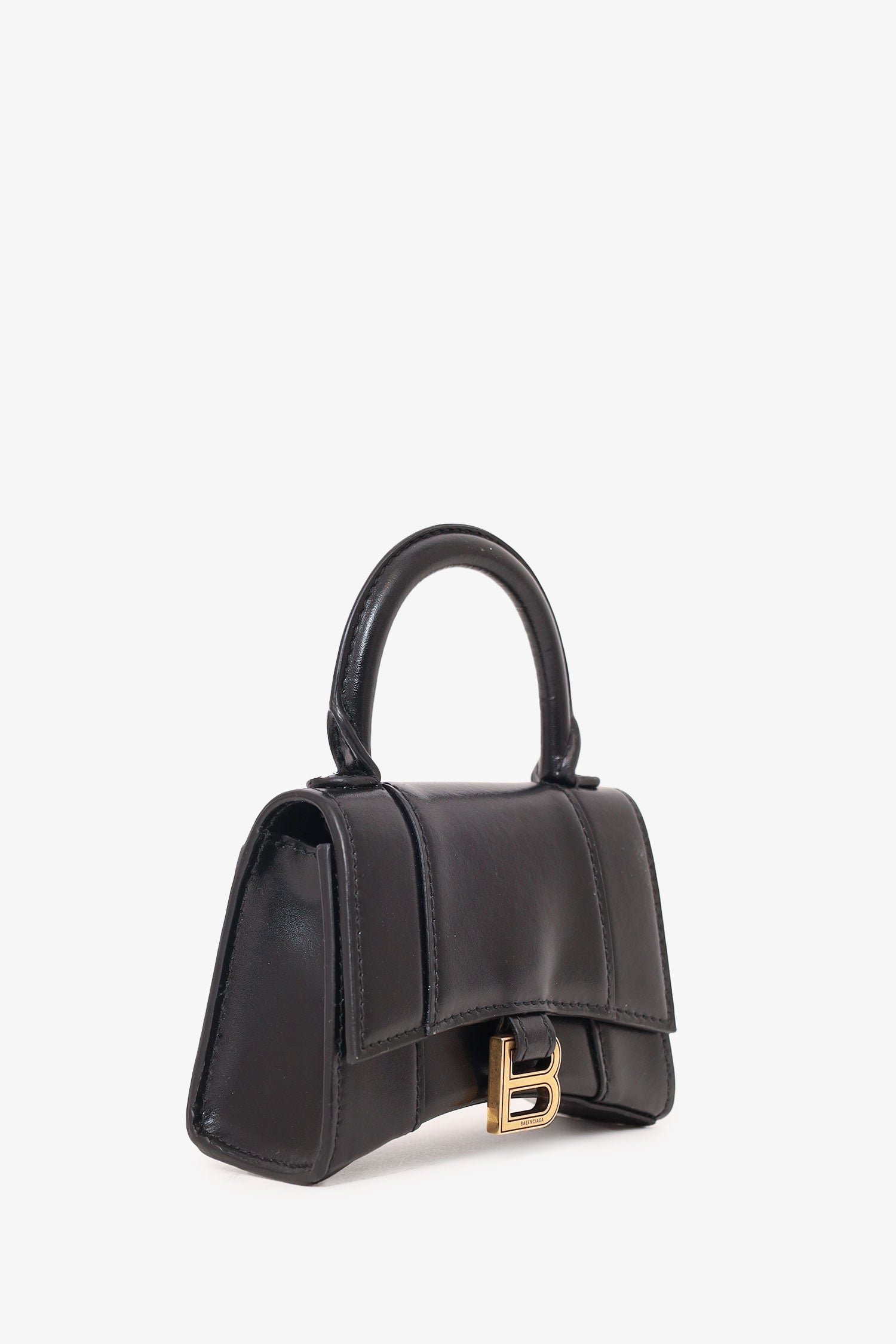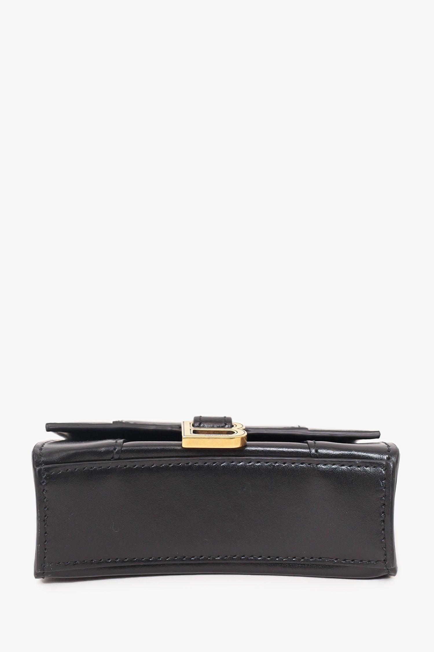 Refresh availabilityBalenciaga Black Leather Hourglass Belt Bag. Front fold-over flap with snap button closure. Adjustable pull through buckle closure crossbody strap. Top handle. Open interior with single wall slip pocket. Gold-tone hardware. Tonal stitching.