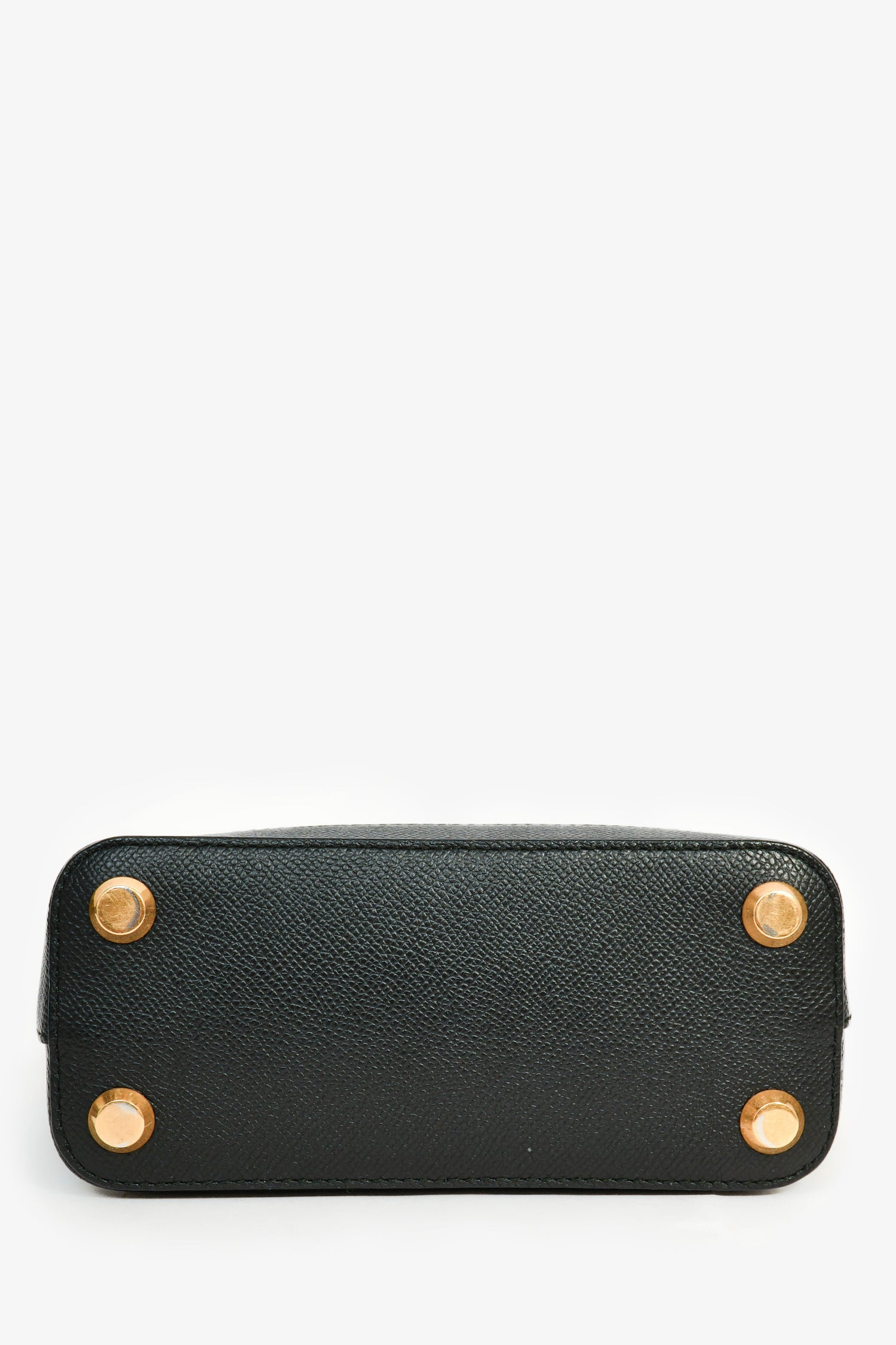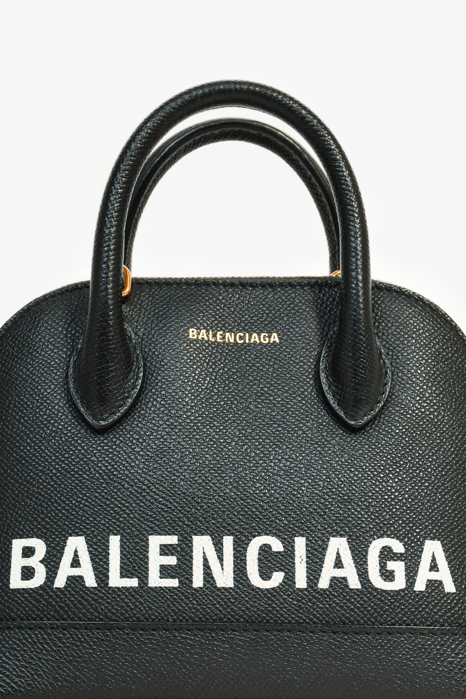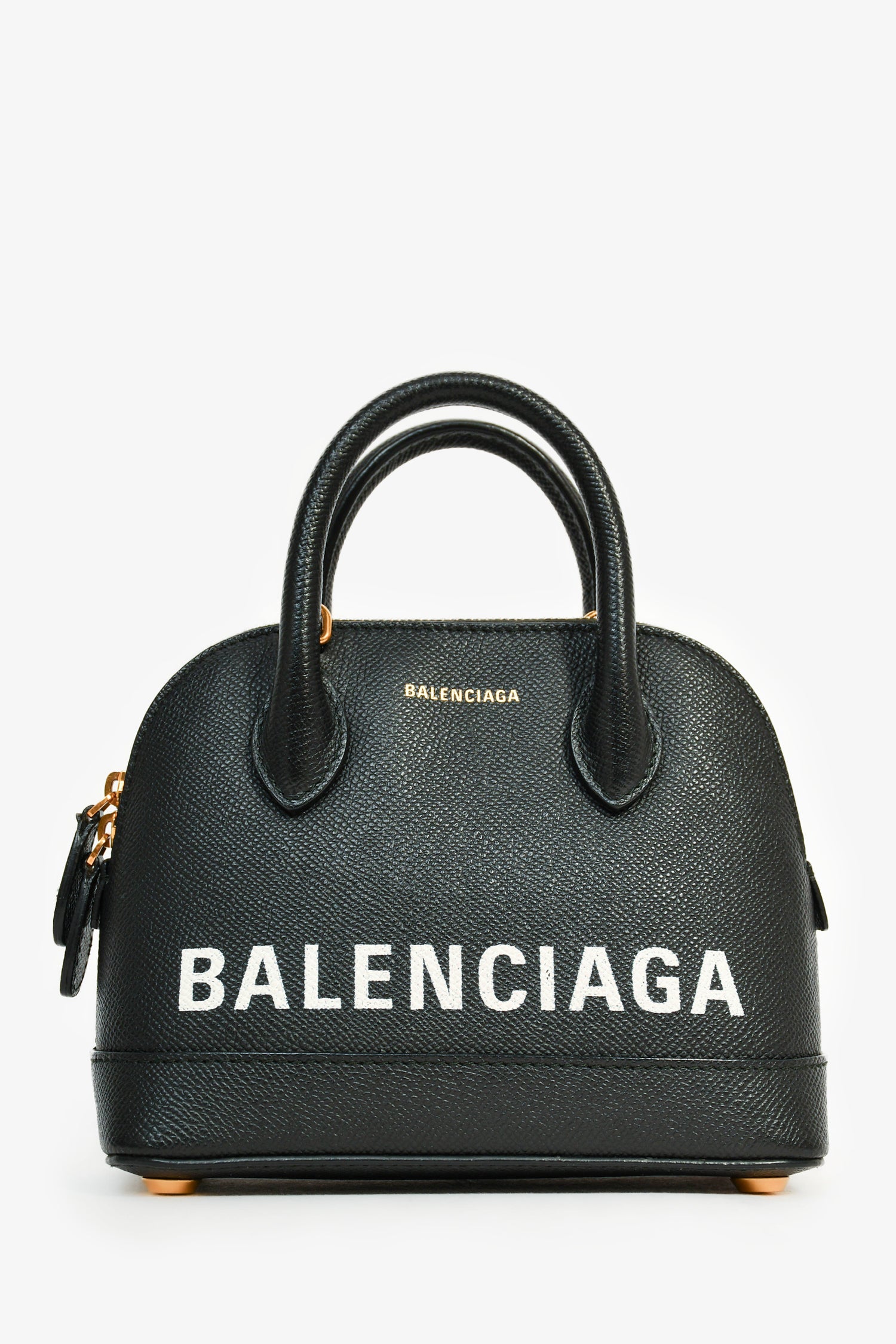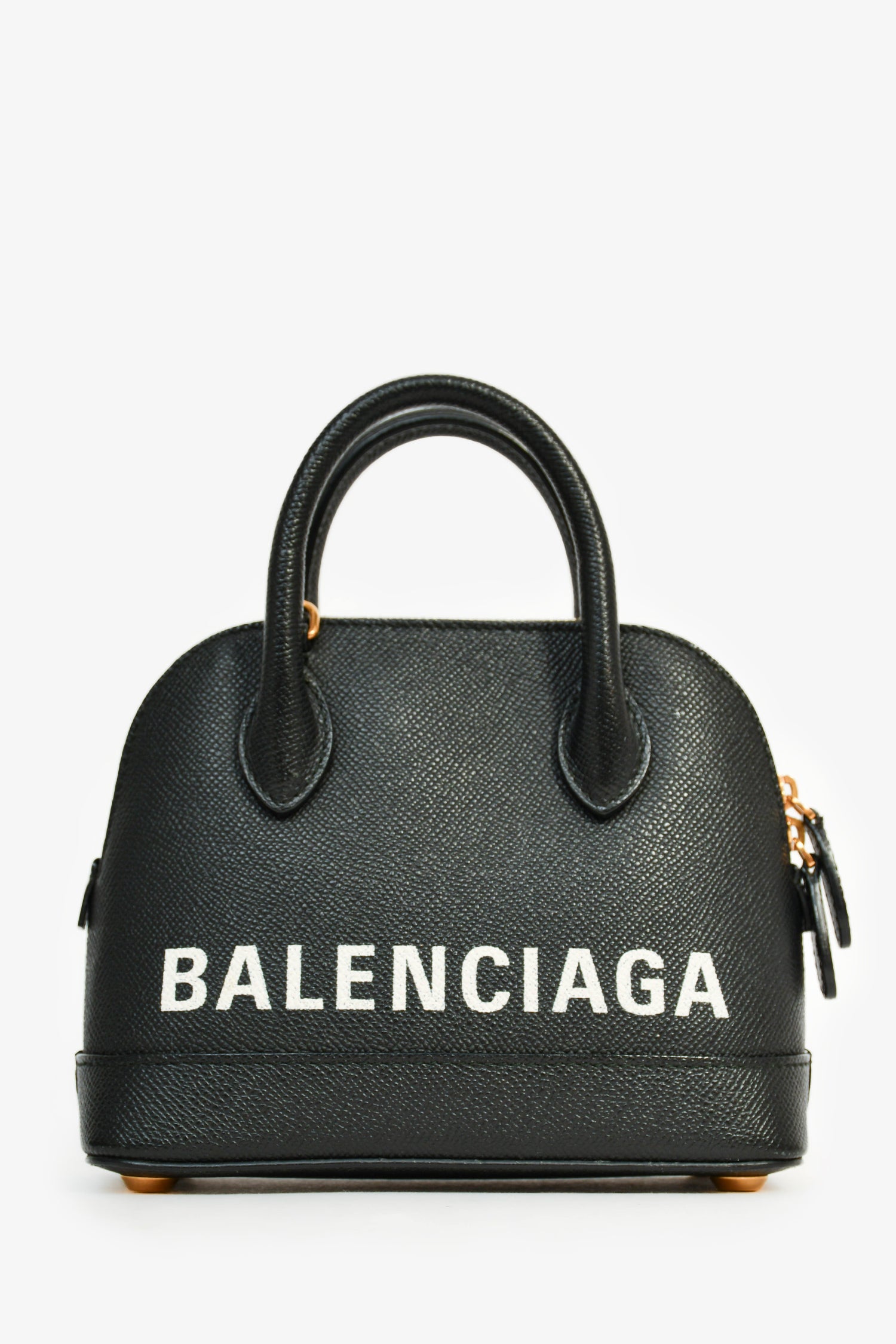 Refresh availabilityBalenciaga Black Leather Logo XXS Ville Leather Top Handle Bag. Rolled top handles. Gold-tone hardware. 2 slip interior compartments. Lined leather interior. Comes with a strap. Tonal stitching.