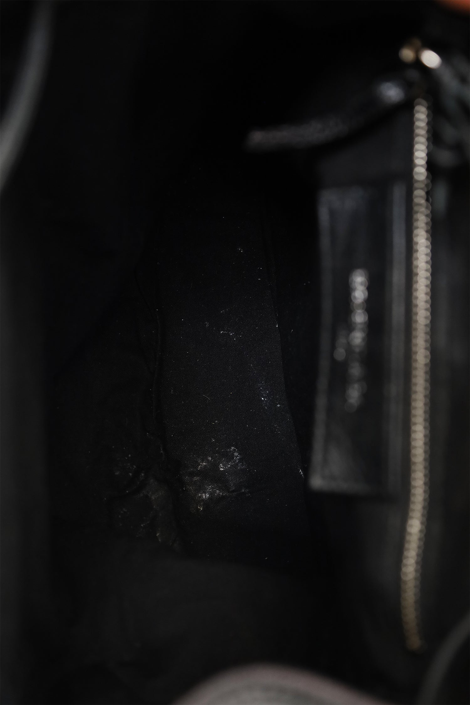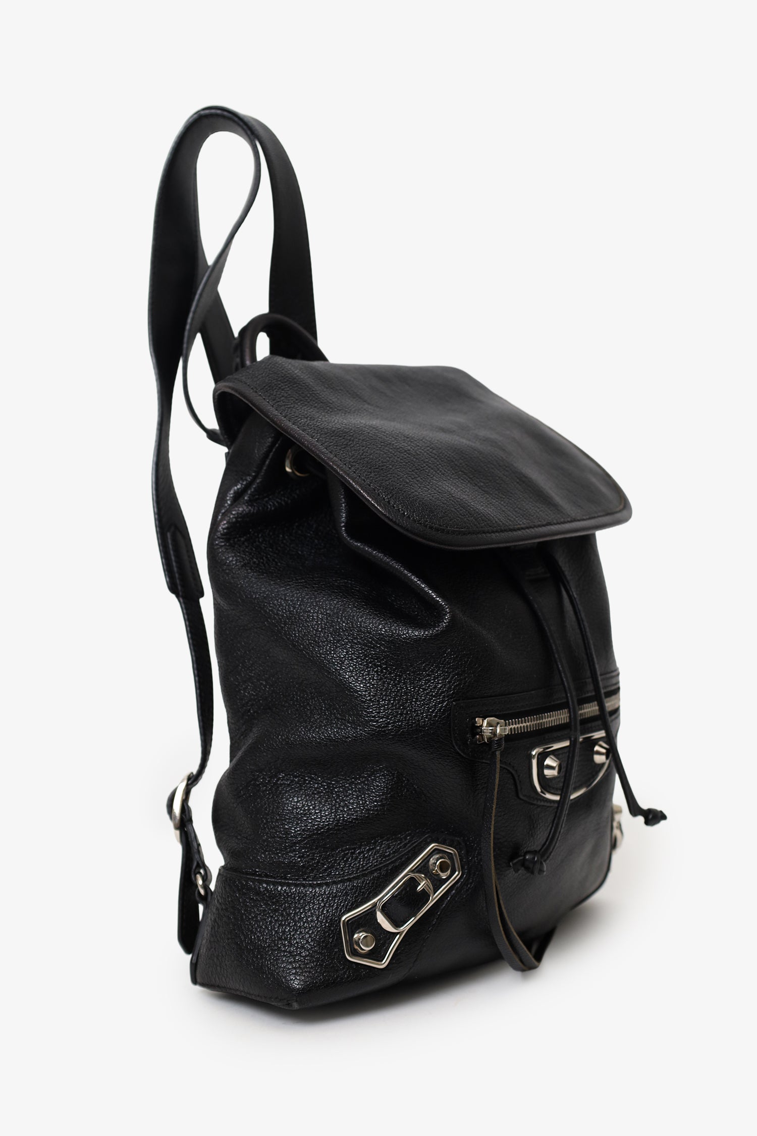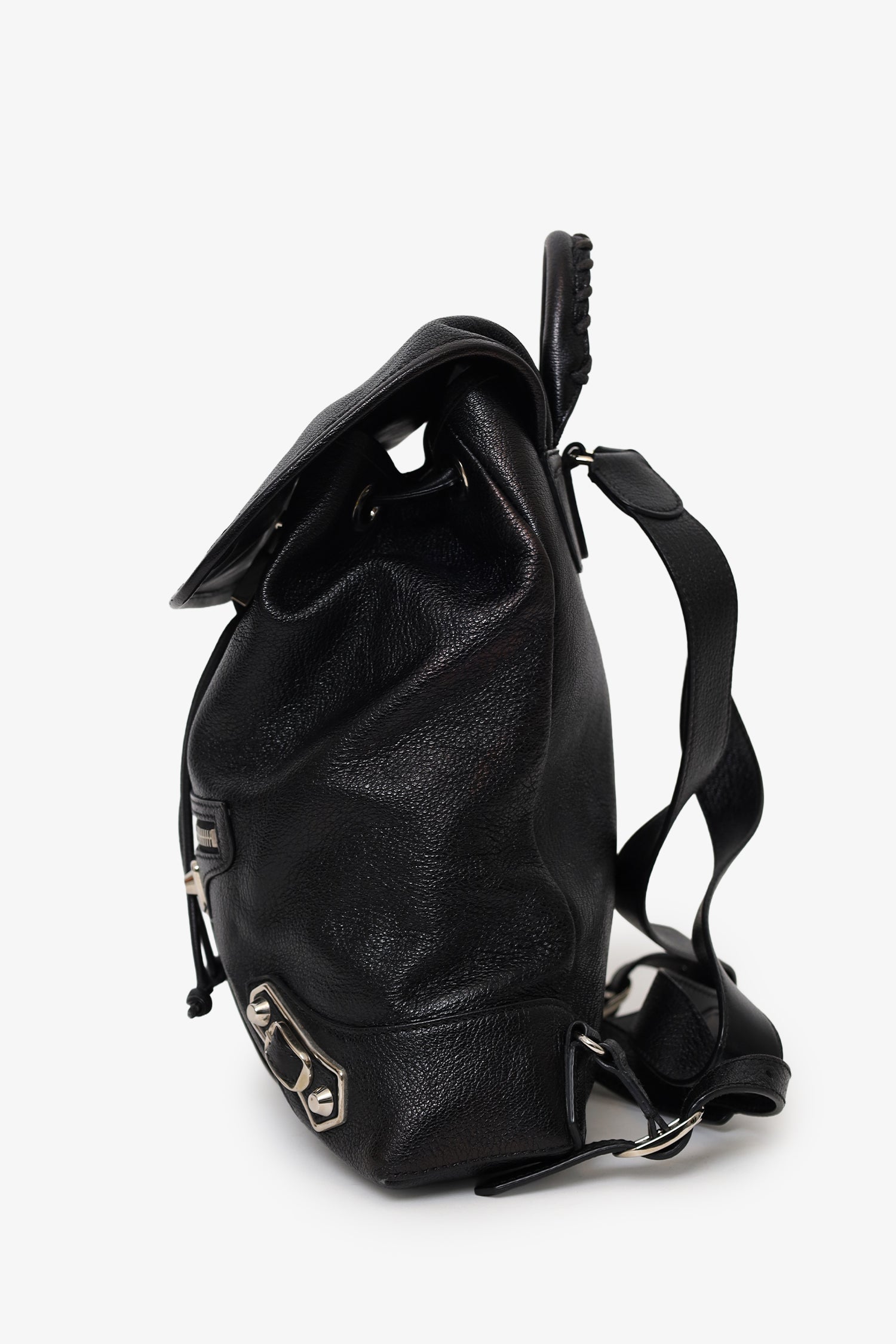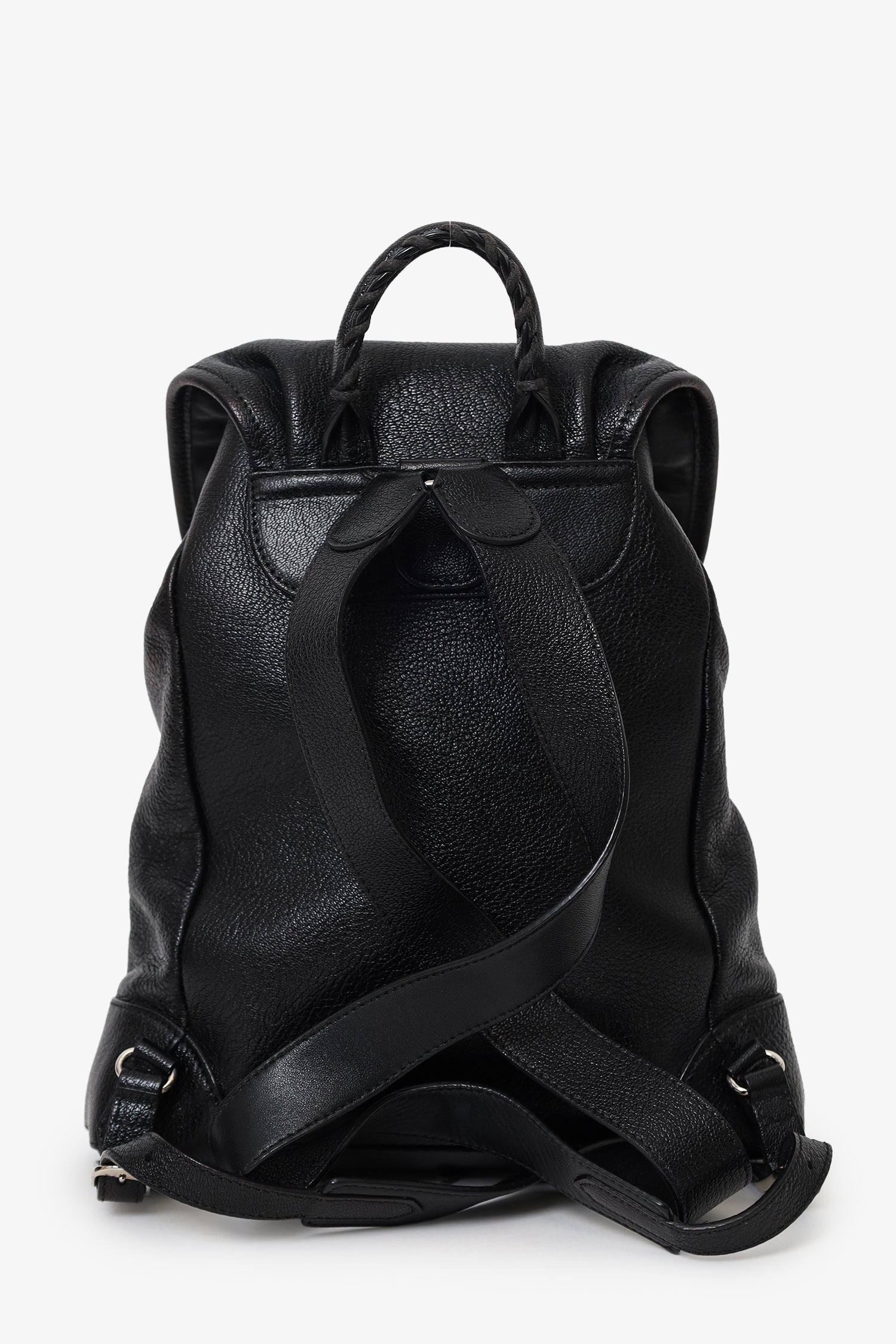 Balenciaga Black Leather Motocross Backpack. Front fold-over flap with buckle and cinch cord closure. Top handle. Rear back straps with adjustable pull-through buckle closure. Single exterior front zip-up pocket. Lined interior with single rear zip-up pocket. Additional removable mirror. Silver-tone hardware. Tonal stitching.