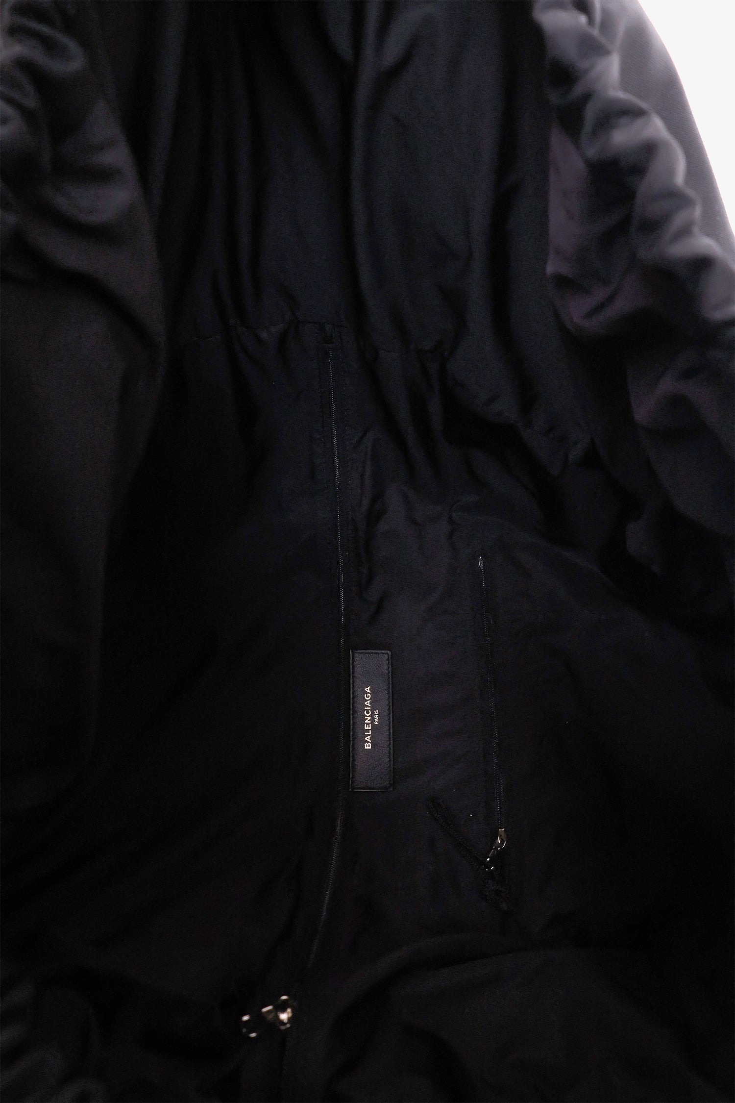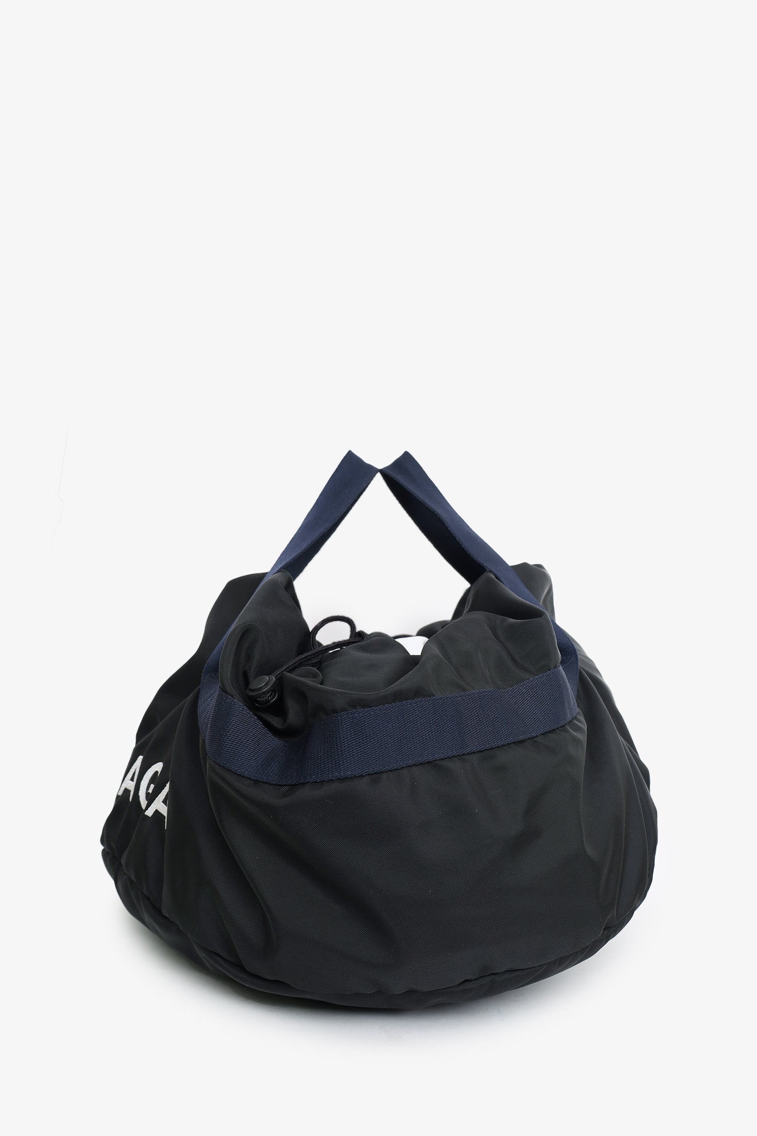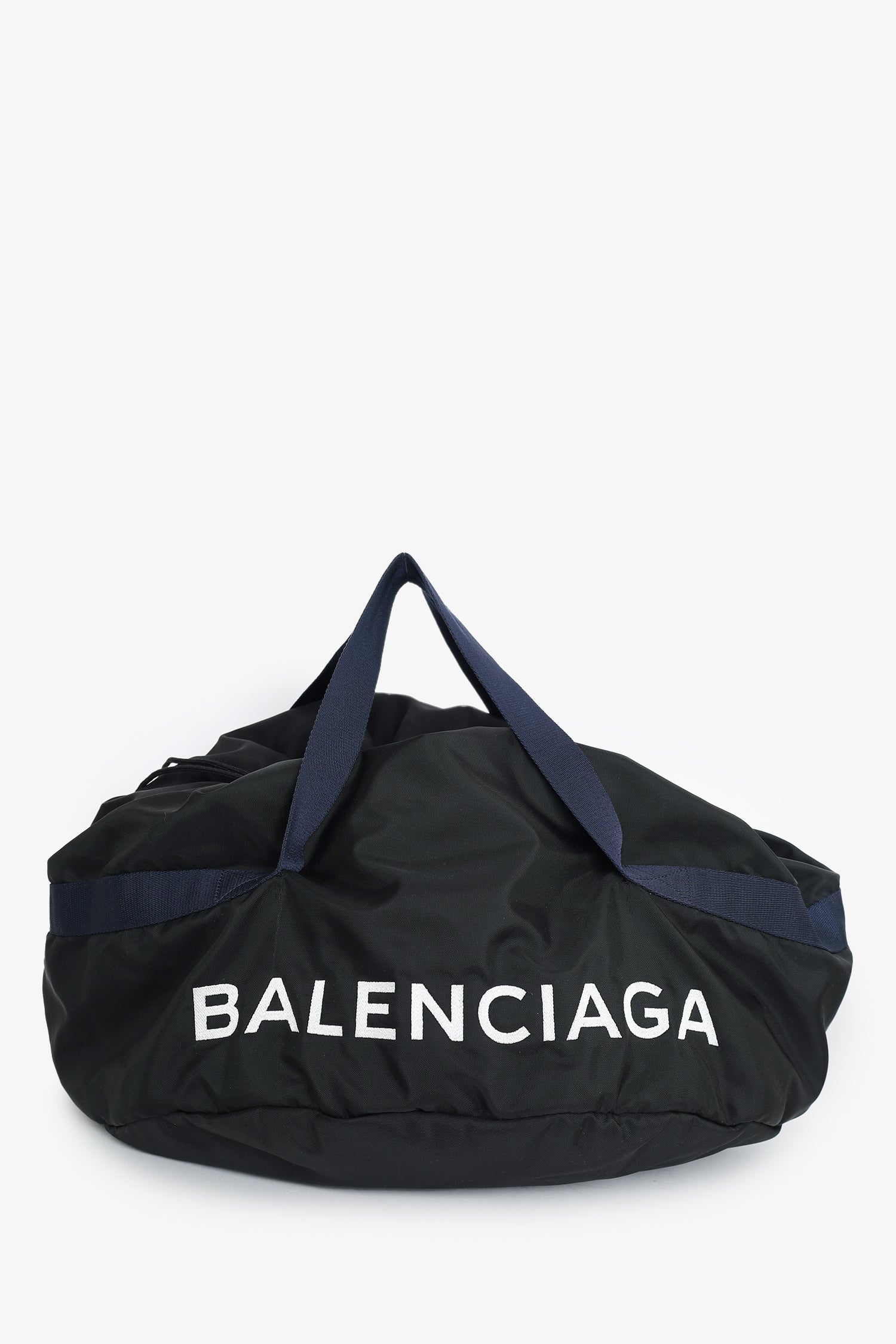Refresh availabilityBalenciaga Black Nylon Logo Embroidered S Wheel Gym Bag. Open top with 2 drawstring closures. 2 interior zip pockets. Tonal stitching.