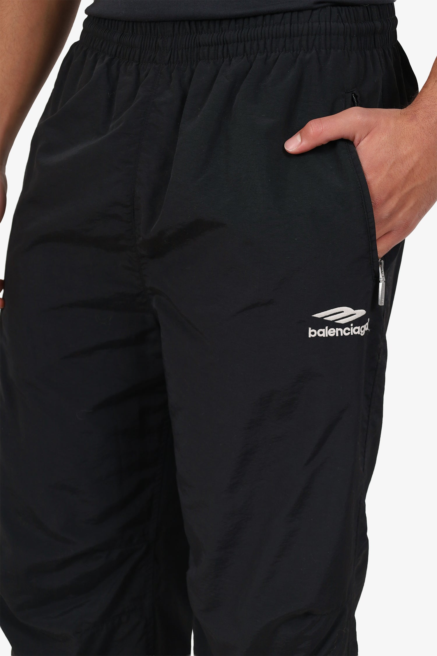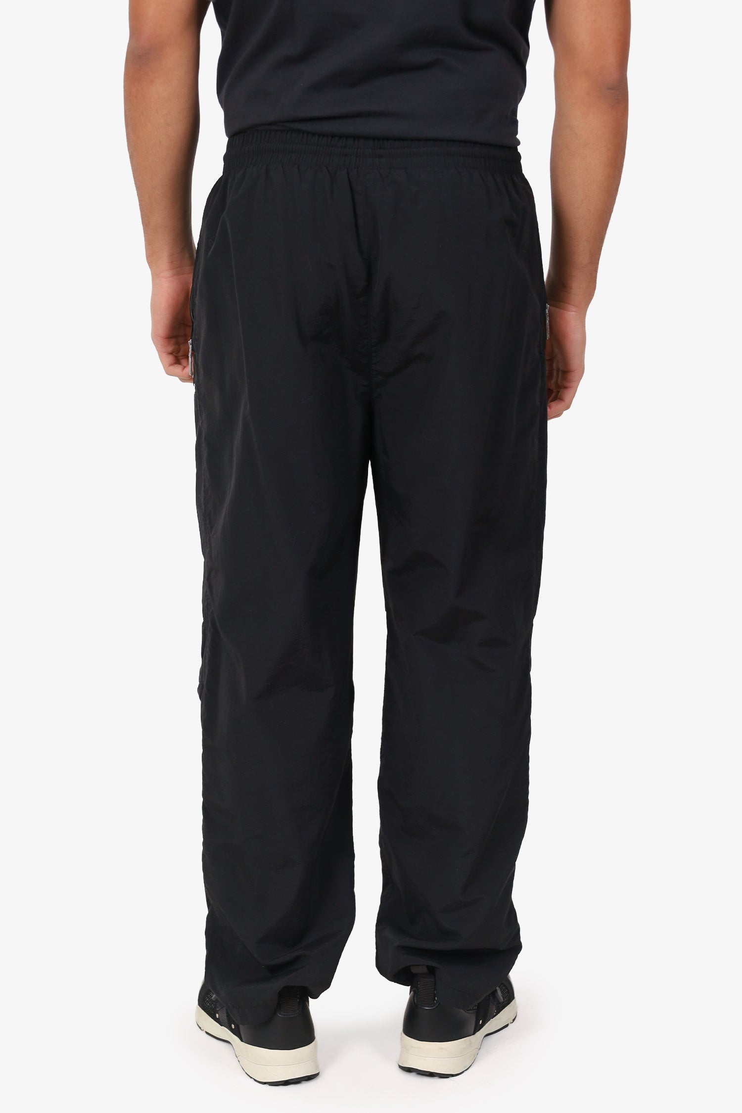 Refresh availabilityBalenciaga Black Nylon Logo Track Pants. Slip-on. Elasticated waistband. 2 exterior side zip pockets. Lined interior. Silver-tone hardware. Contrast and tonal stitching.